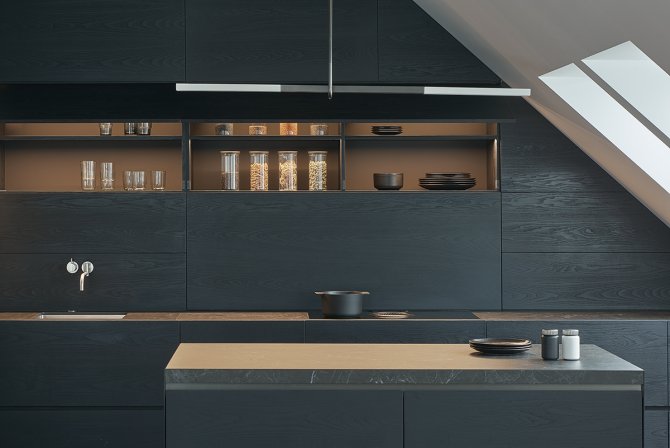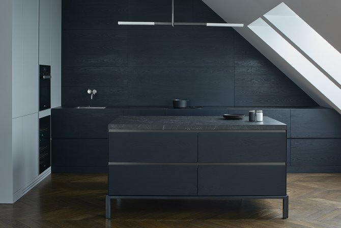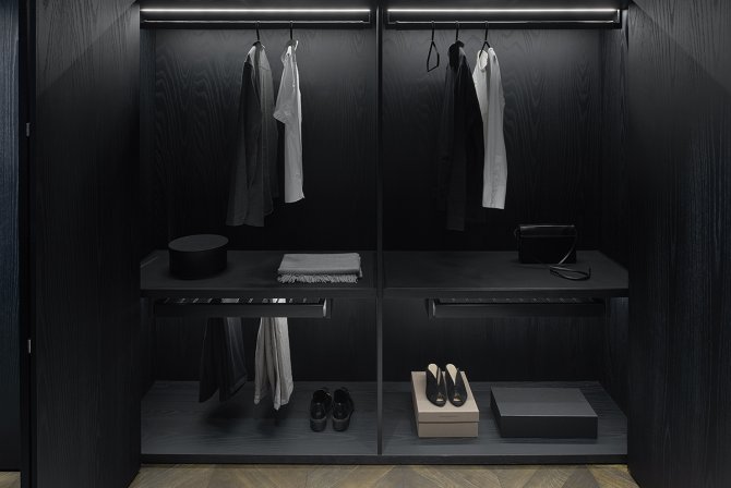 Erdvūs apartamentai Vilniaus senamiestyje buvo kuriami laikantis kelių esminių principų: išgryninta tūrinė forma, sprendinių ilgaamžiškumas, maksimalus natūralių apdailų panaudojimas. Erdvėse gausu natūralaus apšvietimo, todėl buvo pasirinkti tamsūs spalviniai tonai. Kontrastingos sienų plokštumos pabrėžia patalpų vidaus architektūrą, akcentuoja charakteringas šlaitinių lubų linijas. Juodo uosio faneruotė tampa tinkamu fonu dominuoti marmuro raštui, nerūdijančio plieno ir juodinto chromo detalėms.