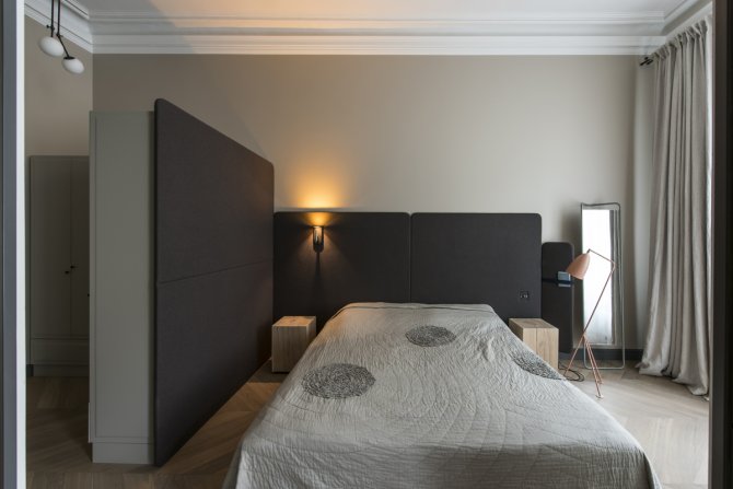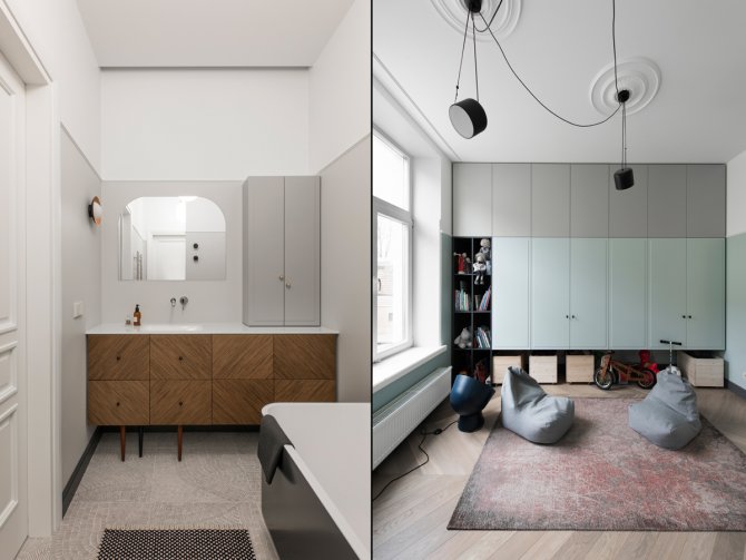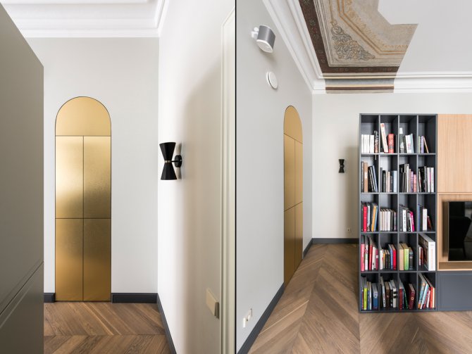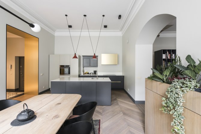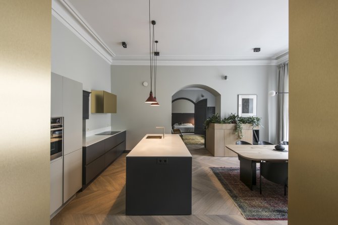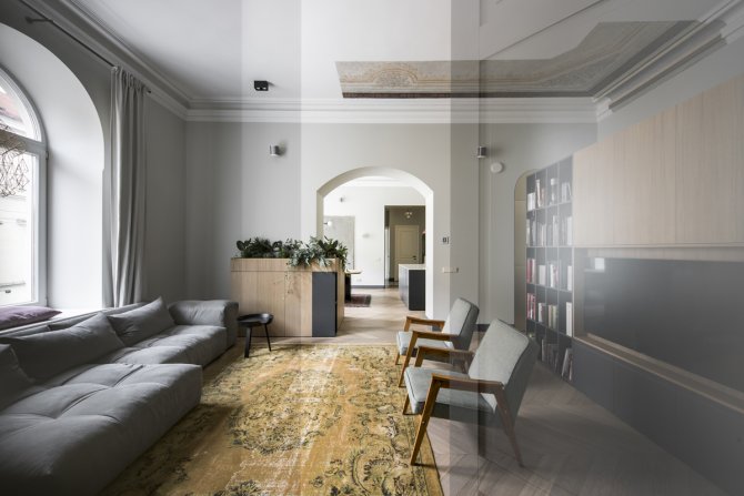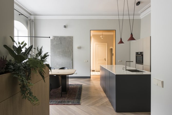 Kuriant interjerą buvo svarbu išsaugoti tai, kas išlikę gražiausio sena ir pritaikyti šiuolaikiniam patogiam gyvenimui, kad tai pasiekti teko prisitaikyti prie senamiesčio tipo erdvės – suplanuoti patogų judėjimą erdvėje. Kai kur atriboti erdves padėjo baldai-sienutės, kurie ir suformavo patogius judėjimo maršrutus bei tapo pagrindiniu namų akcentu, pagrindiniam apšvietimui išnaudotos senų išlikusių lubų puošybinių apvadų nišos. Remonto metu rasta sena niša prikelta naujam gyvenimui ir išnaudota papildomam pasidėjimui. Interjeras kurtas kontrasto principu – seno ir naujo stilių mišinyje, įnešant daugiau modernumo, suteikiant savitumo bei maksimaliai išsaugant tas kas sena.