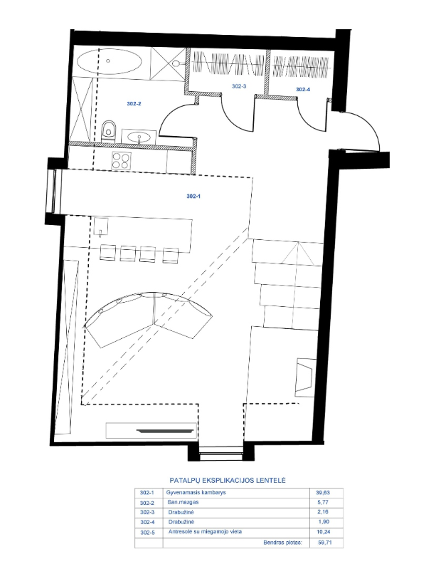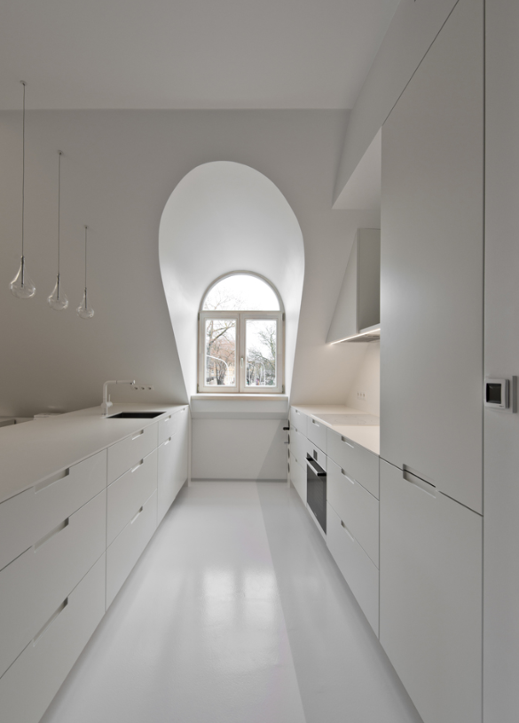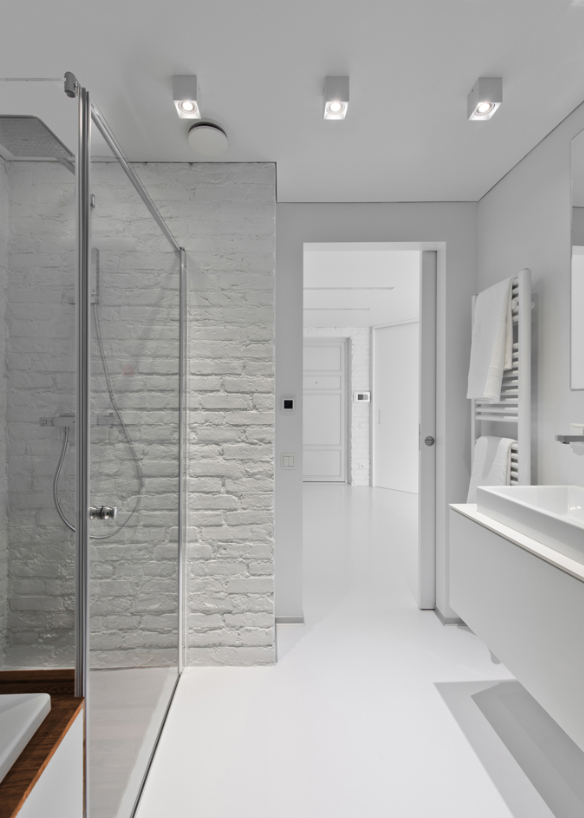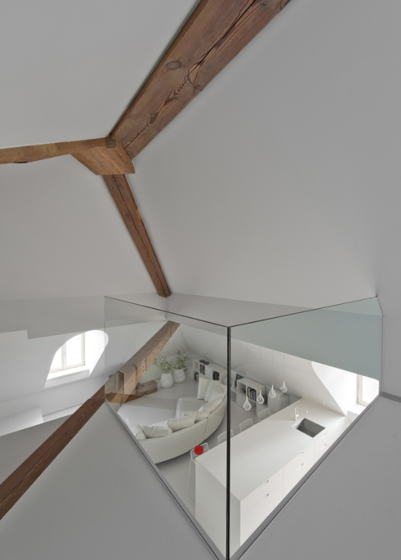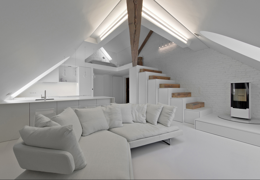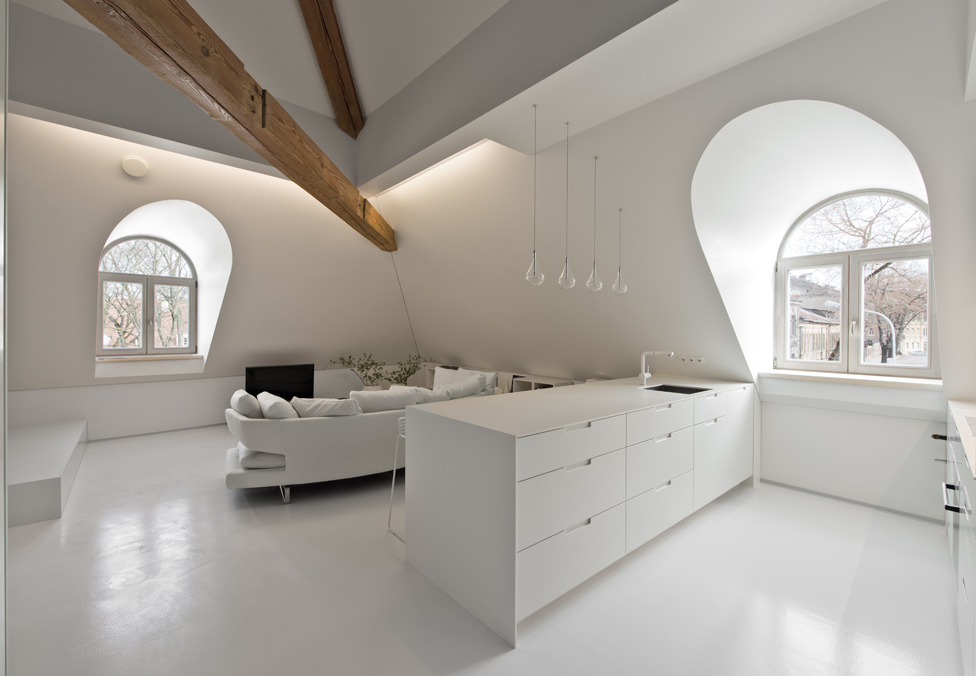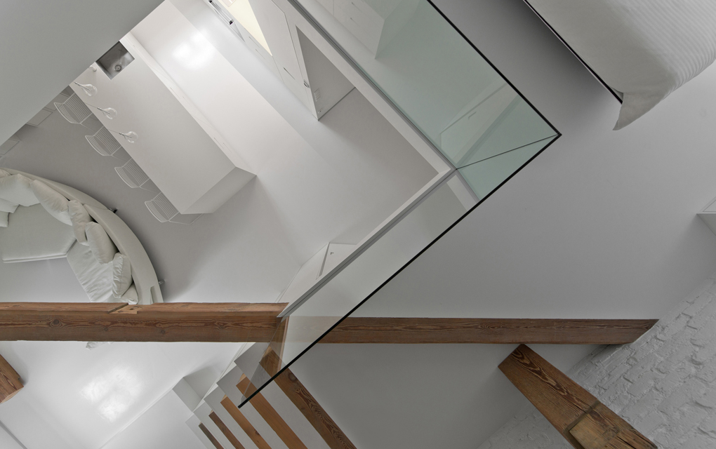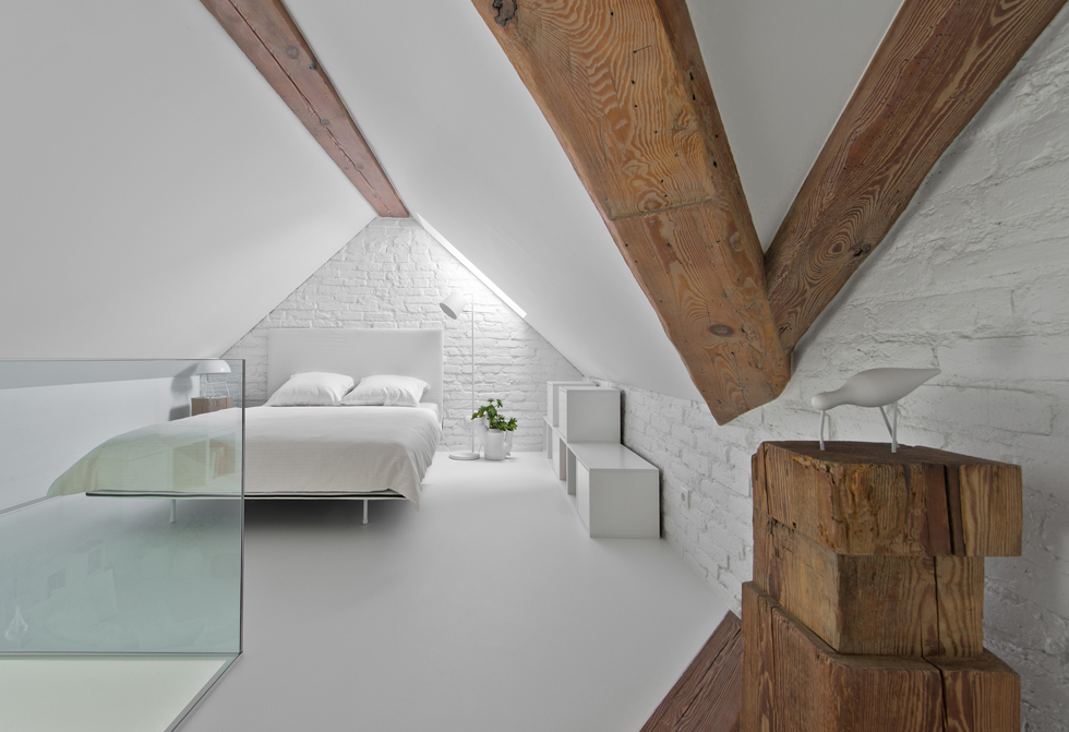 Interjere naudotas tik vienas baltos spalvos atspalvis- RAL 9003. Toks sprendimas pasirinktas norint suvienodinti ir apjungti sudėtingą patalpos geometriją, erdvėje sudaryti didesnį natūralios šviesos įspūdį. Interjere dominuoja griežtų, modernių, geometrinių formų ir seno natūralaus spygliuočio medžio dermė. Šis į patalpas atkeliavo išardžius seną kaimo trobėsį. Tai nedideli apartamentai su atvira miegamojo antresole, skirti trumpalaikei nuomai.