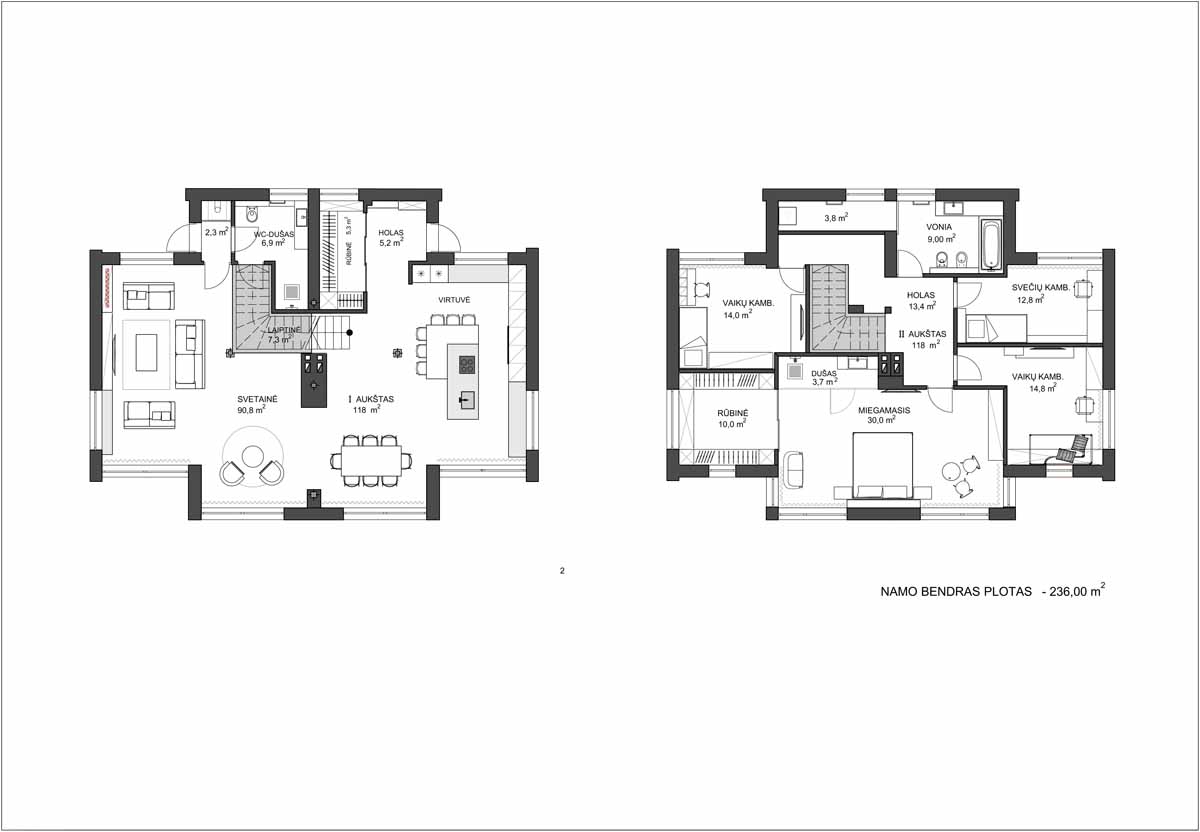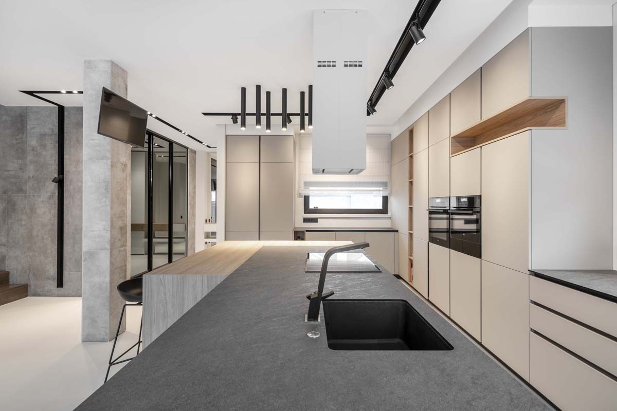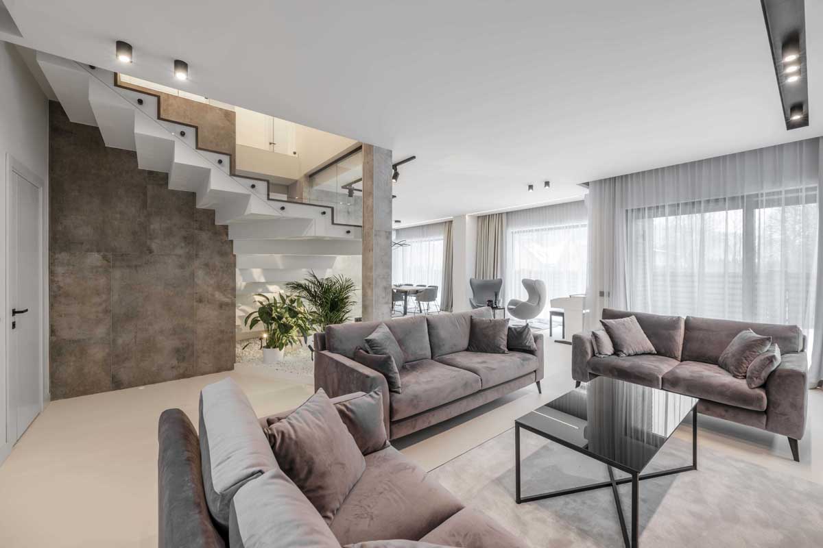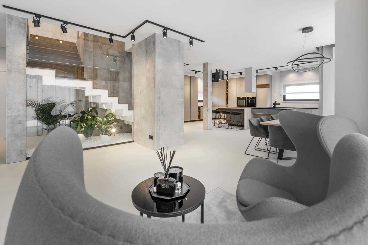 Svarbiausia užduotis, atliekant šį darbą, buvo du sublokuotus kotedžus paversti komfortiškais jaunos šeimos namais. Teko padirbėti prie plano, apjungiant dviejų namų erdves į vientisą, pritaikant jį keturių asmenų šeimos poreikiams. Spalvinį interjero sprendimą savaime padiktavo pats apdailos medžiagų parinkimas. Interjere vyrauja betonas, stiklas, medis.