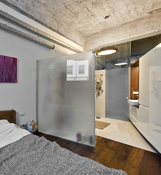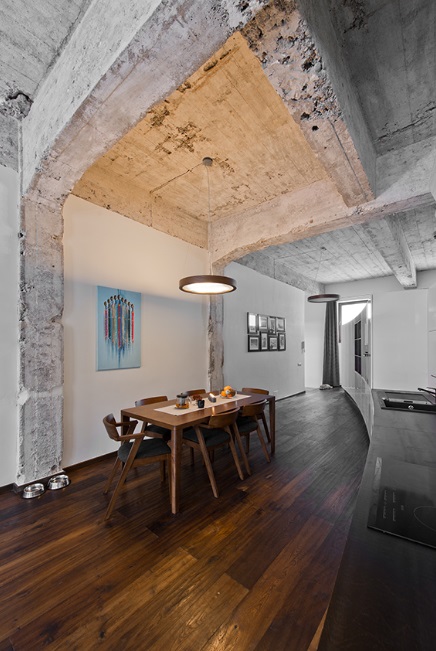 Apsprendžiant erdvės medžiagiškumą, buvo atsižvelgta į stiprų charakterį turinčią betoninę konstrukciją. Ji pasirodė labai patraukli, tik kiek laukinė, todėl kaip atsvara buvo pasirinkta stipri ir išraiškinga grindų danga. Sodrus medžio grindų paviršius su dinamiška faktūra harmoningai kalbasi su betonu. Kiti paviršiai pasirinkti neutralios spalvos. Vienintelės pertvaros skiriančios tualeto patalpą nuo erdvių – stiklinės, skaidrios, žemutinėje zonoje – matinės.