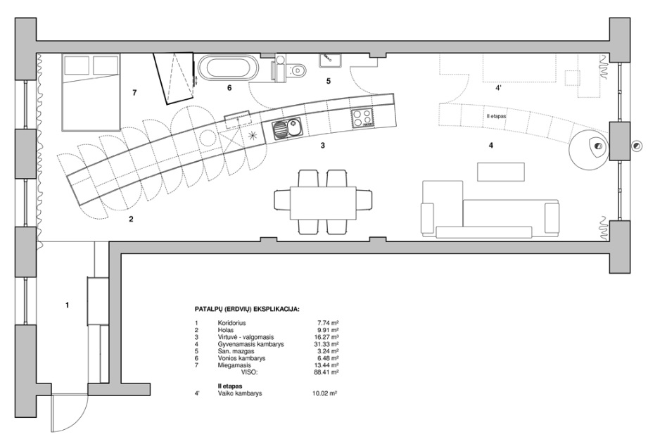 Užduotis buvo tokia: tarp keturių sienų turėtų apsigyventi jauna dviejų asmenų šeima, o šeimai pagausėjus turėtų būti numatyta galimybė įrengti kambarį vaikui.