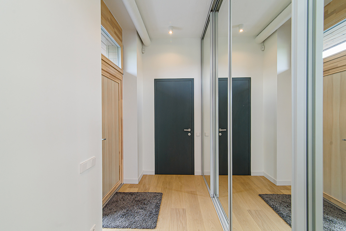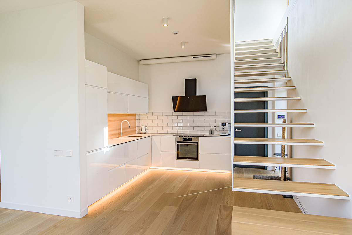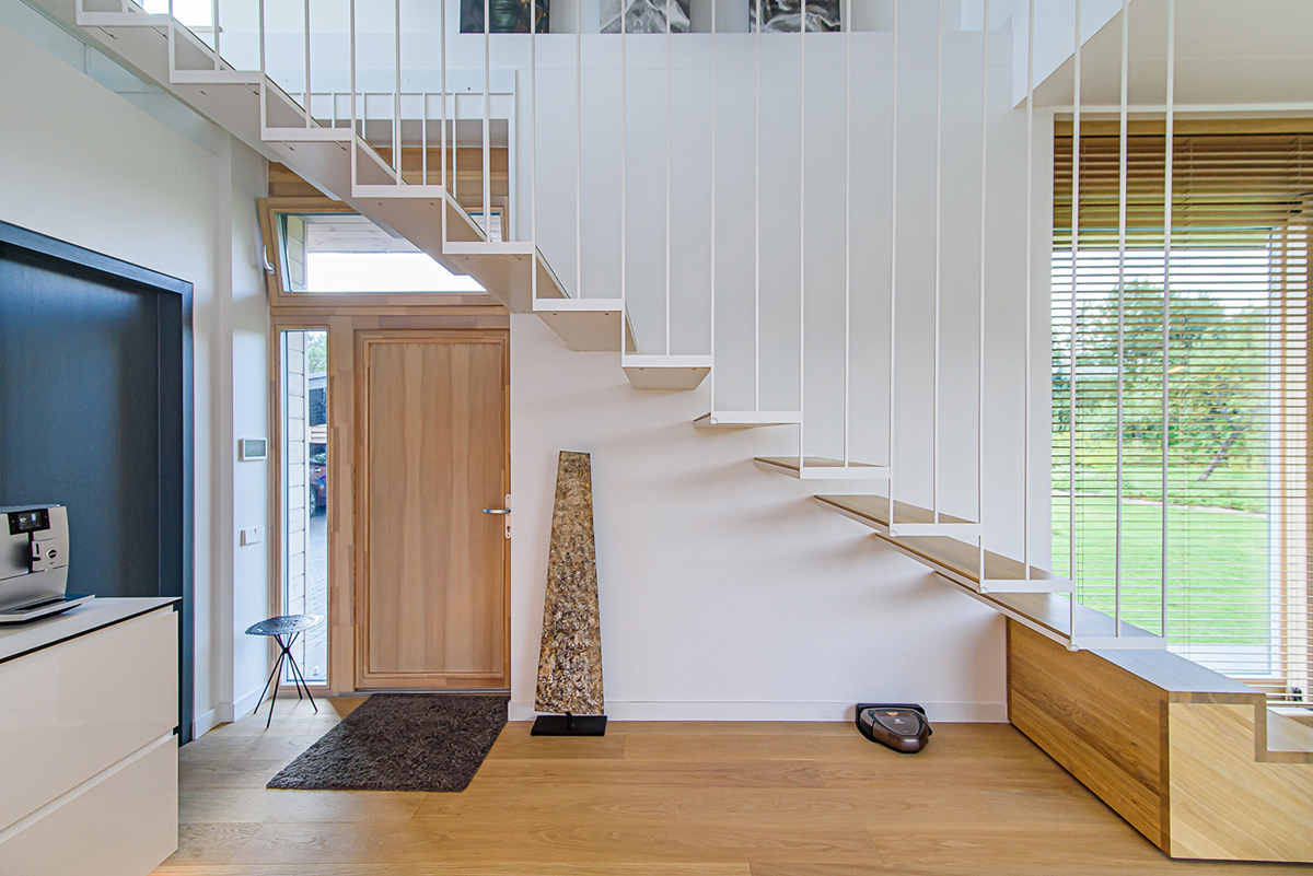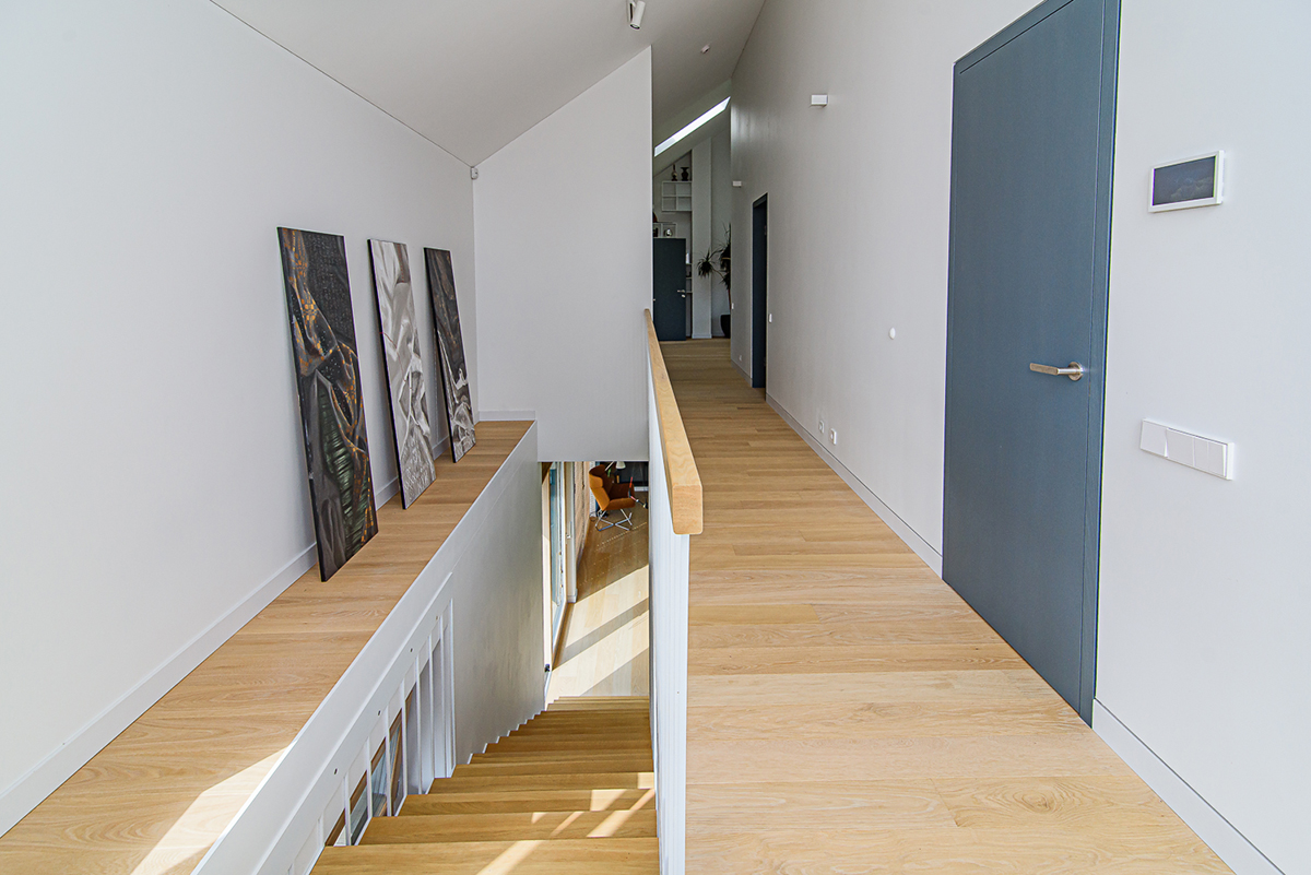 Lakoniškas, funkcionalus ir erdvus interjeras, tik su reikalingų daiktų aplinka. Namo ir interjero atsiradimas įkvėptas Neries upės vaizdais ir nesustojančio tekėjimo stebėjimu.