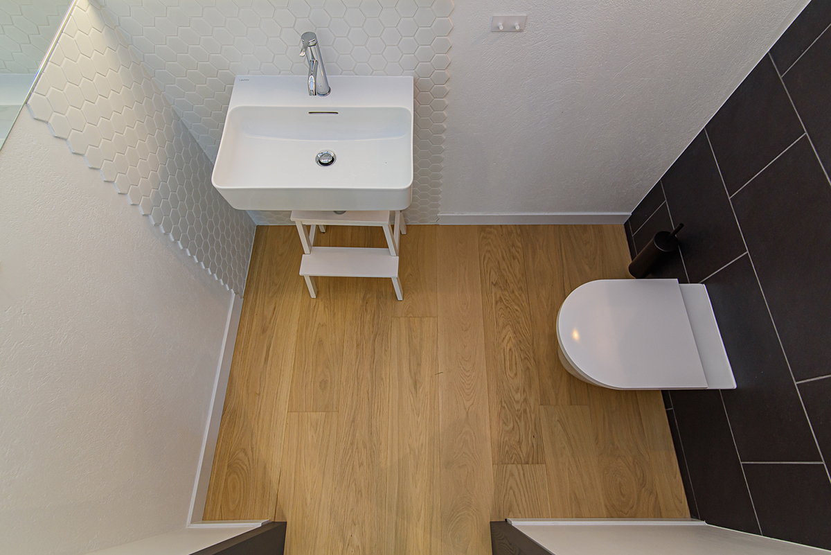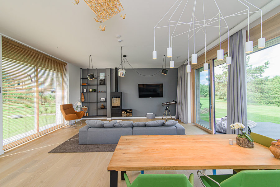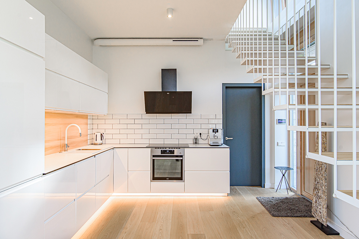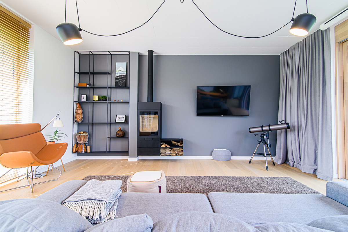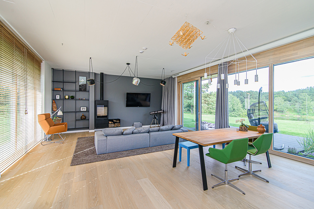 Lakoniškas, funkcionalus ir erdvus interjeras, tik su reikalingų daiktų aplinka. Namo ir interjero atsiradimas įkvėptas Neries upės vaizdais ir nesustojančio tekėjimo stebėjimu.