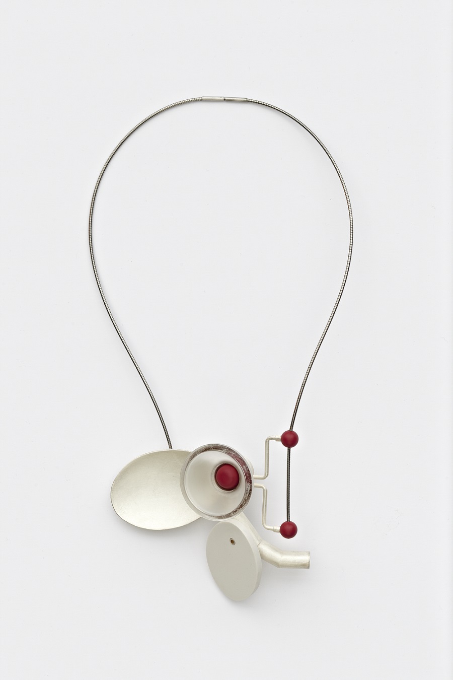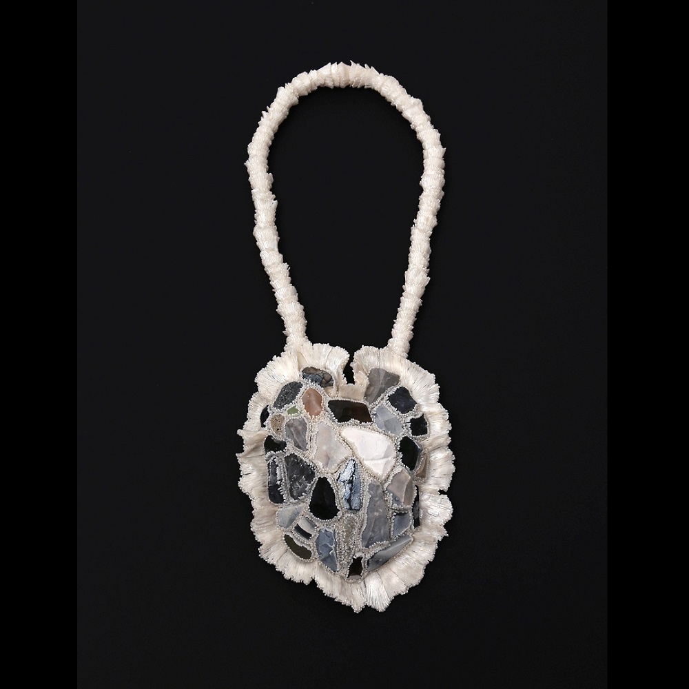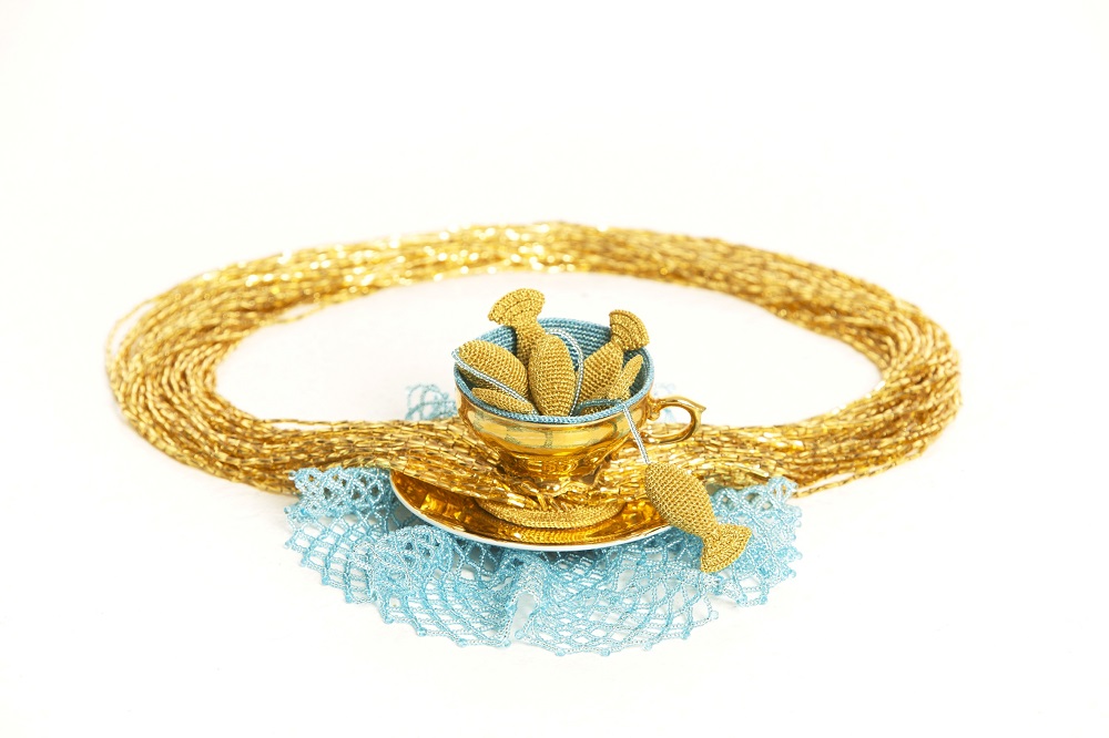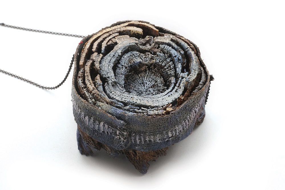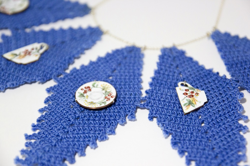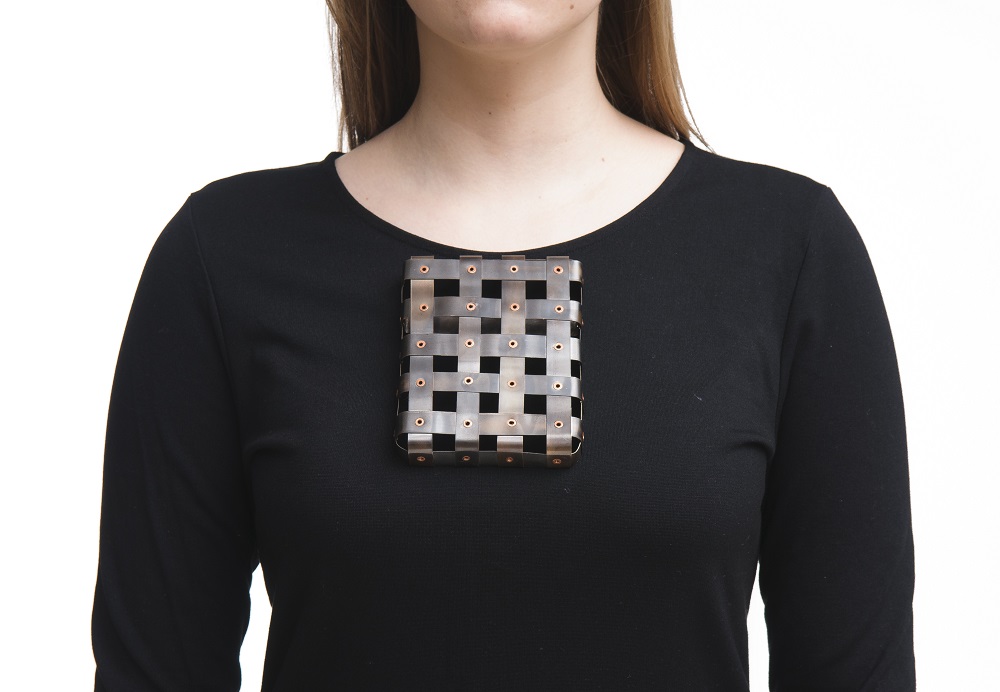 Gintarė Janulaitytė (LT) | „Nekintantys mano senelių namai“, kaklo papuošalas, 2019, sidabras, varis, emalis, nerta servetėlė.