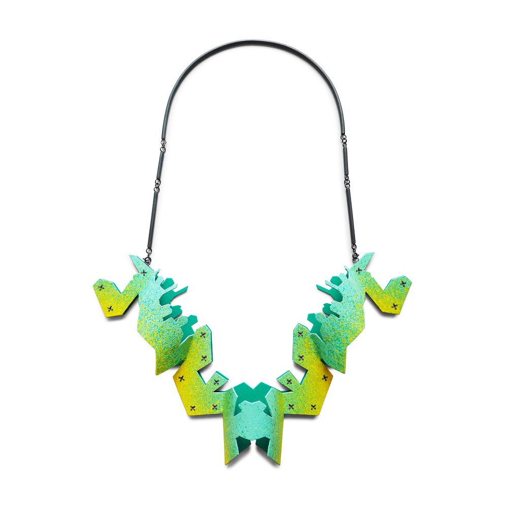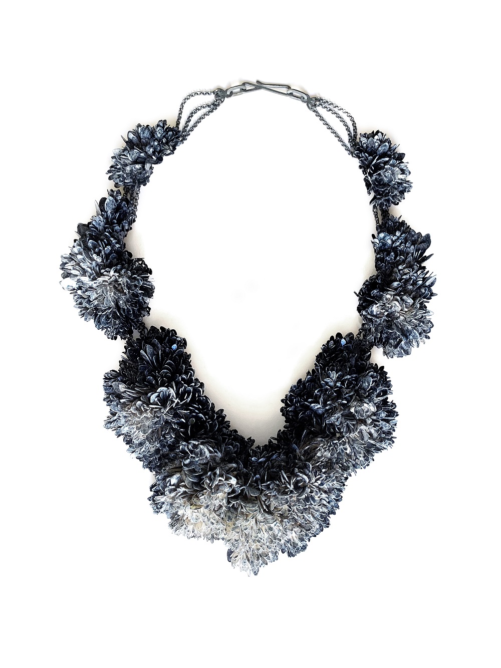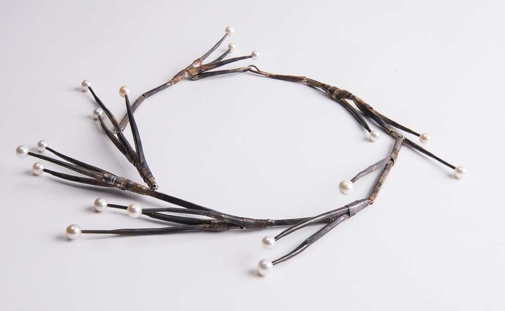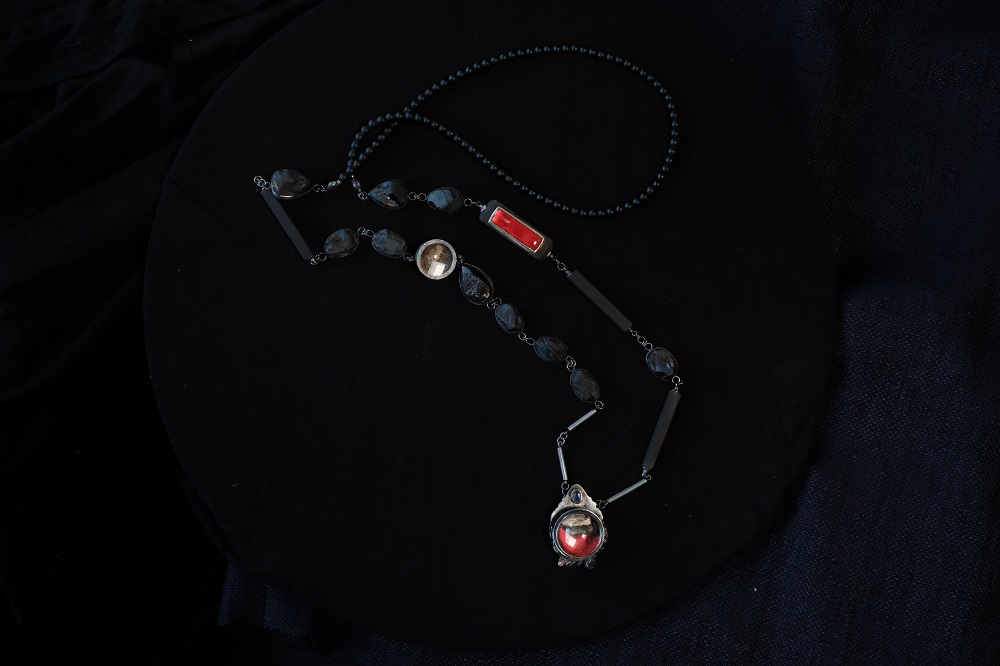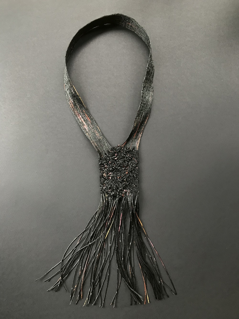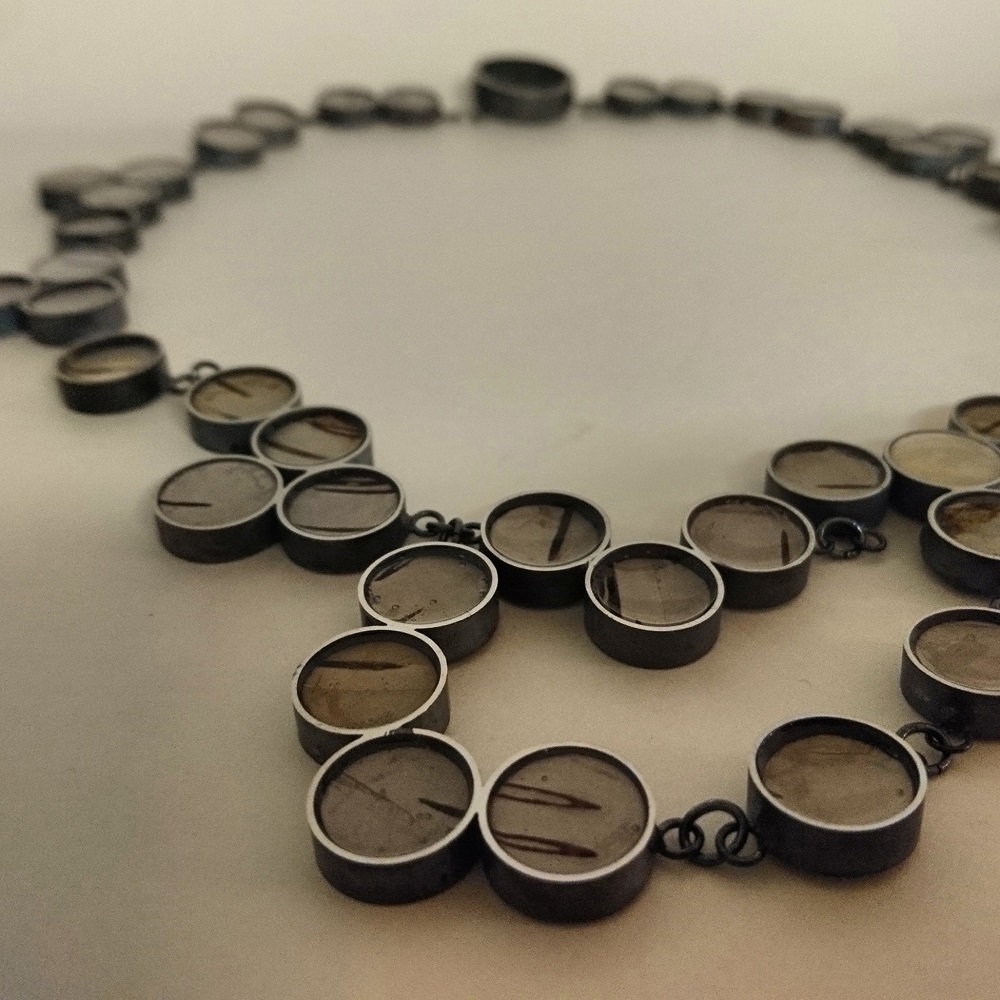 Gintarė Janulaitytė (LT) | „Nekintantys mano senelių namai“, kaklo papuošalas, 2019, sidabras, varis, emalis, nerta servetėlė.