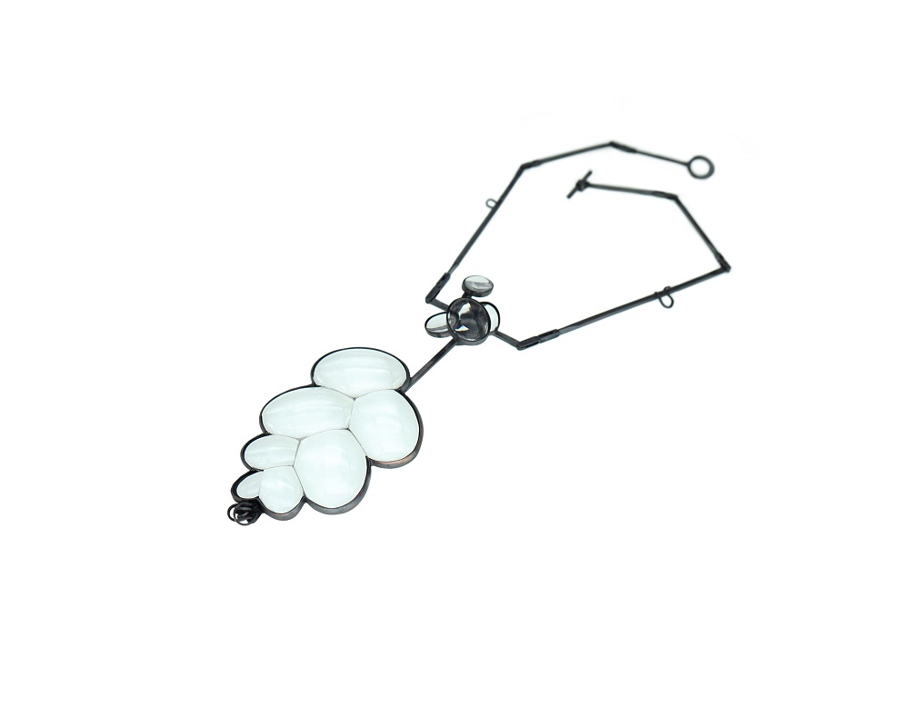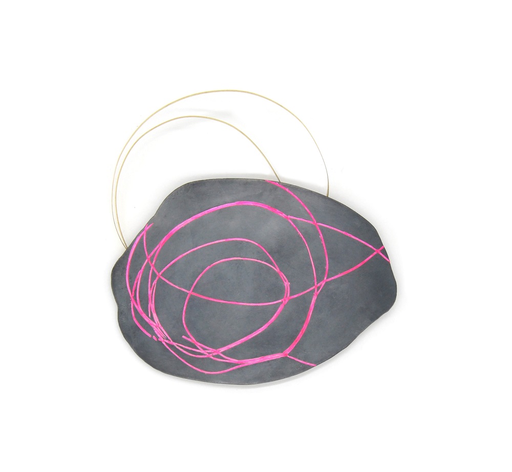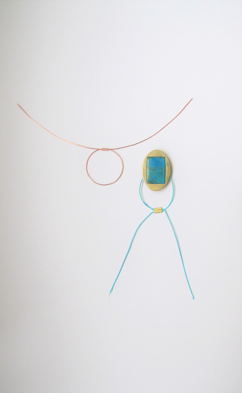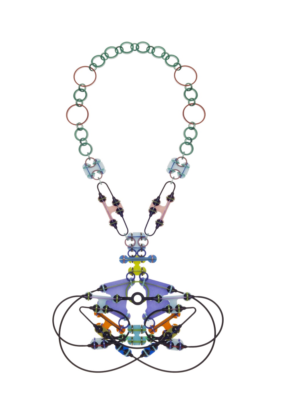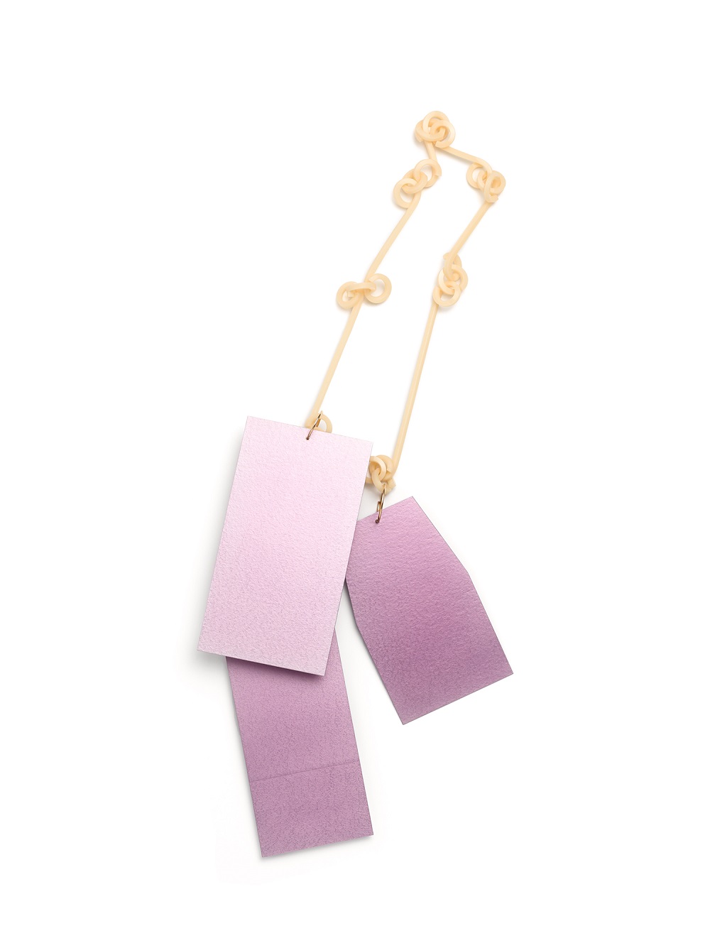 Gintarė Janulaitytė (LT) | „Nekintantys mano senelių namai“, kaklo papuošalas, 2019, sidabras, varis, emalis, nerta servetėlė.