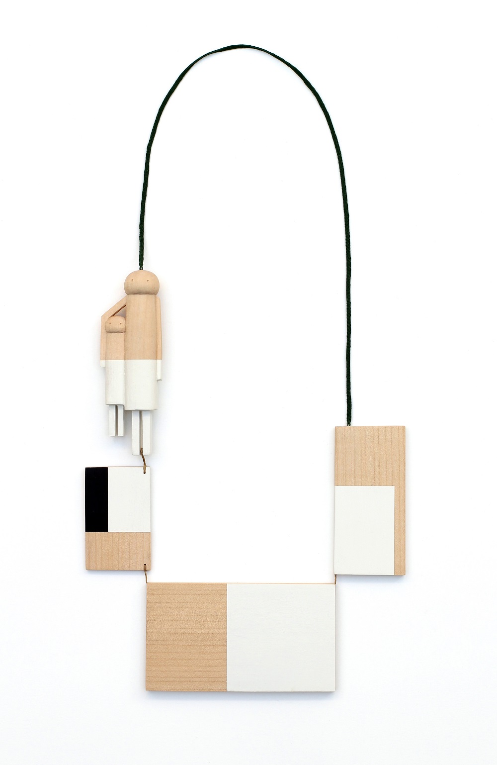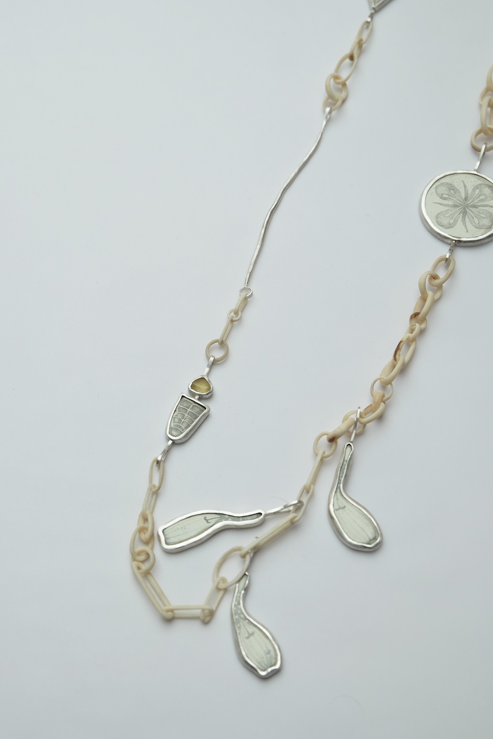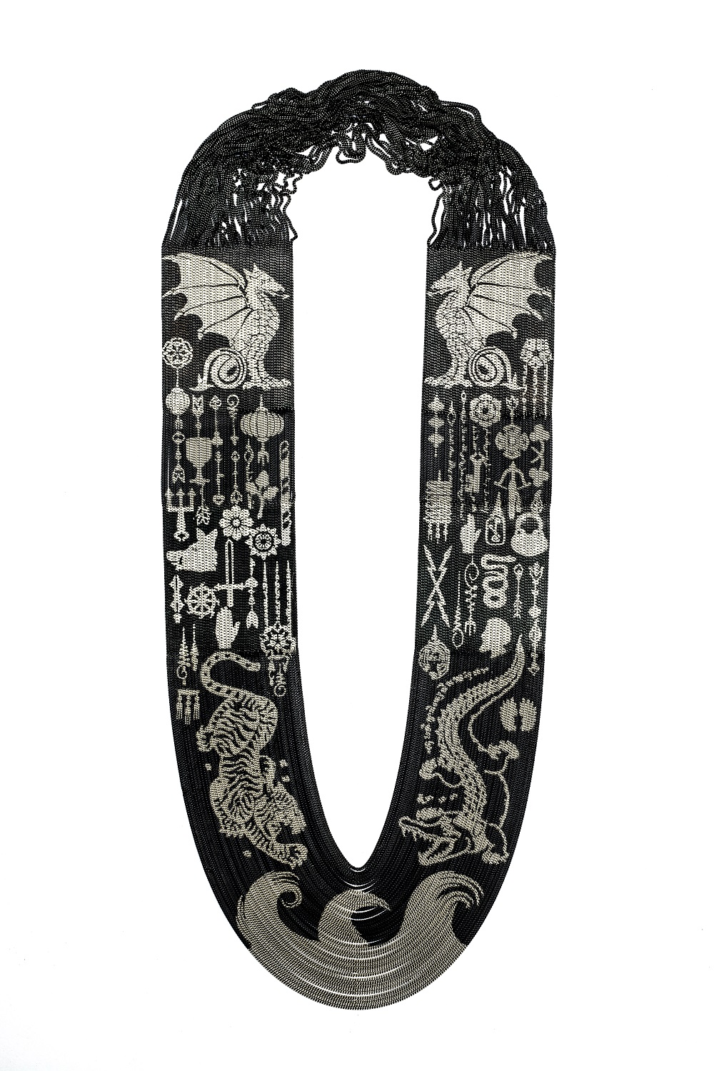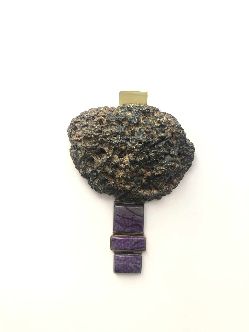 Gintarė Janulaitytė (LT) | „Nekintantys mano senelių namai“, kaklo papuošalas, 2019, sidabras, varis, emalis, nerta servetėlė.