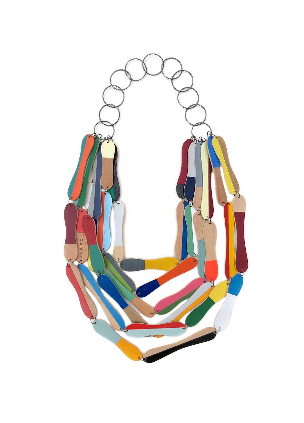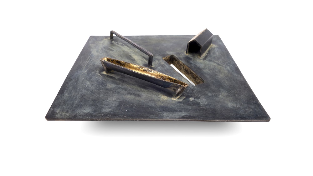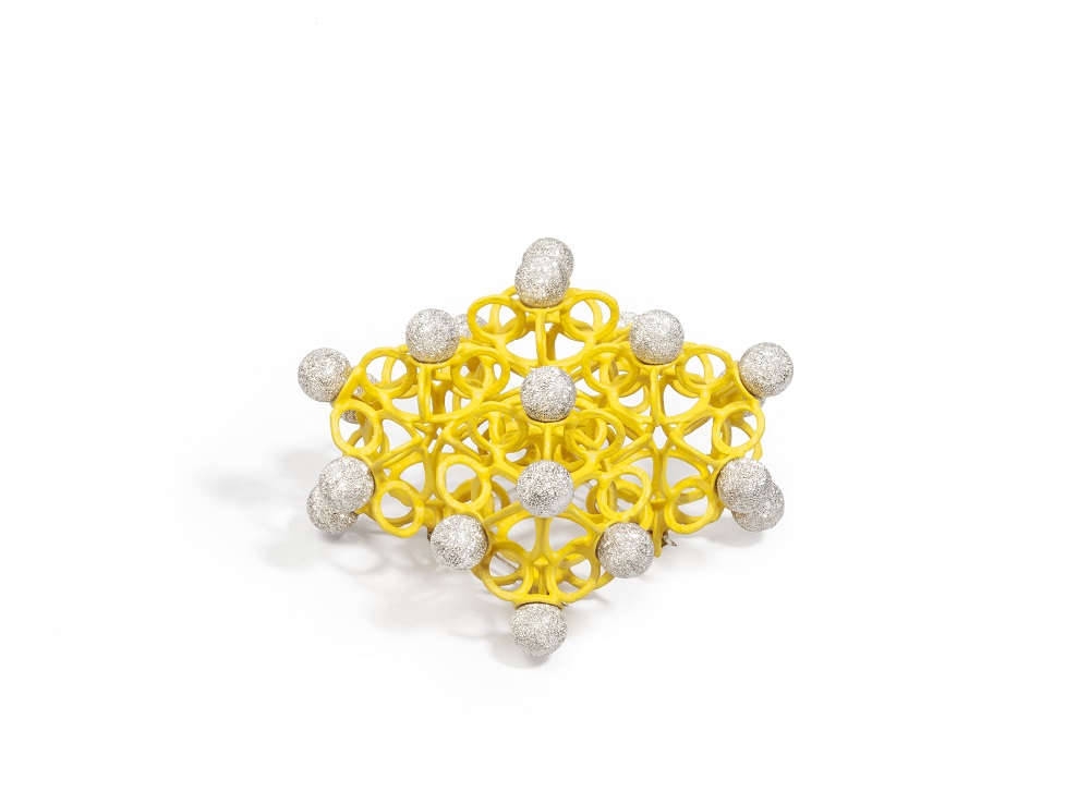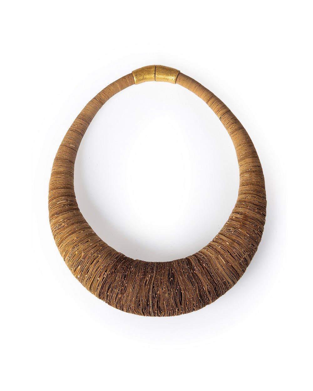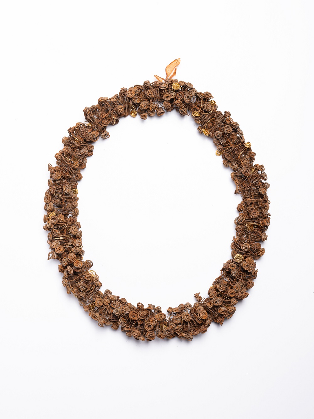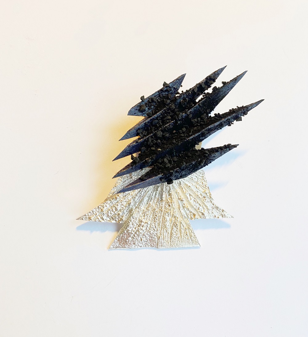 Gintarė Janulaitytė (LT) | „Nekintantys mano senelių namai“, kaklo papuošalas, 2019, sidabras, varis, emalis, nerta servetėlė.