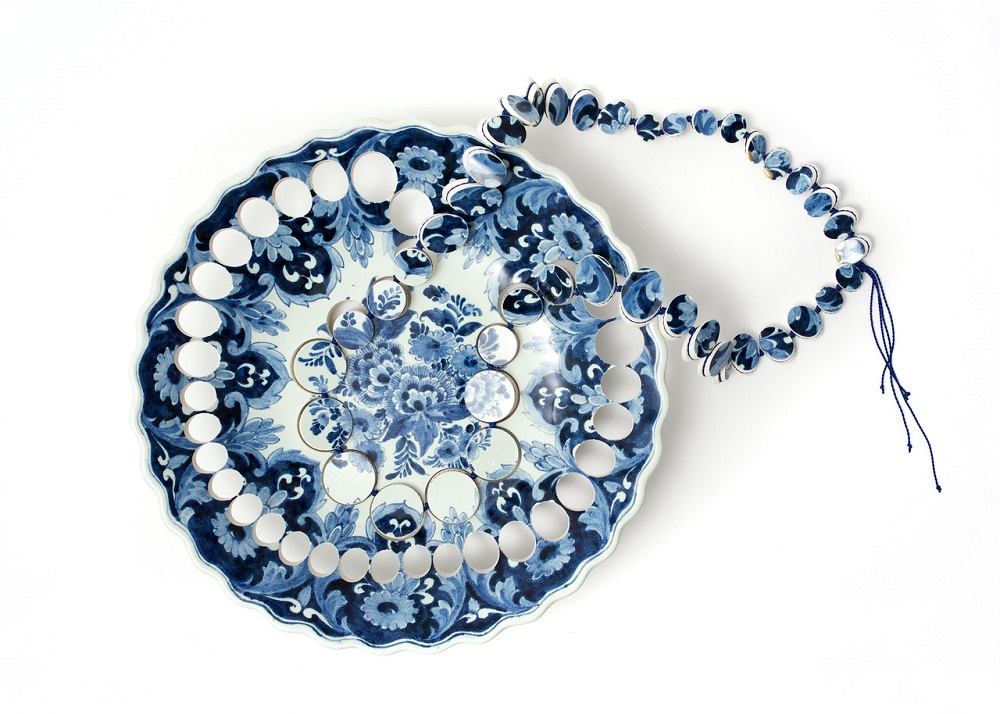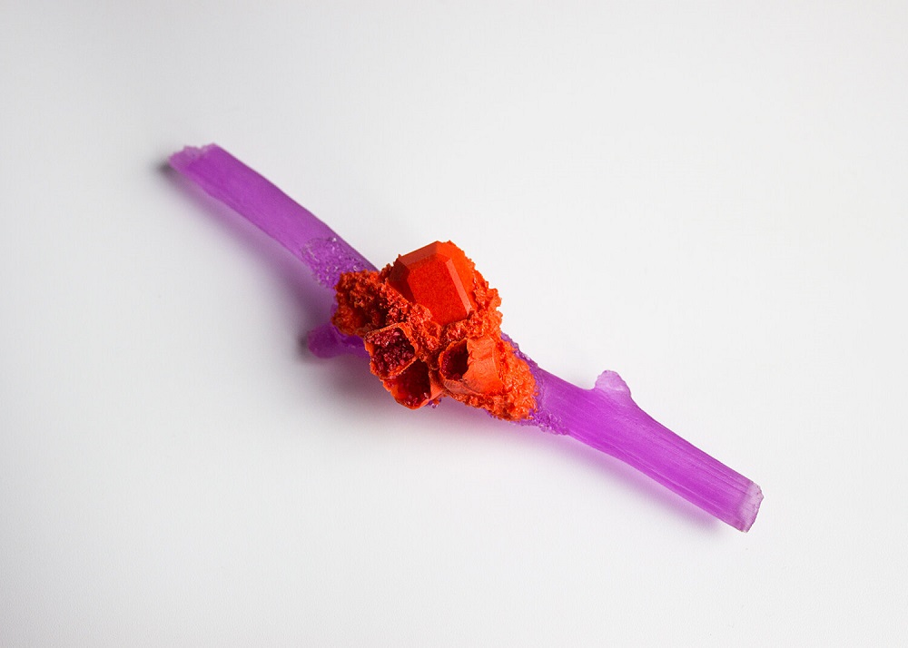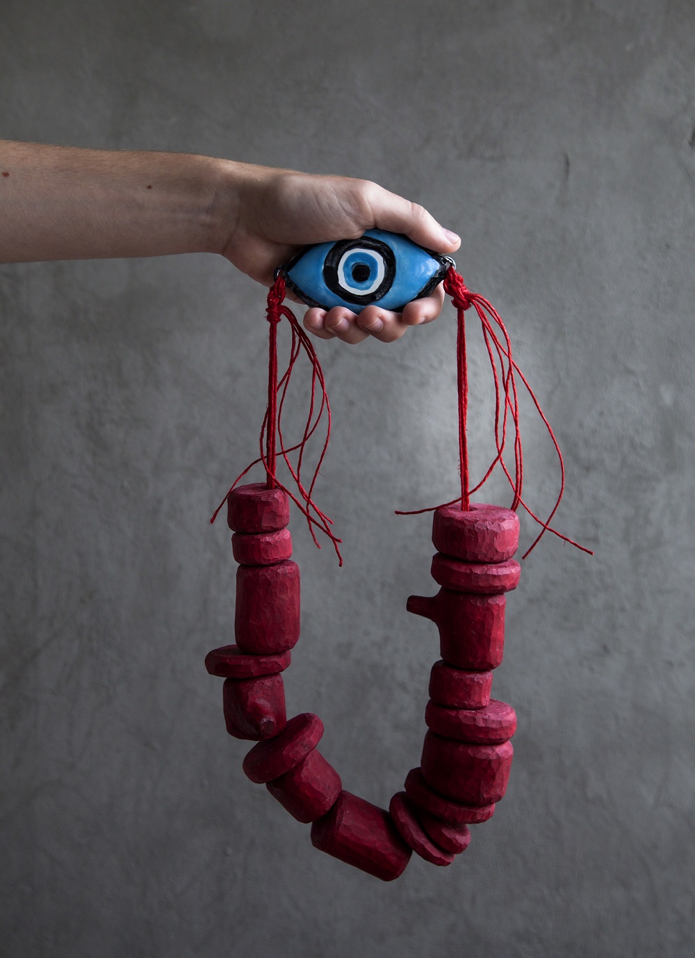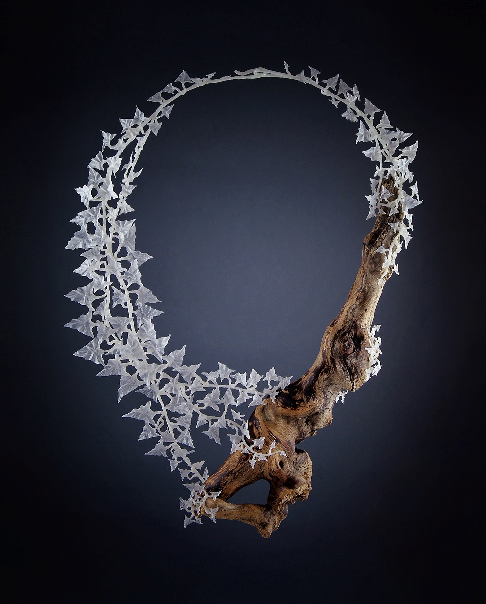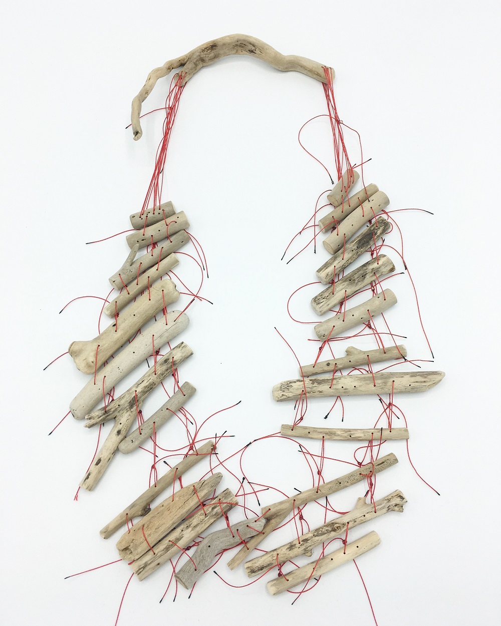 Gintarė Janulaitytė (LT) | „Nekintantys mano senelių namai“, kaklo papuošalas, 2019, sidabras, varis, emalis, nerta servetėlė.