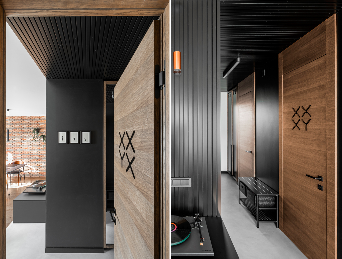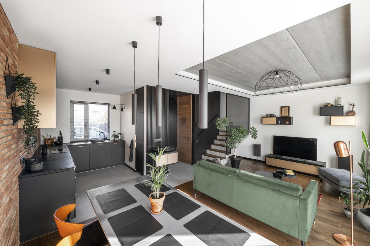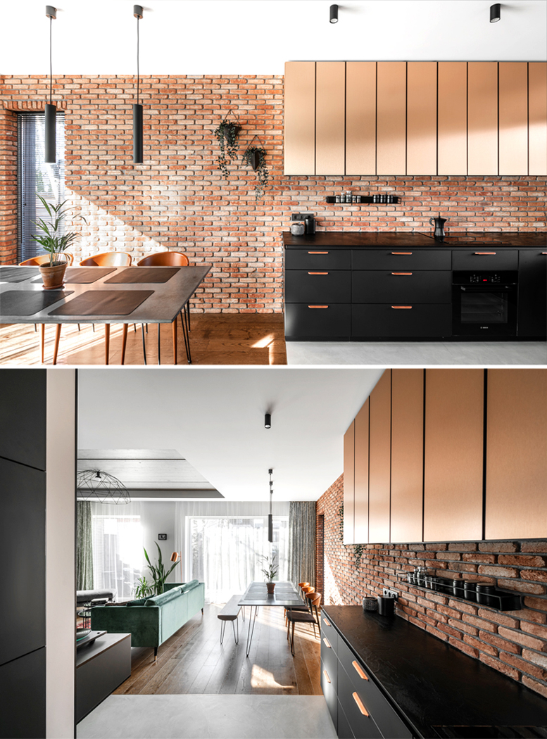 Charakteringi, išraiškingi ir kontrastingi namai. Gyvenamoji erdvė yra bendra su virtuve: virtuvė prasitęsia į valgomojo zoną, o ši pereina į svetainę. Interjere persipina industrinis stilius su mid-century elementais. Paliktos atviro betono lubos ir laiptai, įrengti metalinio tiklo turėklai, fasadinių plytų siena virtuvės zonoje. Nebijota rinktis tamsesnes, ryškesnes spalvas, kaip juodos sienos, raudonos plytos, žalia sofa, vario plokštės baldams – kurios kuria ryškų kontrastą ir diktuoja išraiškingą charakterį. Pasirinktos natūralios medžiagos – medis, betonas, plytos, metalas.