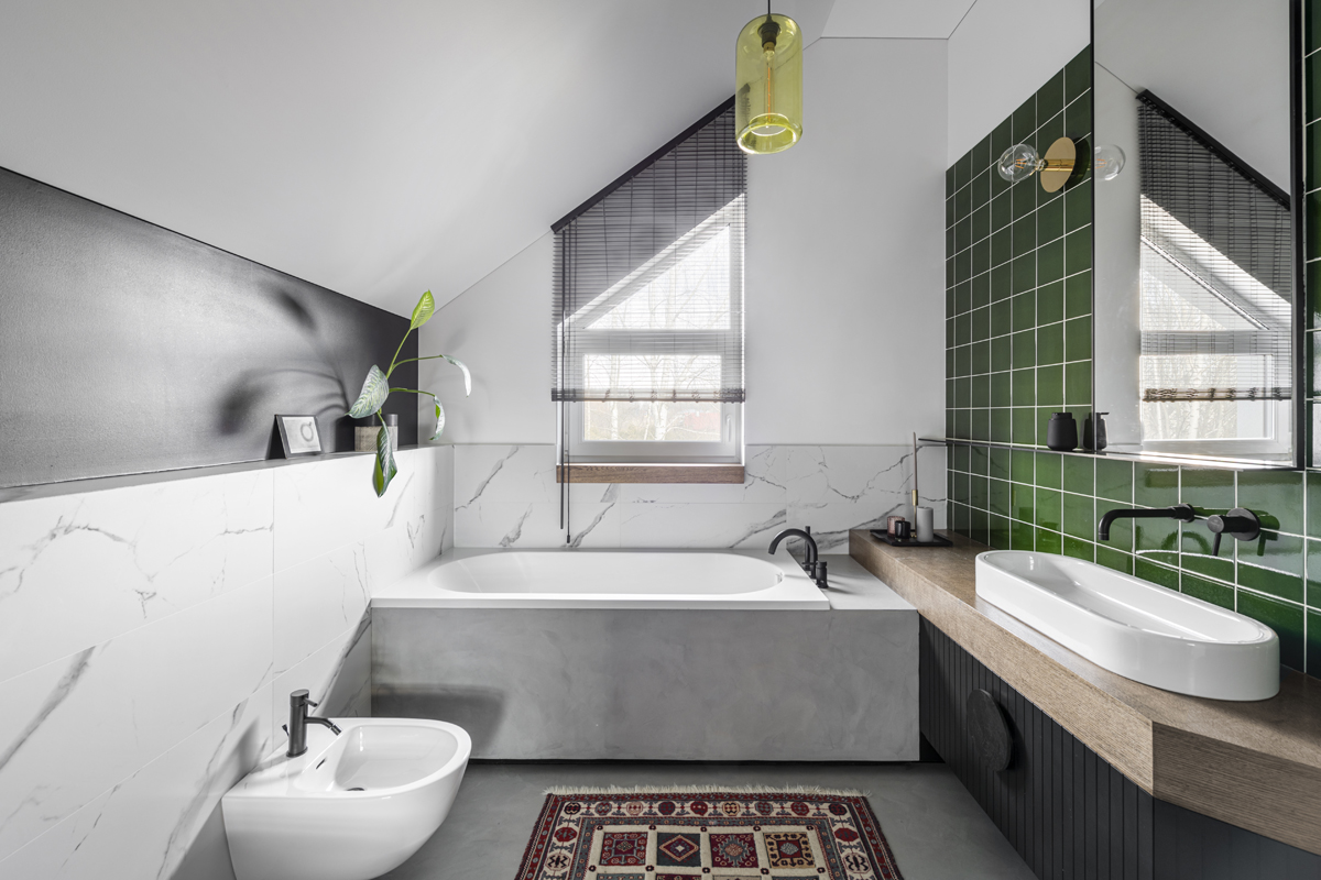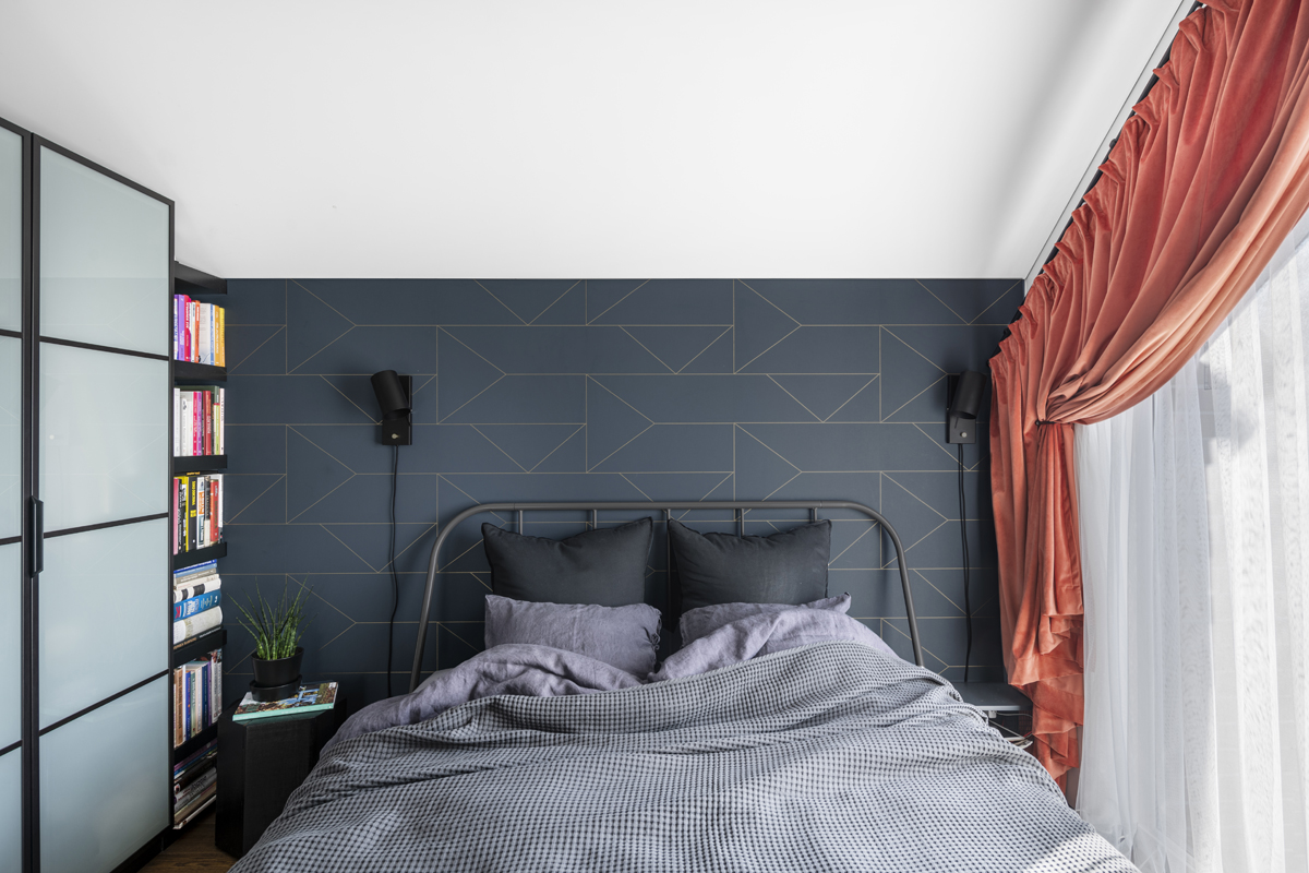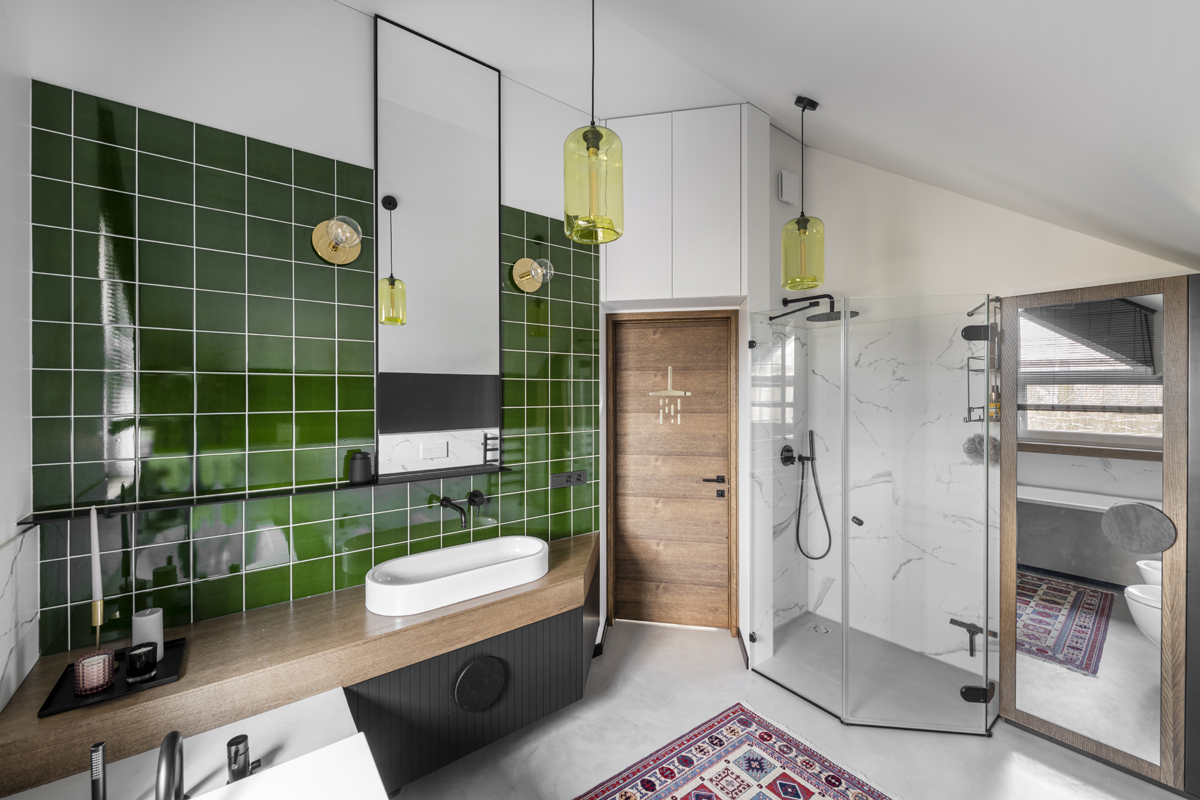 Miegamajame akcentu tampa giliai mėlynos spalvos tapetas su plytų spalvos užuolaidomis. Vonioje pasiriktos žalio stiklo spalvos plytelės derinamos su balto marmuro plytelėmis, klasikiniu kilimu ir juodais akcentais. Vonios erdvė susišaukia su bendru namų spalviniu koloritu ir turi bohemišką charakterį.