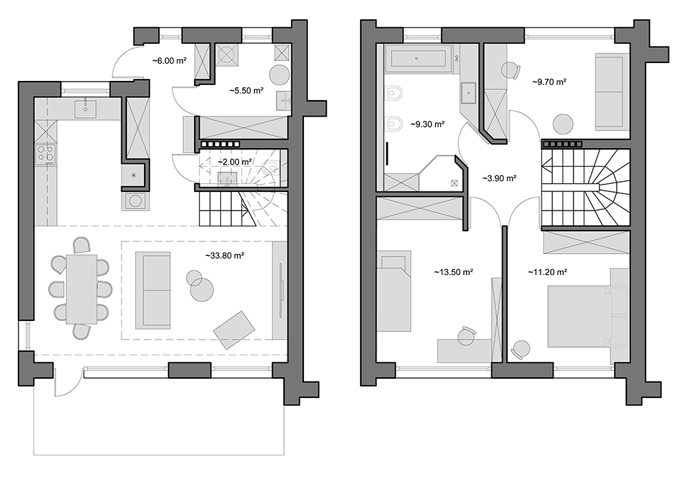 Ant tamsesnių paviršių ir apdailos medžiagų faktūrų puikiai atsiskleidžia natūraios šviesos žaismas. Visi sprendimai kuria savitus ir jaukius namus.