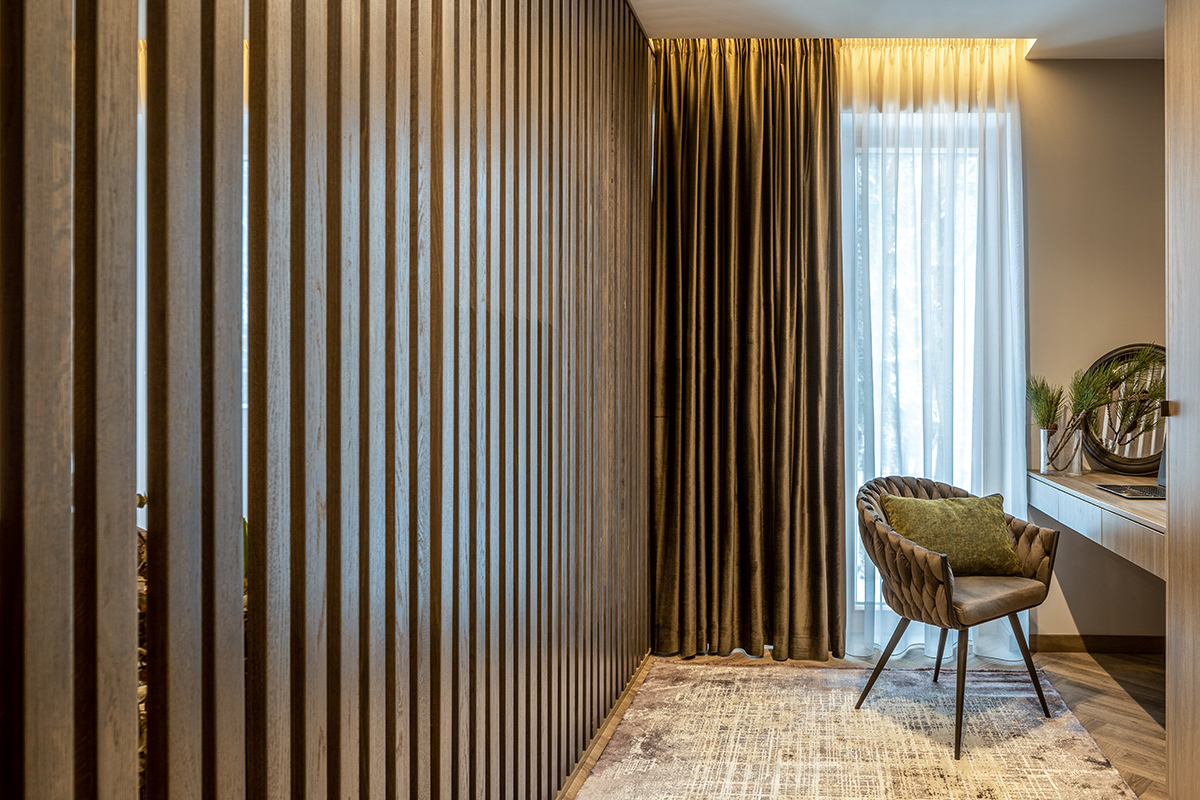 Namas dvynys kuria harmoningą ir pagarbų santykį su gamta. Tarsi dvi iš vieno kamieno išaugančios medžio šakos talpina dvi funkcijas – bendro poilsio ir privataus poilsio zonas. Interpretuojant vieną iš gamtos principų, pastato išorei pasirinktos atsparios ir tvirtos medžiagos, kai tuo tarpu interjere naudojamas balintas ąžuolas, kuria jaukumo ir minkštumo įspūdį. Stiklinės vitrinos atsiveria kraštovaizdžiui, riba tarp vidaus ir išorės išnyksta.