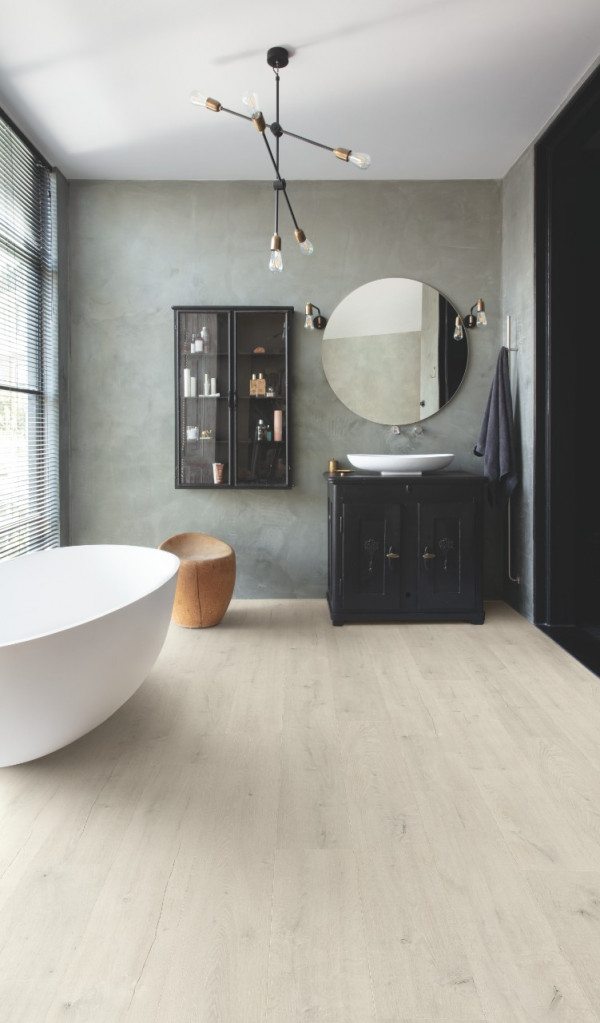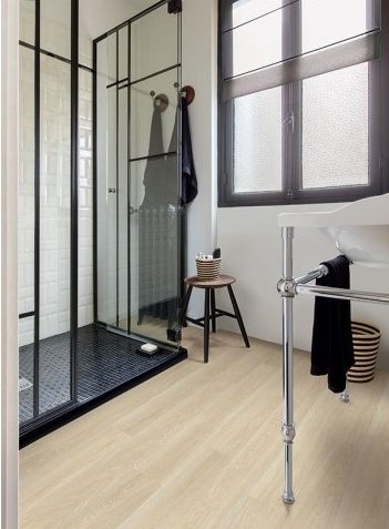 Dar prieš kelis metus laminatas vonioje atrodė neįmanomas, net gamintojai instrukcijose nurodydavo, kad jis negali būti klojamas drėgnose patalpose. „Ilgą laiką keramikinės plytelės buvo kone vienintelis pasirinkimas vonios grindims, – pasakoja G. Laurinavičius. – Tad svajonės apie vonios grindis, kurios ne tik atrodo kaip medinės (yra ir keramikinių plytelių su tokiu piešiniu), bet yra šiltos ir jaukios, kai jomis vaikštai, likdavo svajonėmis. Viskas pasikeitė, kai atsirado pirmos drėgmei atsparių laminuotų grindų kolekcijos, skirtos vonios kambariams“. „Quick-Step“ salono vadovas paaiškina, kad „Impressive“ kolekcijos drėgmei atsparių laminuotų grindų paslaptis – lentų grioveliai, gebantys atstumti vandenį ir neleidžiantys jam prasiskverbti. Montuojant tokias grindis, visos siūlės aplink grindų perimetrą yra sandarinamos su drėgmei atspariu hermetiku. Rezultatas – drėgmei atsparios, jaukios, šiltos ir norimo medžio rašto grindys vonioje. „Vos pasirodęs, drėgmei atsparus laminatas sulaukė daug klientų dėmesio, tad akivaizdu, kad poreikis tokioms grindims tikrai buvo didelis“, – įsitikinęs specialistas.