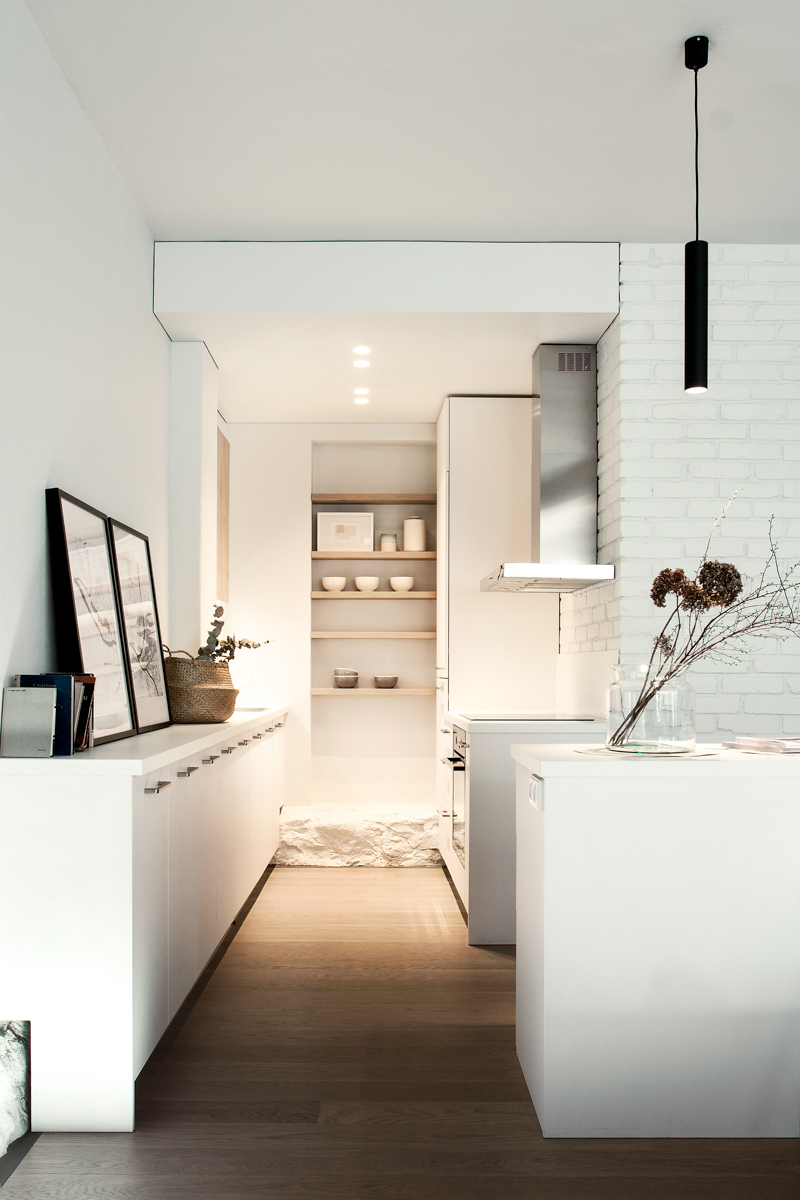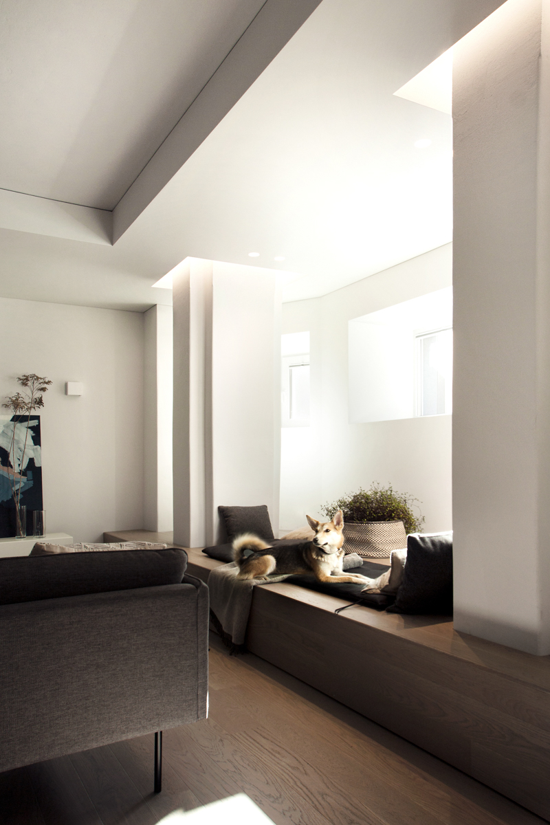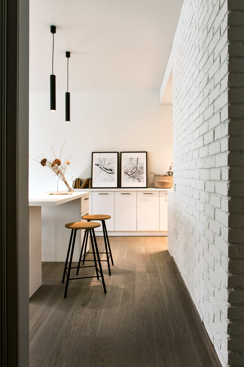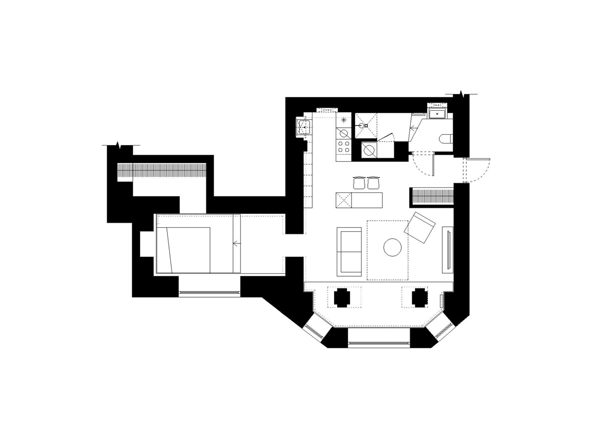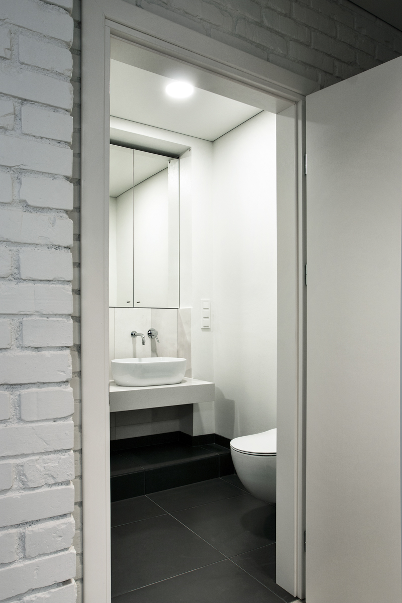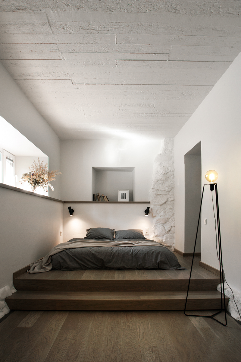 Į miegamąjį veda anga be durų, taip pratęsiant ir išplečiant erdvę, taip pat įsileidžiant šviesos sklindančios per nemažą miegamojo langą. Pakyla lovai buvo suformuota, siekiant suvienodinti skirtingus miegamojo ir drabužinės patalpų grindų lygius. Tai lėmė neįprastą, bet funkcionalų miegamojo zonos sprendimą. Visame bute naudojama neutrali spalvų ir medžiagų paletė. Visi esami skirtingi paviršiai (plytos, betonas, grubios faktūros tinkas) buvo nudažyti baltai, pabrėžiant tekstūrų kontrastą. Priimtų dizaino sprendimų rezultatas – šiuolakiška erdvė pabrėžianti istorinę pastato vertę.