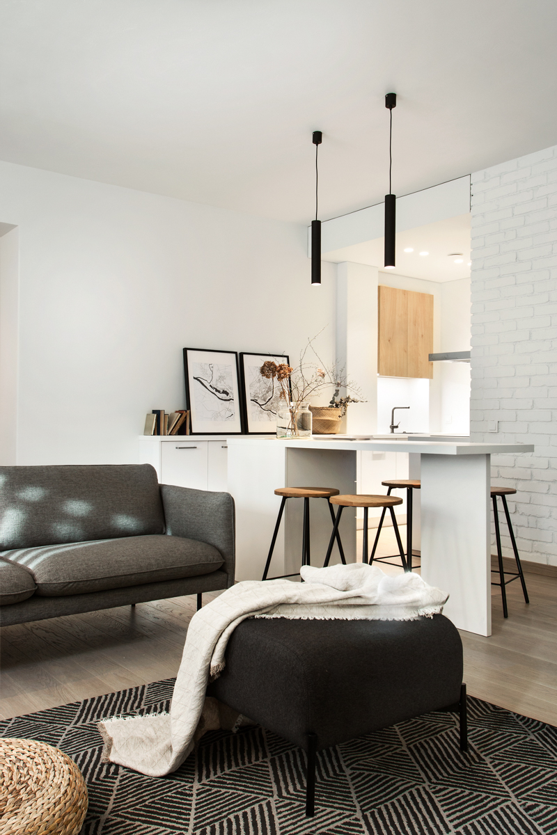 Butas yra sename tarpukariniame pastate Kauno centre. Kuriamas interjeras pabrėžia originalią pastato struktūrą – masyvias kolonas ir storas sienas. Butas yra rūsyje, per mažus langus patenka nedaug natūralios šviesos. Vienas didžiausių iššūkių buvo transformuoti tamsią negyvenamą erdvę į jaukų ir modernų būstą. Neįprasta buto erdvė (keli nedideli langai vienoje pusėje ir neapšviesta likusi buto dalis, masyvios kolonos priešais langus, užstojančios ir taip neryškią saulės šviesą) reikalavo netradicinių architektūrinių sprendimų. Grindų lygis aplink kolonas pakeltas, sukuriant poilsio zoną šviesiausioje buto dalyje. Tamsesnėse erdvėse įsikūrė virtuvė ir vonios kambarys.