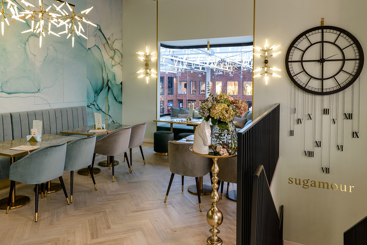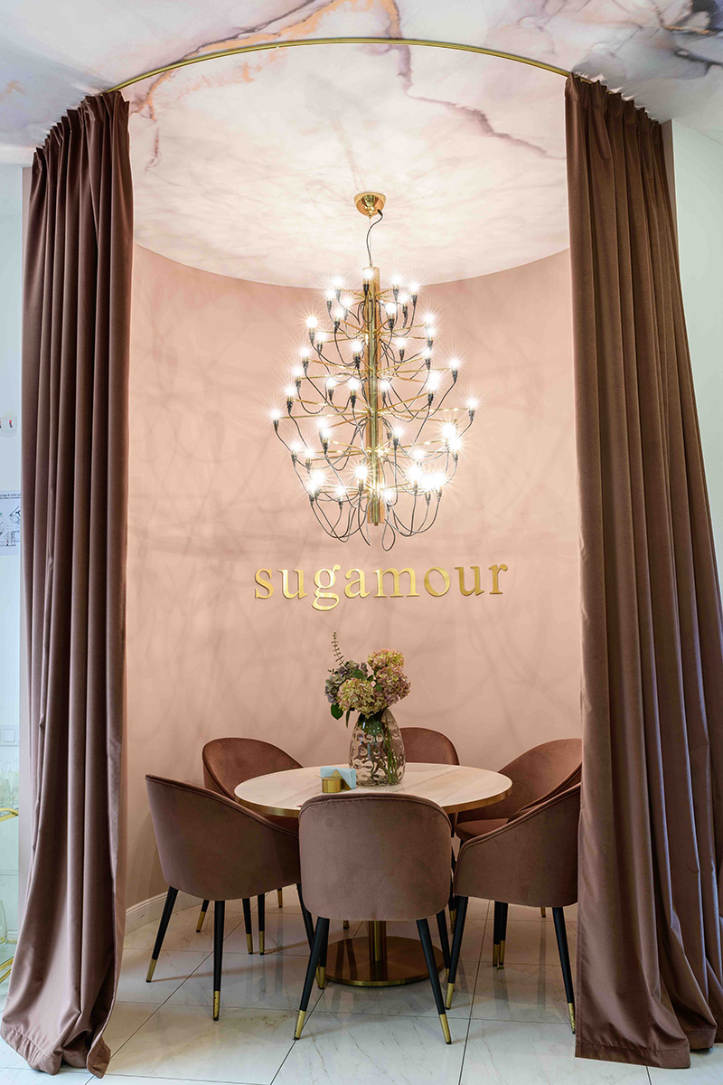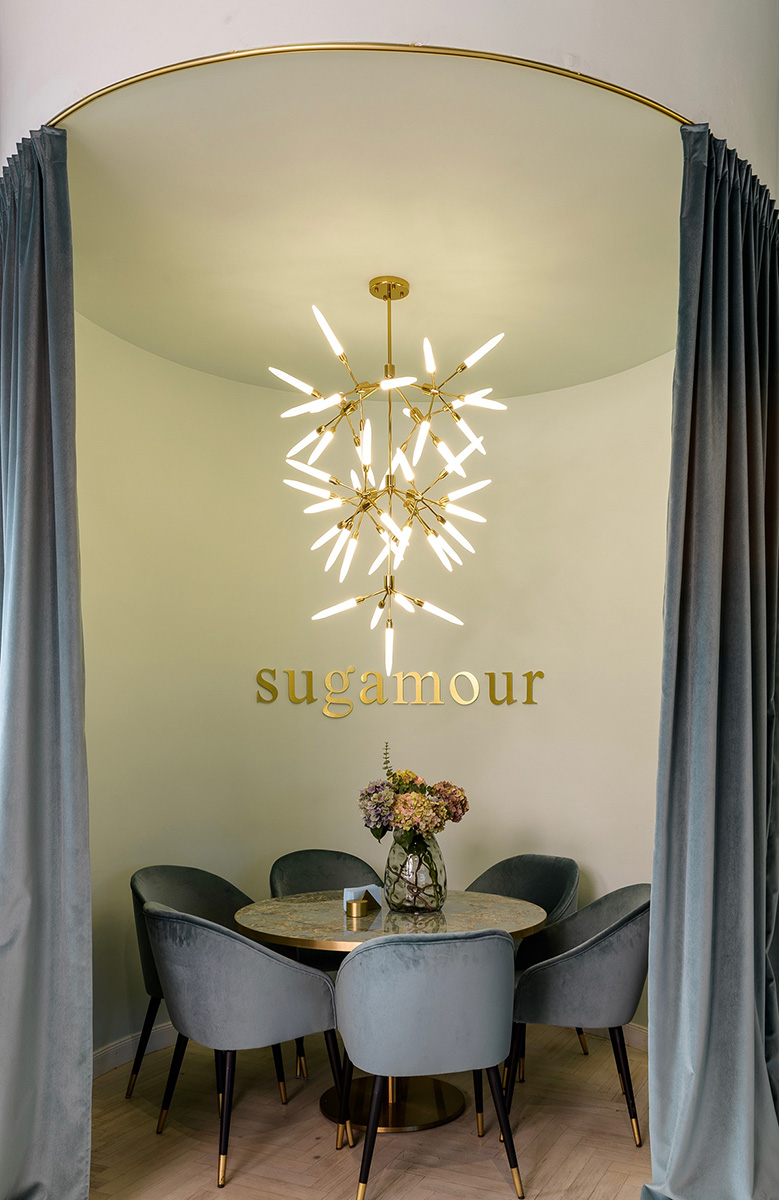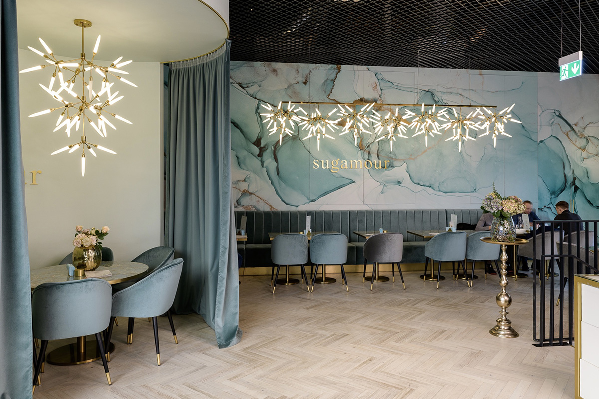 „Sugamour“ – rafinuotas desertų butikas, taip pat turintis platų „a la carte“ meniu. Šis restoranas jau pamiltas vilniečių ir truputį paragautas kauniečių, kur po PC „Akropolis“ rekonstrukcijos, „Sugamour“ gavo išskirtinį plotą ir mes ėmėmės darbo! Vieta įdomi, sudėtinga, trikampio formos, mažai turinti sienų ir daug stiklinių pertvarų, todėl erdvių funkciniam zonavimui pasirinkti dekoro elementai: širmos, užuolaidos, vazonai. Jų pagalba lengva transformuoti erdvę ir pritaikyti vykstantiems renginiams, privačioms šventėms. Projektuojant patyrėme ne vieną iššūkį, bet kuo sudėtingiau, tuo įdomiau. Turėjome nedaug ploto stiliui sukurti, tai vieną sieną antrame aukšte, ir pirmojo aukšto lubos – jas ir pavertėme šio restorano pagrindine interjero detale. Tai lyg akvarelės meno kūriniai, kuriuos papildo prabangūs šviestuvai ir aukso elementai. Restorano aukštus išskyrėme spalvomis. Antram aukštui parinkome mėtos ir smaragdų atspalvių derinį, o pirmam aukštui su terasa išrinkome švelnią dūminės rožinės atspalvių gamą. Visos interjerui naudojamos medžiagos aukštos kokybės ir kruopščiai parinktos. Šio restorano interjeras elegantiškas, rafinuotas ir nepamirštamas kaip ir „Sugamour“ desertai!