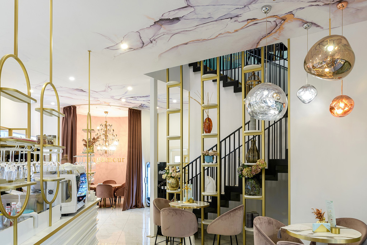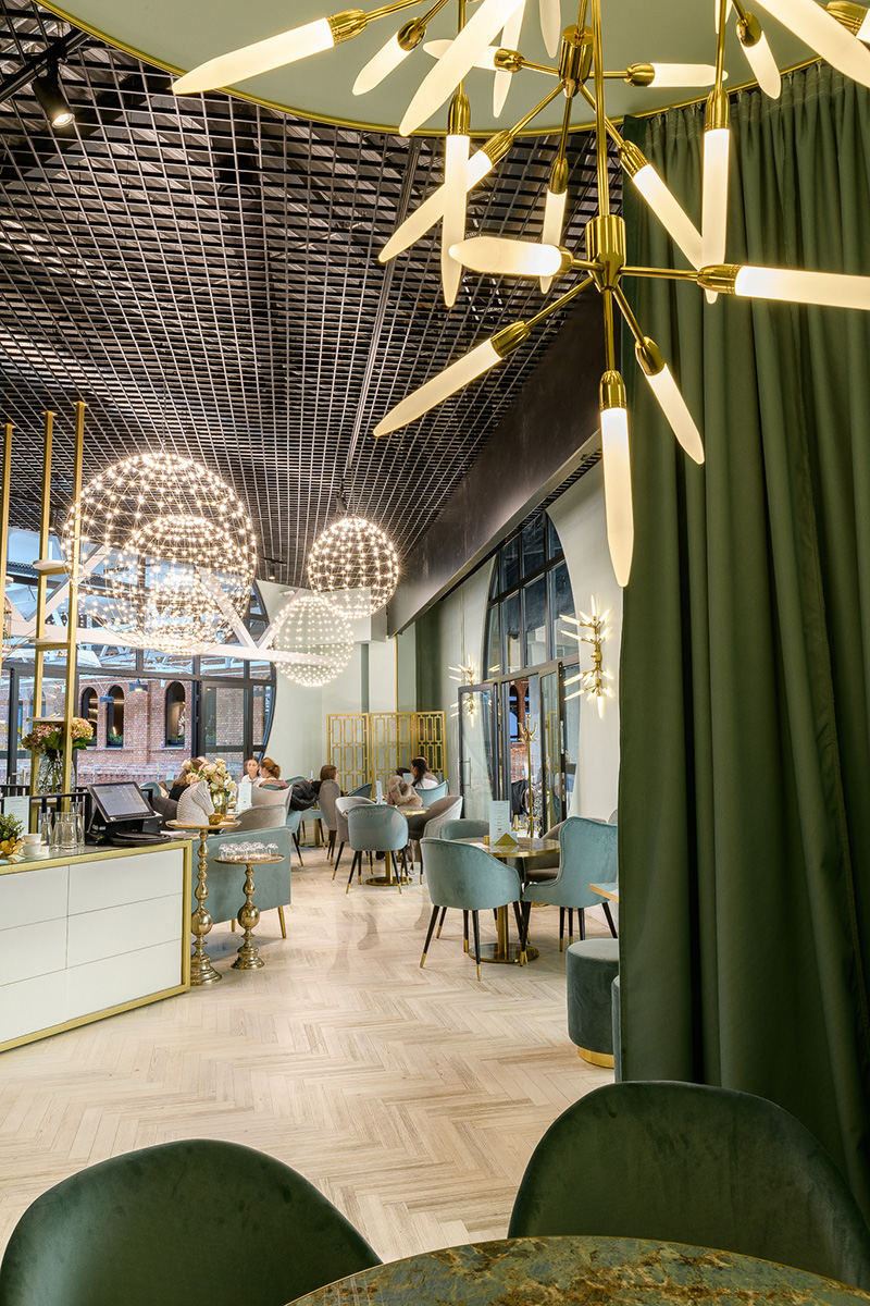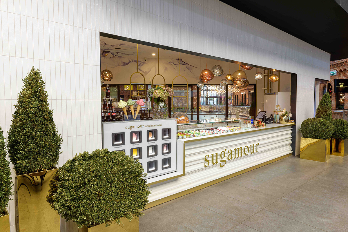 „Sugamour“ – rafinuotas desertų butikas, taip pat turintis platų „a la carte“ meniu. Šis restoranas jau pamiltas vilniečių ir truputį paragautas kauniečių, kur po PC „Akropolis“ rekonstrukcijos, „Sugamour“ gavo išskirtinį plotą ir mes ėmėmės darbo! Vieta įdomi, sudėtinga, trikampio formos, mažai turinti sienų ir daug stiklinių pertvarų, todėl erdvių funkciniam zonavimui pasirinkti dekoro elementai: širmos, užuolaidos, vazonai. Jų pagalba lengva transformuoti erdvę ir pritaikyti vykstantiems renginiams, privačioms šventėms. Projektuojant patyrėme ne vieną iššūkį, bet kuo sudėtingiau, tuo įdomiau. Turėjome nedaug ploto stiliui sukurti, tai vieną sieną antrame aukšte, ir pirmojo aukšto lubos – jas ir pavertėme šio restorano pagrindine interjero detale. Tai lyg akvarelės meno kūriniai, kuriuos papildo prabangūs šviestuvai ir aukso elementai. Restorano aukštus išskyrėme spalvomis. Antram aukštui parinkome mėtos ir smaragdų atspalvių derinį, o pirmam aukštui su terasa išrinkome švelnią dūminės rožinės atspalvių gamą. Visos interjerui naudojamos medžiagos aukštos kokybės ir kruopščiai parinktos. Šio restorano interjeras elegantiškas, rafinuotas ir nepamirštamas kaip ir „Sugamour“ desertai!