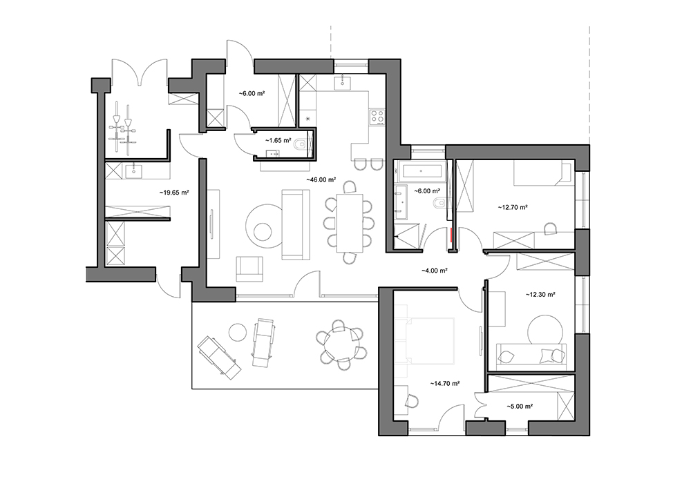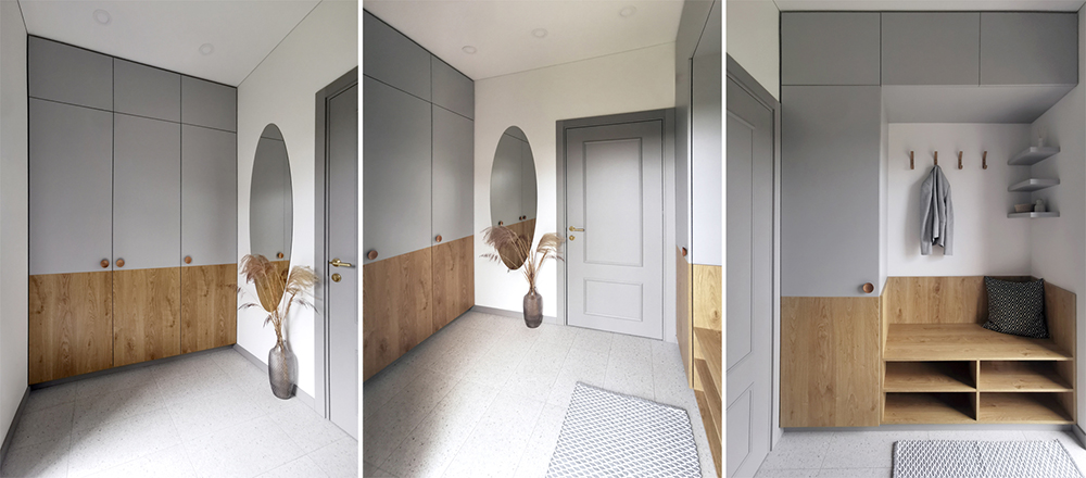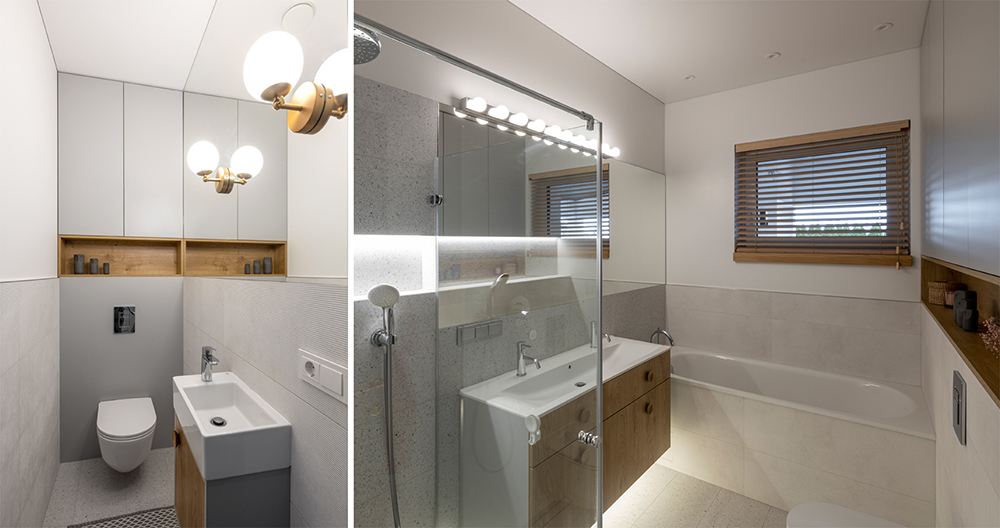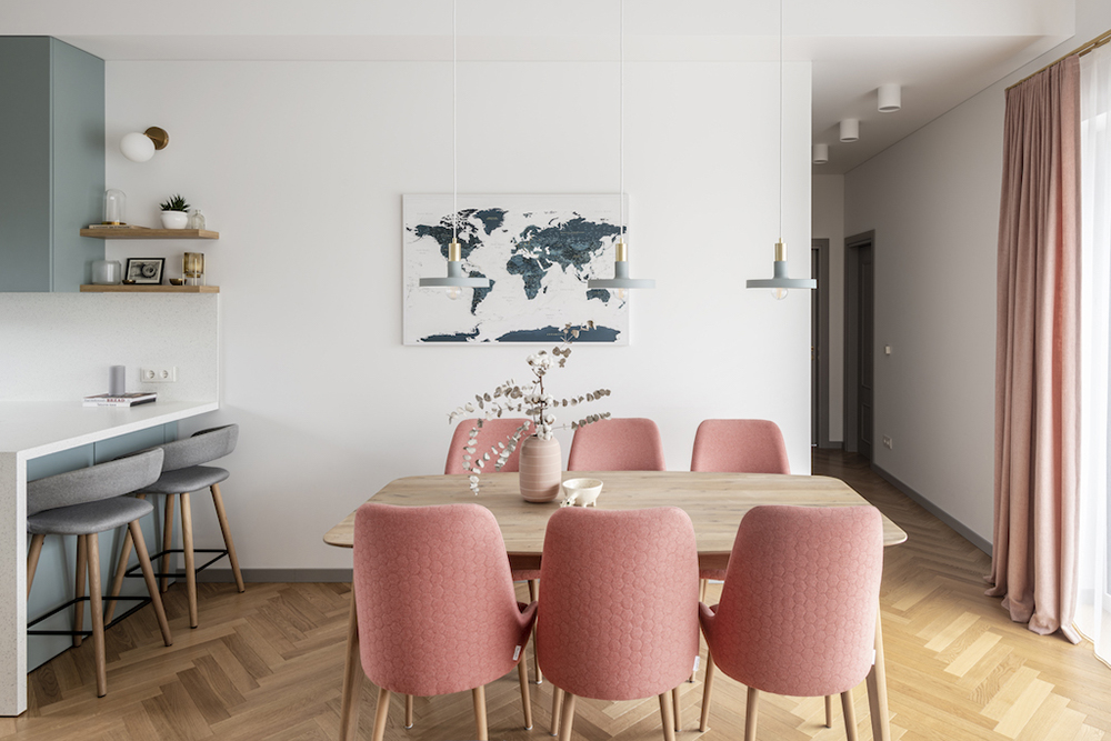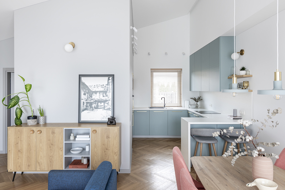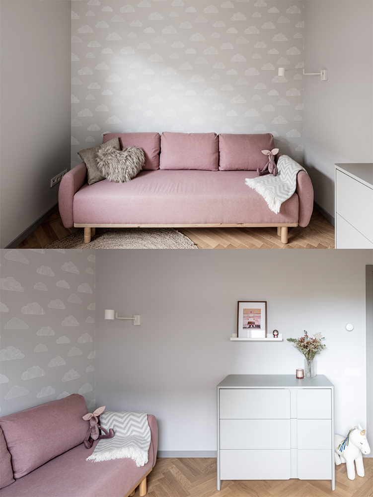 Šviesūs, pasteliškai spalvingi namai su retro elementais. Vystytojo originaliai numatytas išplanavimas buvo pakeistas veidrodiniu principu perplanuojant erdves, kad būtų sukurtas didesnis įėjimo holas, patekimas iš ūkinių patalpų būtų ne į virtuvę, o prie įėjimo holo, o valgomojo lubos būtų aukštesnės.