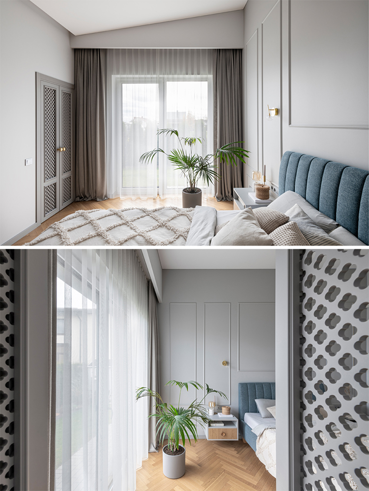 Erdvių pagrindui pasirinkti neutralūs pilkų tonų atspalviai, natūralios medinės grindys, o spalvinė gama kuriama baldais ir tekstile. Kotedžas šiuolaikiško stiliaus, tačiau turintis retro elementų.