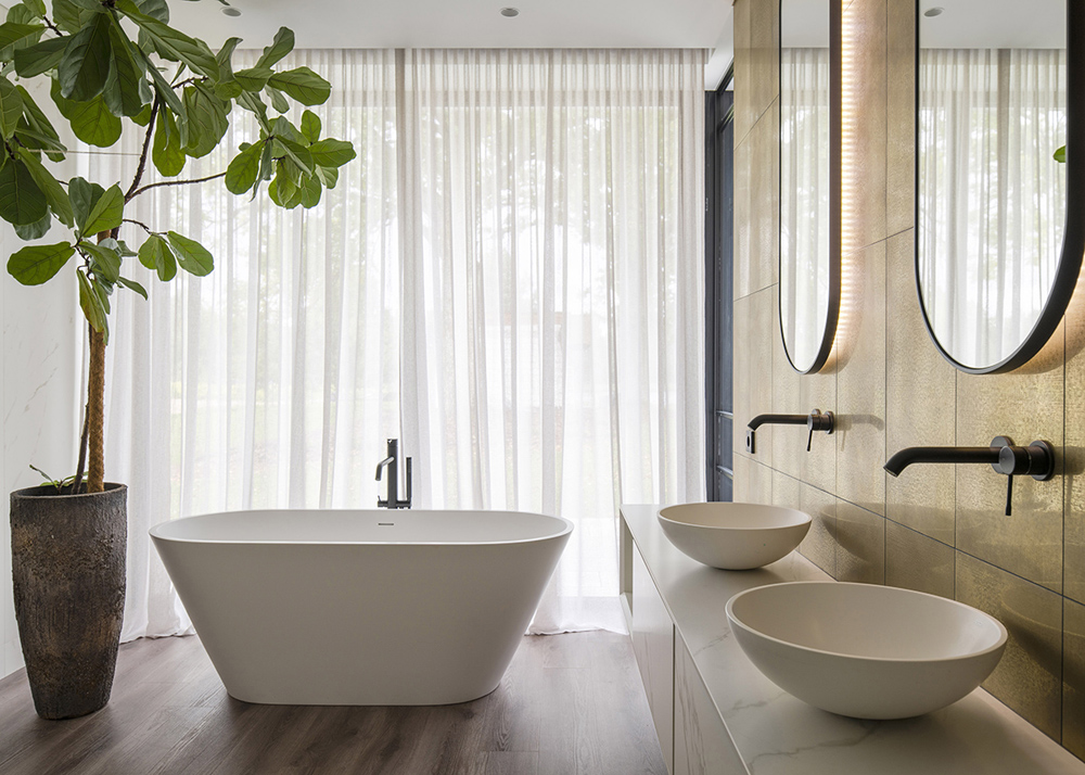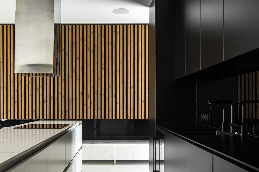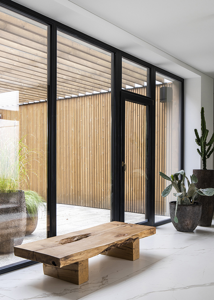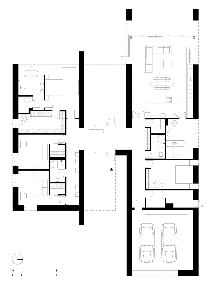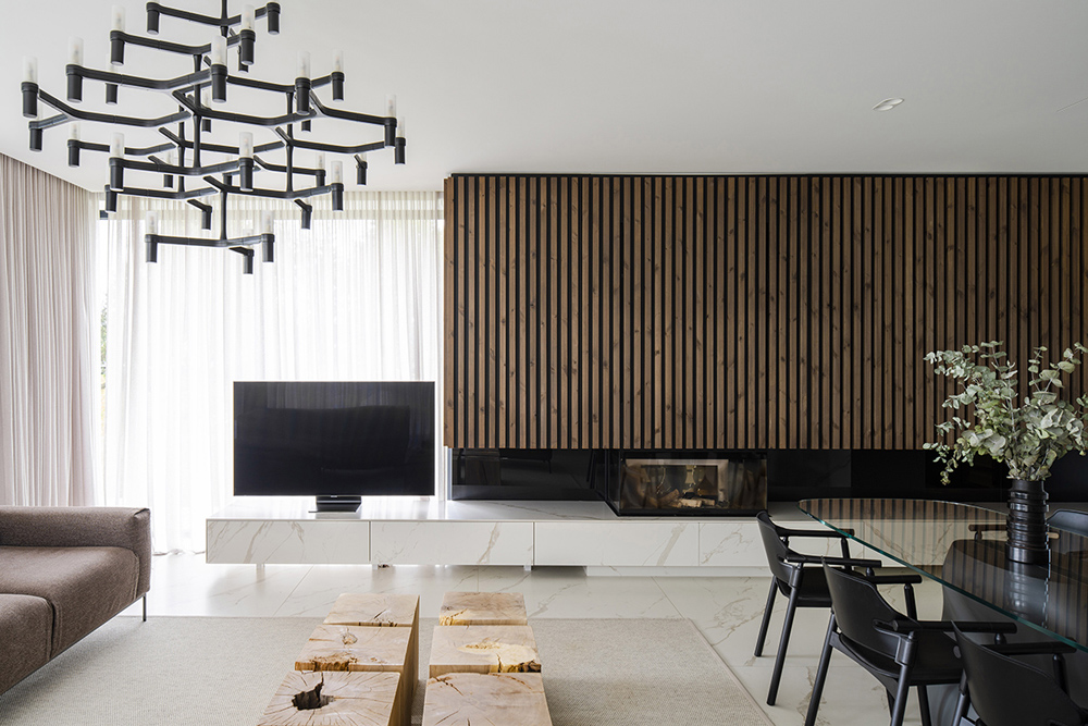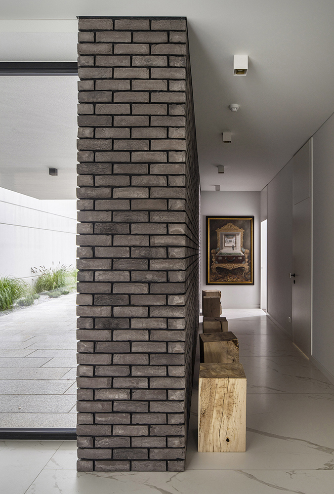 Jaunos šeimos vila šimtamečių ąžuolų, tvenkinio ir pievų apsuptyje – pastatyta toliau nuo miesto, atsiskyrėliškai ramios gyvenimo tėkmės ieškančiam žmogui. Du į vandenį atgręžti gyvenamosios ir poilsio zonos tūriai, sujungti perregima stiklo galerija, neužstojančia pagrindiniu taku ateinančiojo žvilgsnio. Deginta mediena, naturalus akmuo, molio plytos, dažytas plienas ir žemiški jų tonai – pagrindinė jungtis tarp pastato lauko ir vidaus stilistikos. Ramybė lytėti, užuosti, nužvelgti. Stiklinės vitrinos interjere sujungia lauko ir vidaus erdves, atveria kelių planų vaizdą ir natūralios šviesos skvarbą, kuri atsispindi juodų, auksinių, sidabrinių detalių paviršiuose. Galerinė baltos spalvos tyla ir švara leidžia suskambėti grosteskiškiems ir fantasmagoriškiems šiuolaikinių Lietuvos menininkų peveikslų siužetams. Ąžuoliniai kelmai pagrindinėse erdvėse pasakoja žmogui senojo neišsaugoto ąžuolo legendą. Juk svarbiausias čia žmogaus buvimas!