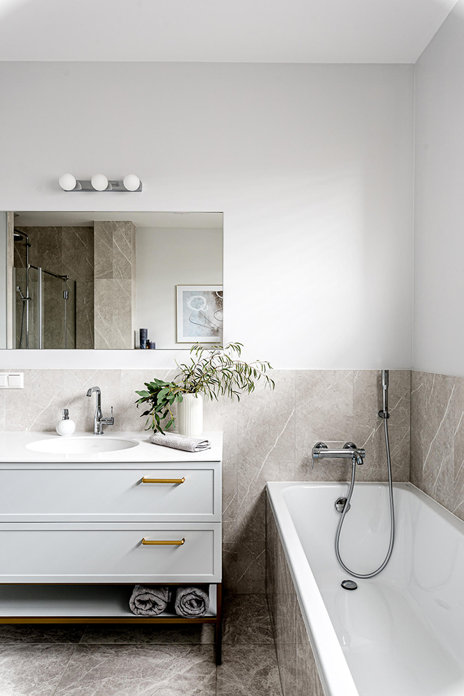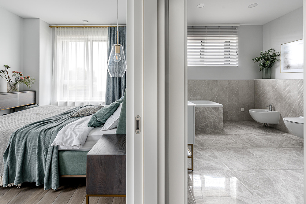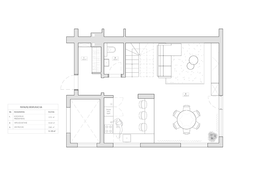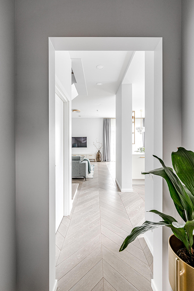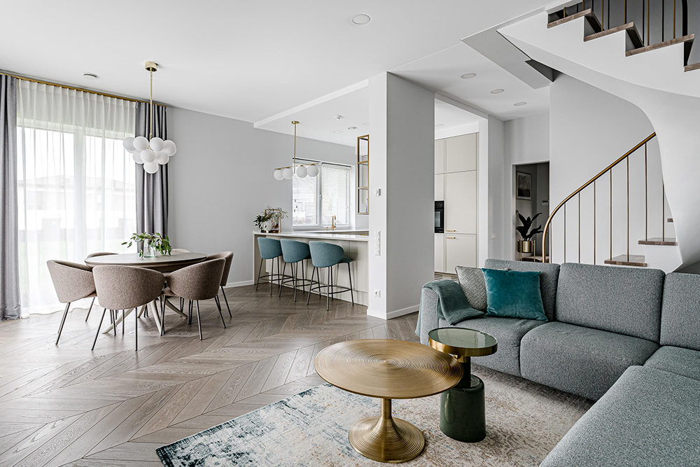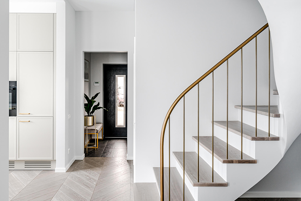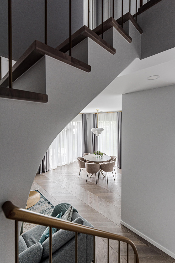 Interjere vyrauja vien ramūs harmoningi tonai, kurie persipina tarpusavyje lyg vientisa spalvų paletė. Interjeras skirtas dviem suaugusiems žmonėms, mėgstantiems estetika ir švarą erdvėje, tad interjeras kurtas kuo mažiau apraunant jį daiktais bei suteikiant erdvės spalvoms bei architektūrinėms namo ervių linijoms.
