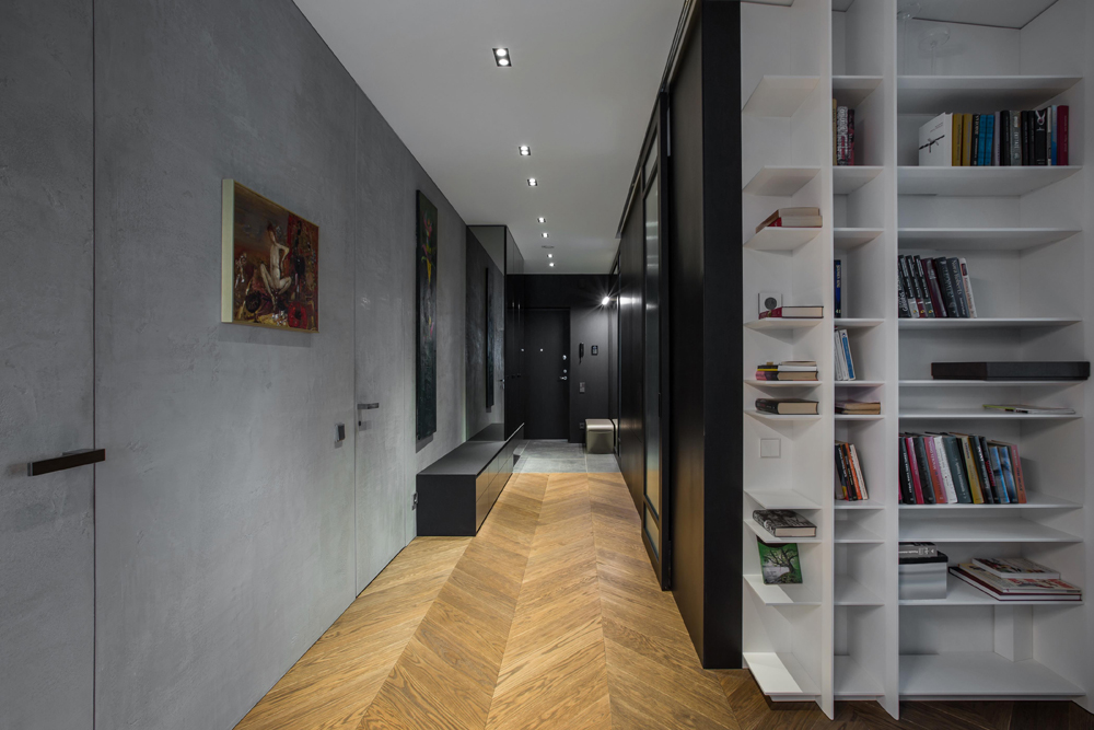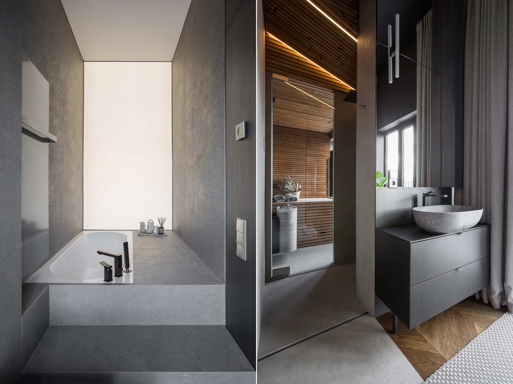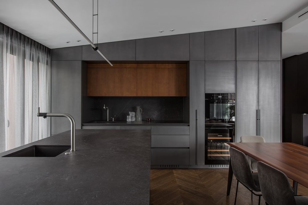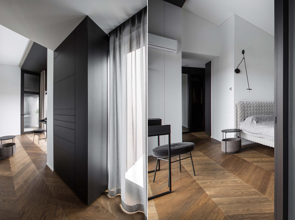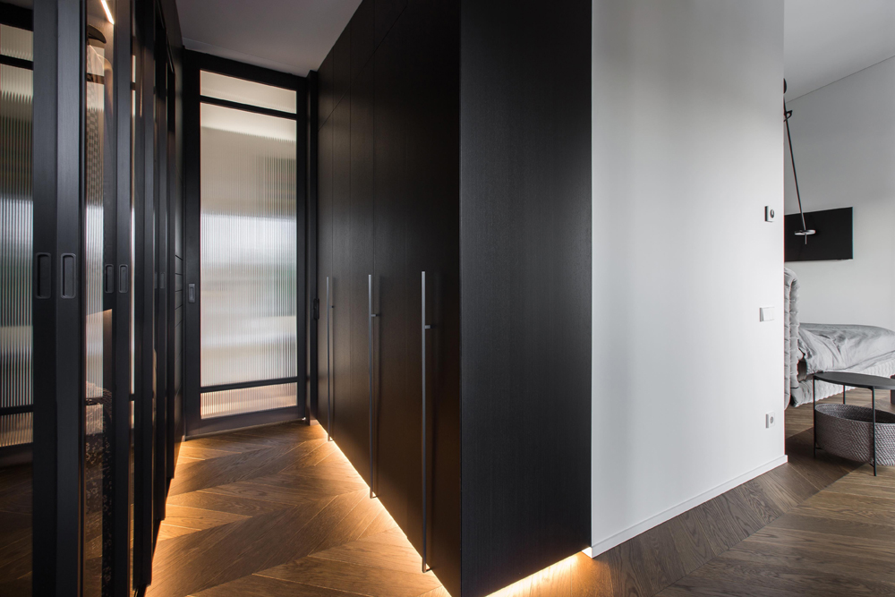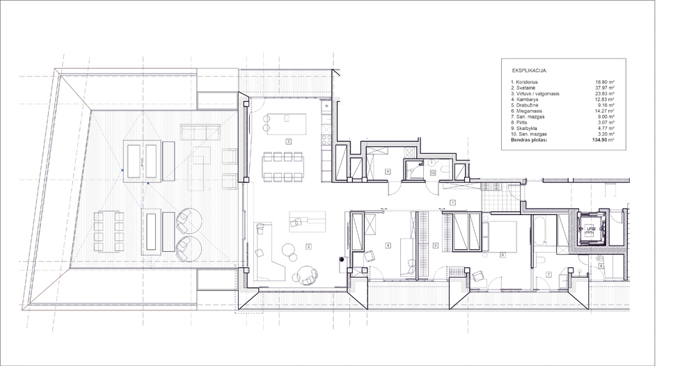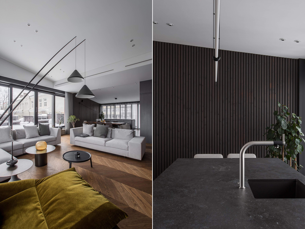 Naujos statybos namo architektūra, skirtingos stogo lūžių, aukščių vietos, inžineriniai sprendimai, labai įtakojo būsto išplanavimo pakeitimus, neabejotinai kurie buvo derinti pagal užsakovų poreikius. Namų erdves jungia aukšti langai, kurie dovanoja nuostabius vaizdus, praplečia būsto ribas ir suteikia galimybę įsileisti tamsesnius atspalvius namų interjere, jo neapsunkinant. Solidų įspūdį kuria kokybiškų, natūralių medžiagų deriniai apdailoje, balduose, erdvės pojūtį papildo aukštos lubos, apšvietimo sprendiniai leidžia susikurti skirtingos nuotaikos apšvietimą. Darna apjungiant skirtingų erdvių medžiagiškumą, tekstūras, žemiškus tonus.
