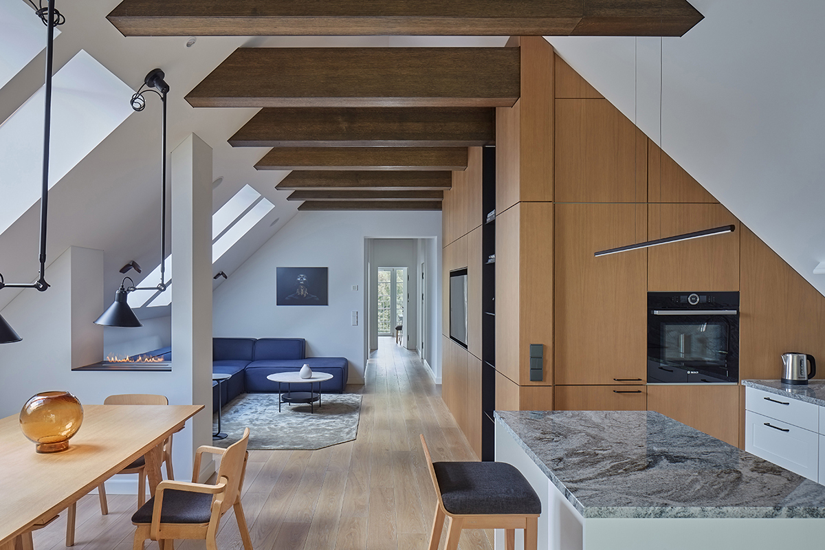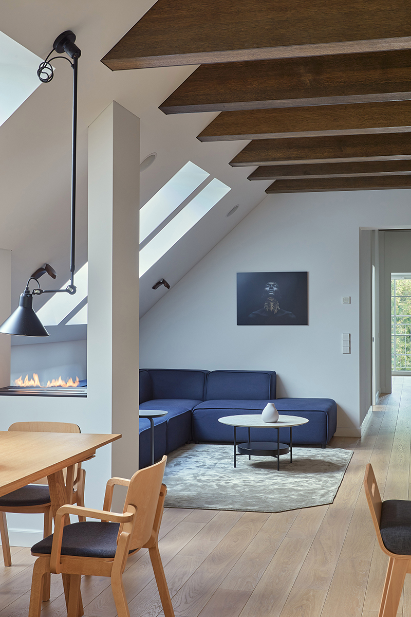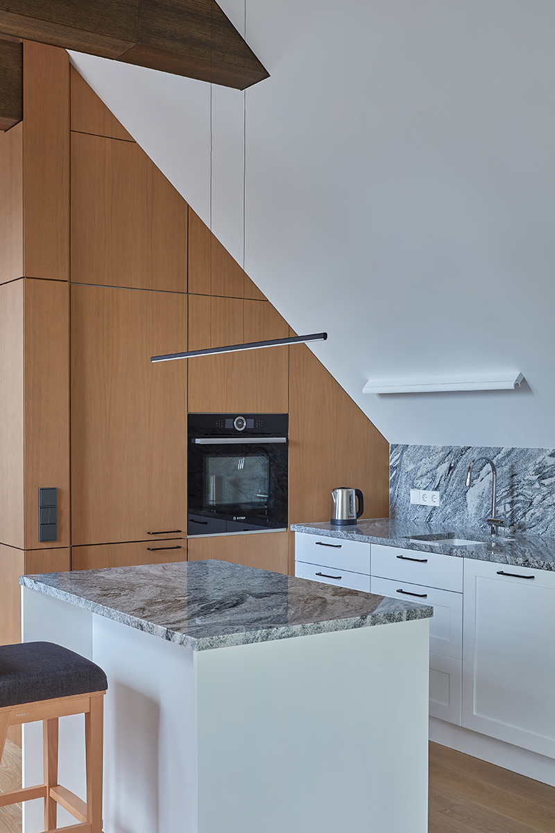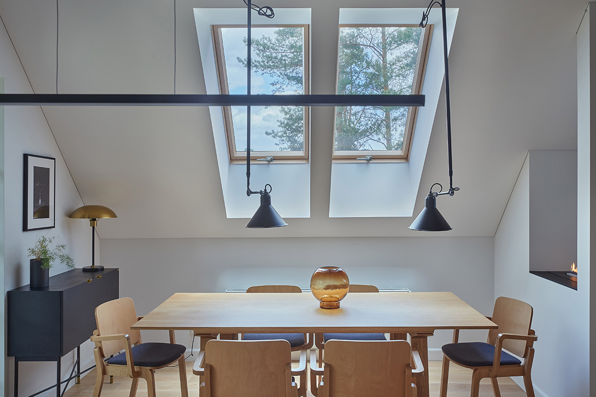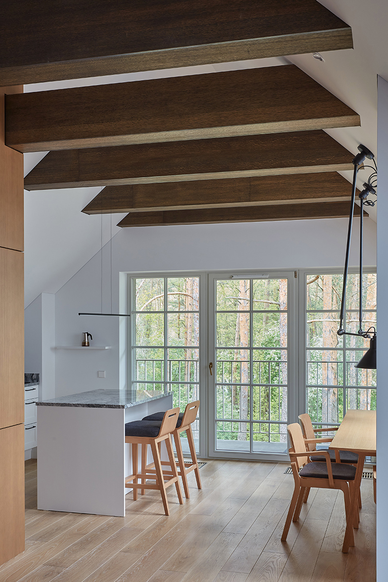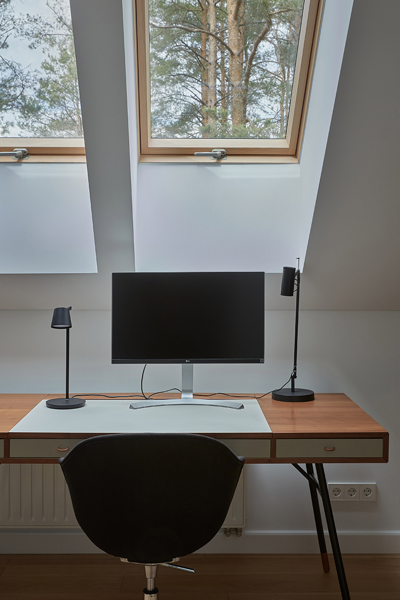 Wabi-sabi stiliumi įrengti namai išsiskiria natūralios šviesos gausa, sklindančia pro langus ir šlaitinius stoglangius. Pasakodama apie juos, dizainerė pabrėžė, kad šviesą stengėsi išnaudoti visose erdvėse. Antai svetainėje stovi gražiai apšviečiama sofa, ant kurios šeimininkai laisvai gali skaityti, dirbti ar užsiimti kitomis veiklomis natūralioje šviesoje. Virtuvės zonoje po stoglangiais specialiai įrengta valgomojo zona. Įdomu tai, kad šioje vietoje krintantis natūralios šviesos kampas padiktavo ir šviestuvų pasirinkimą. Darbo kambaryje rašomojo stalo vietą irgi nulėmė šviesos išsiskaidymas. Apskritai šis interjeras išsiskiria praktiškumo, kokybės ir estetikos derme – tai tikri šeimos namai gamtos apsuptyje.