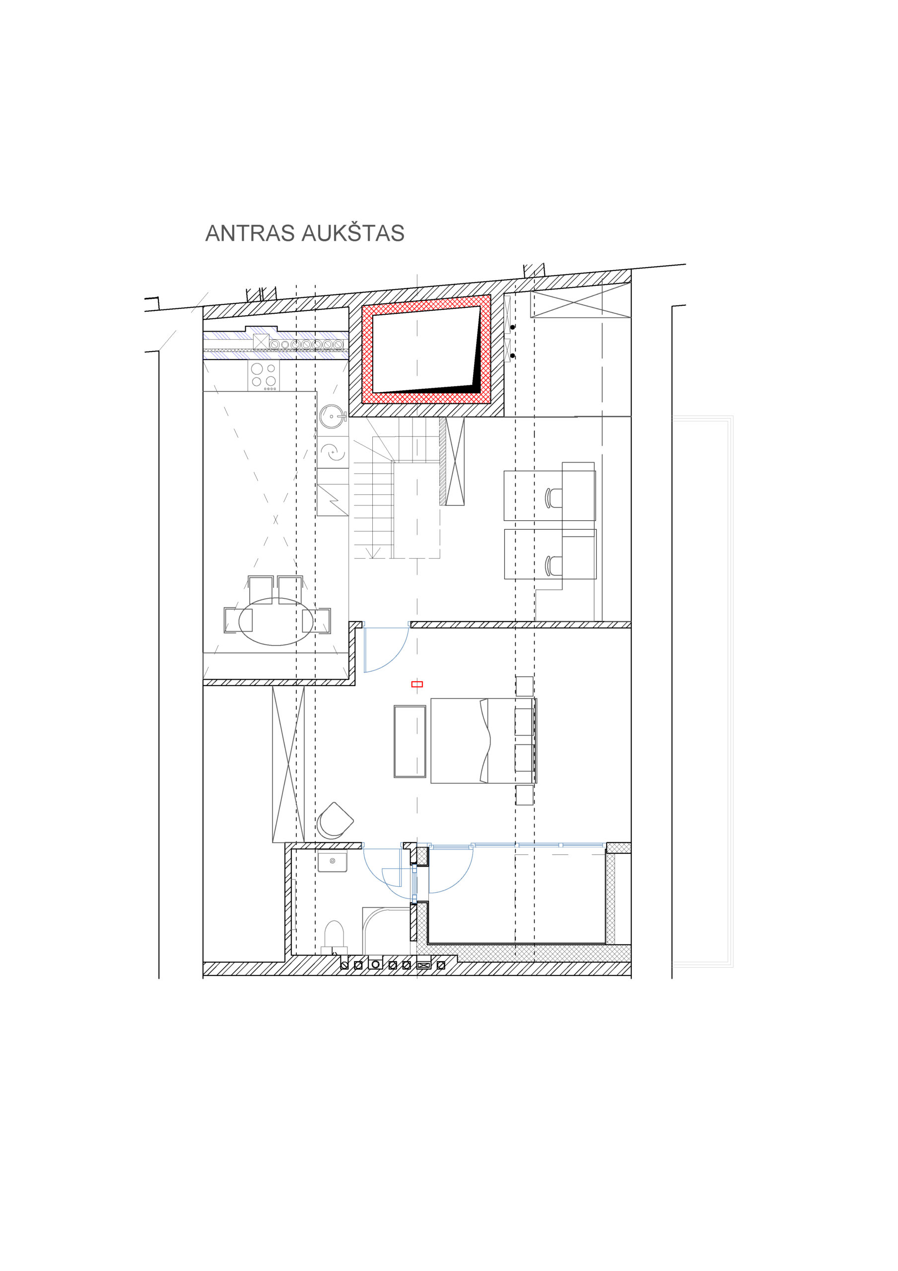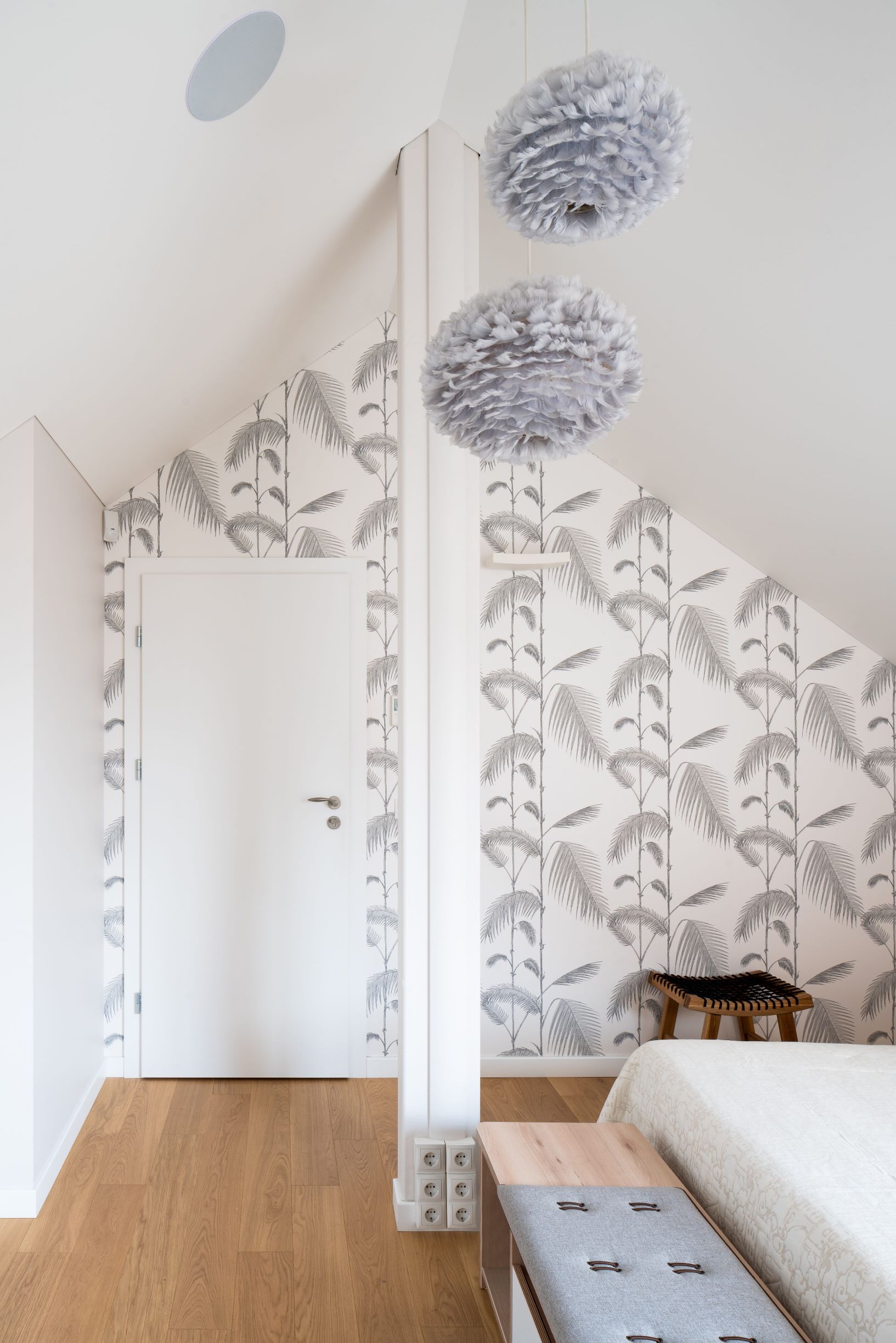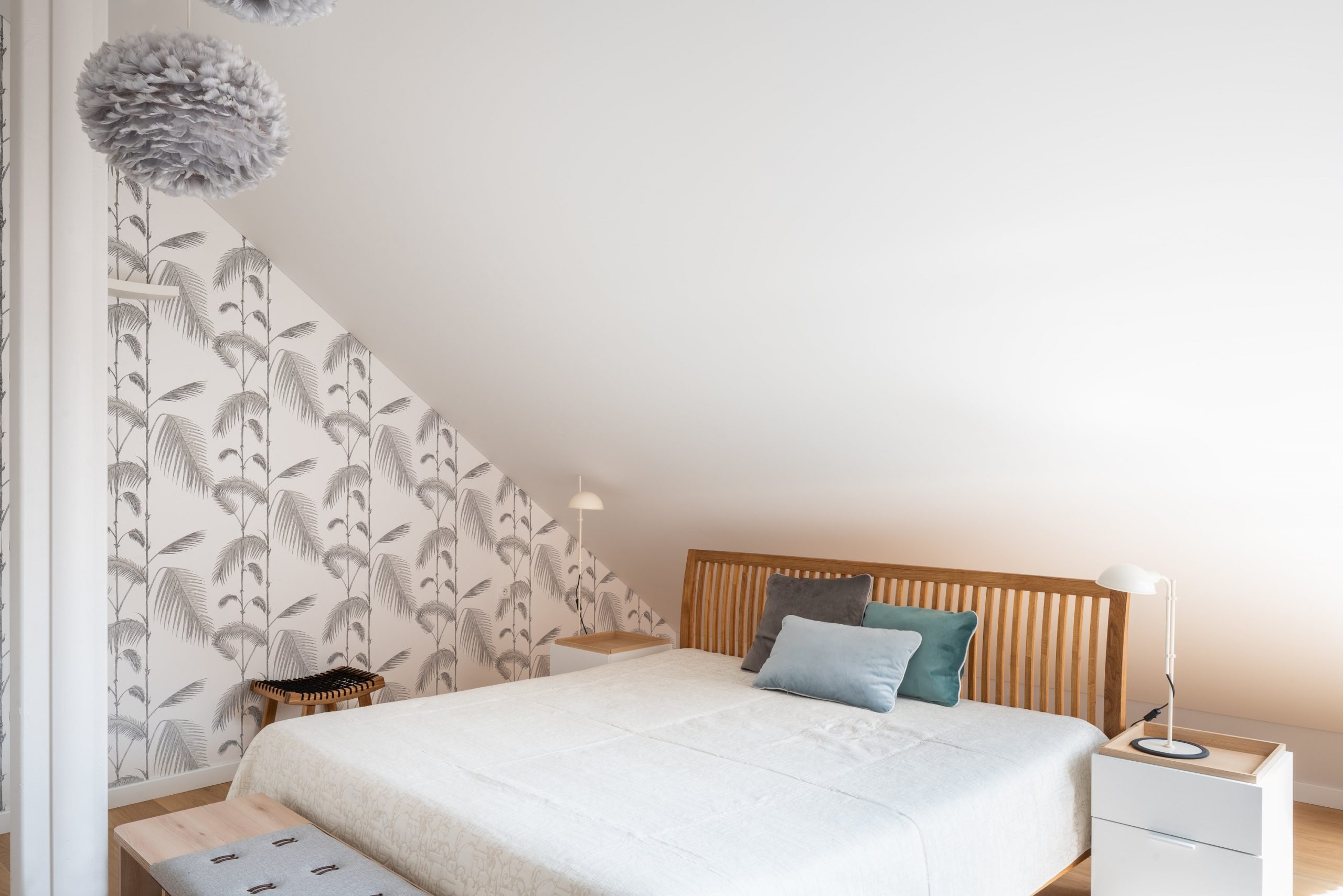 Pirmame aukšte įrengti vaikų kambariai leidžia tėvams mėgautis privatumu antrajame aukšte. Ten yra atskiras vonios kambarys bei darbo zona. Miegamojo sieną pagyvina šviesūs tapetai su palmių lapais, o jaukų apšvietimą suteikia minkšti, plunksnomis dekoruoti pilkšvi šviestuvai. Vyraujanti ąžuolo apdaila ir balta spalva leido sukurti ramybę skleidžiantį, estetišką, švarų poilsio kambarį. Šlaitinėse lubose sumontuotos durys, už jų – drabužių lentynos, tačiau taip pat išsaugota galimybė patekti į gilesnę erdvės dalį, kurioje galima laikyti retai naudojamus daiktus, kaip antai lagaminus ar sezoninę sporto įrangą. Antrame aukšte, šalia laiptų, įrengtos dvi darbo vietos, pro virš jų sumontuotus stoglangius srūva dienos šviesa. Kampe, po šlaitinėmis lubomis, vėlgi įtaisyta pertvara su durimis, už kurių slepiasi ankšta erdvė – joje galima laikyti rečiau naudojamus daiktus ar nesezoninius drabužius – visą plotą bute stengtasi sumaniai panaudoti, kad bendrose erdvėse paviršiai neapaugtų daiktais.