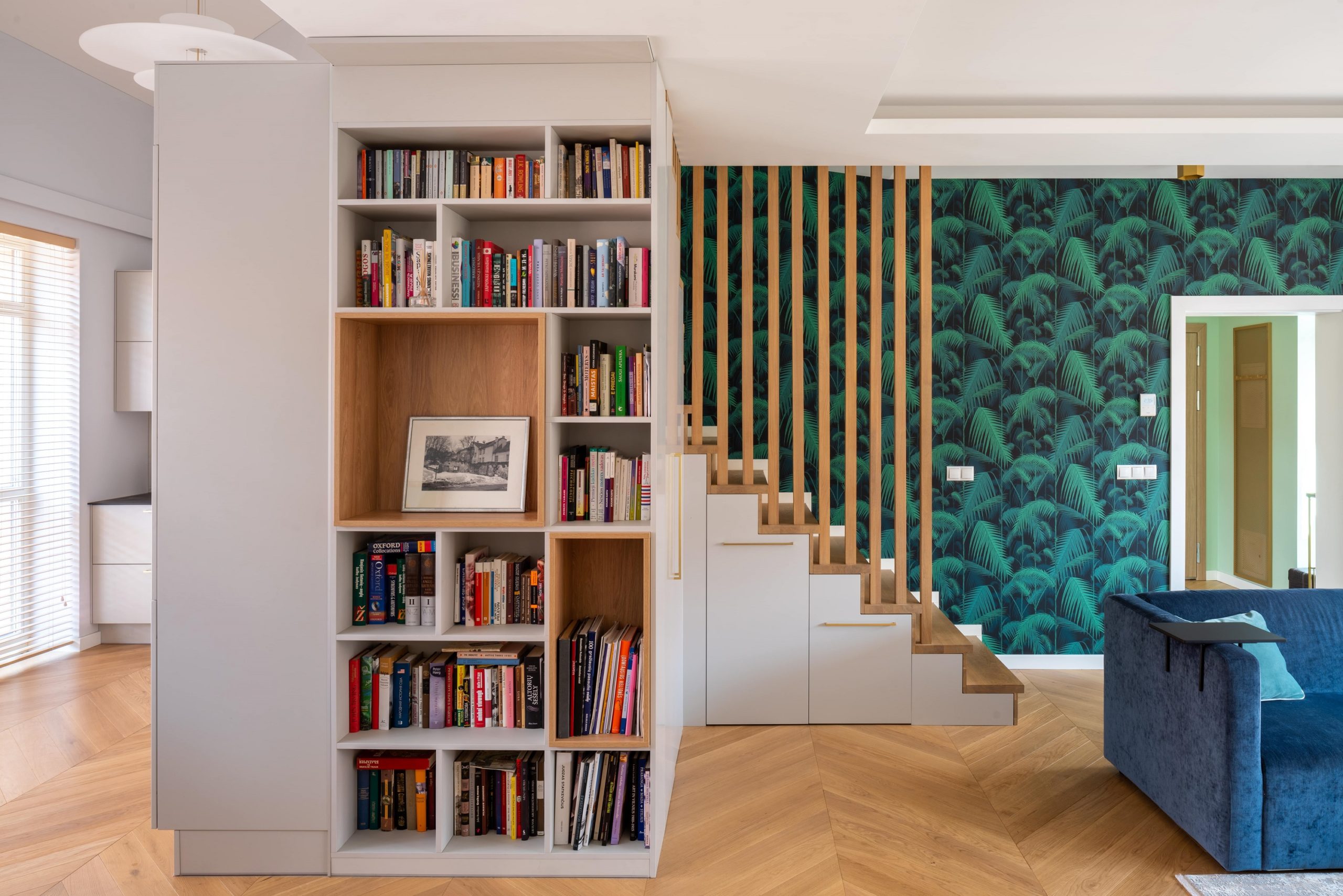 Pagrindinis erdvės akcentas – ryškūs tapetai su palmių lapais. Puikiai derantys sodriai žali atspalviai žaidžia su mėlynu sofos veliūru ir suteikia būstui gaivališkos gyvybės. Visuose namuose itin svarbi ąžuolinė apdaila. Tai – kokybės, jaukumo ir natūralumo simbolis. Būtent dėl šios priežasties laiptų apdailai bei turėklams pasirinkti ąžuoliniai tašeliai, suteikiantys svetainei dar ir įdomios ritmikos. Po laiptais suprojektuota didžiulė spinta su ištraukiamais stalčiais, kurioje telpa nemažai buities daiktų, – norėta turėti uždaromą vietą dulkių siurbliams ir šluotoms, nes kitaip šie namuose neranda vietos ir glaudžiasi už durų ar pakampėse. Virtuvės ir svetainės erdves jungia daili pilkšva knygų lentyna su dekoratyviais ąžuoliniais intarpais.
