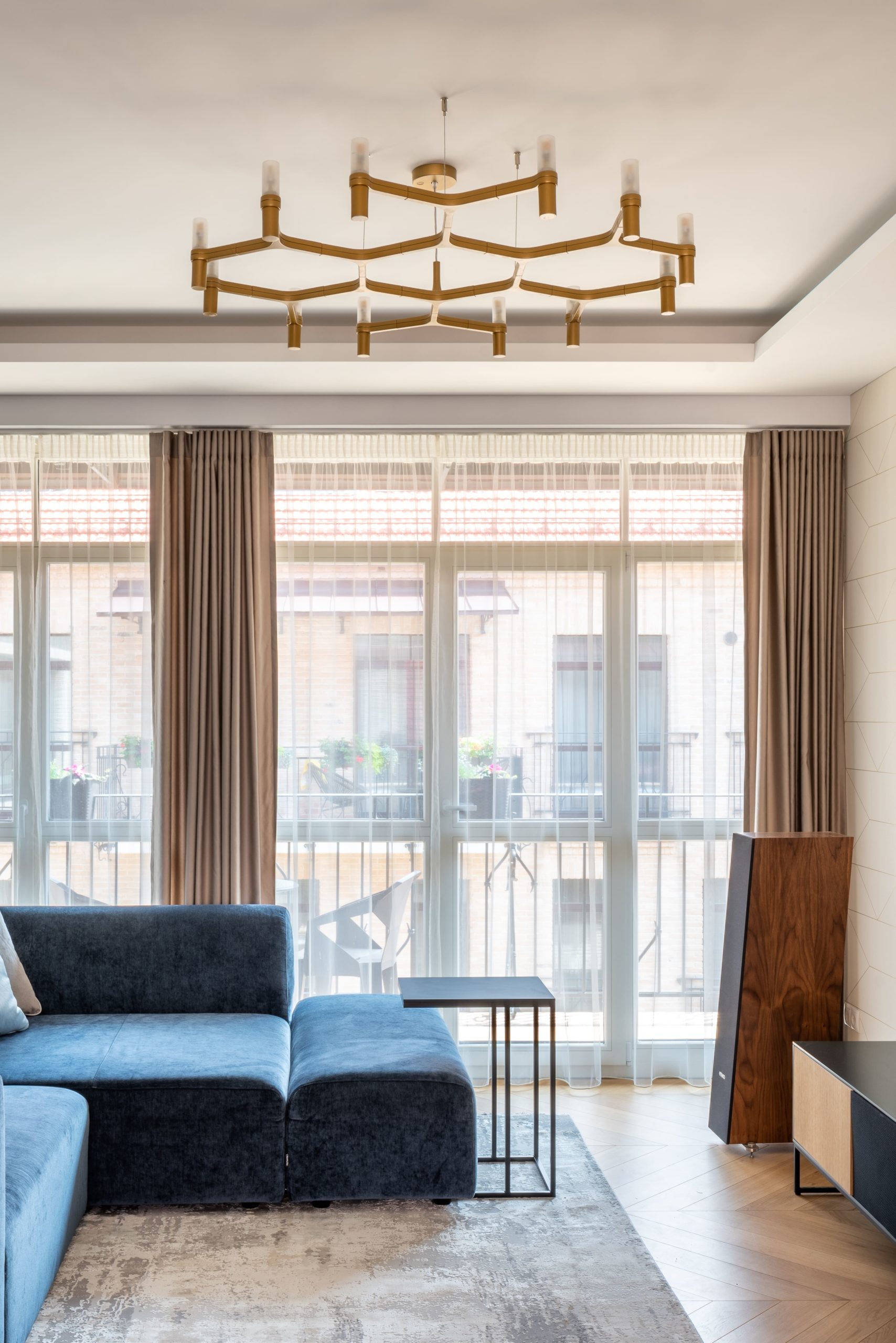 Svetainė su valgomuoju ir iš dalies atskirta virtuve – pagrindinė laisvalaikio erdvė. Jai ir buvo skirtas didžiausias dėmesys. Norėta interjerui suteikti spalvų, ryškių akcentų, gyvybės, taip pat elegantiškumo bei jaukumo. Didžiulė ir labai patogi melsva kampinė sofa su pufu leidžia gyventojams drybsoti ir jaukiai visiems kartu žiūrėti filmus, o žurnaliniai staliukai yra tikslingai nedideli, kad netaptų daiktų pasidėjimo vieta ar valgymo zona. Storesnis užuolaidų audinys pasirinktas taip, kad saulės spinduliai nešviestų į televizoriaus ekraną, o ir šiltas kakavinis atspalvis suteikia interjerui minkštumo.