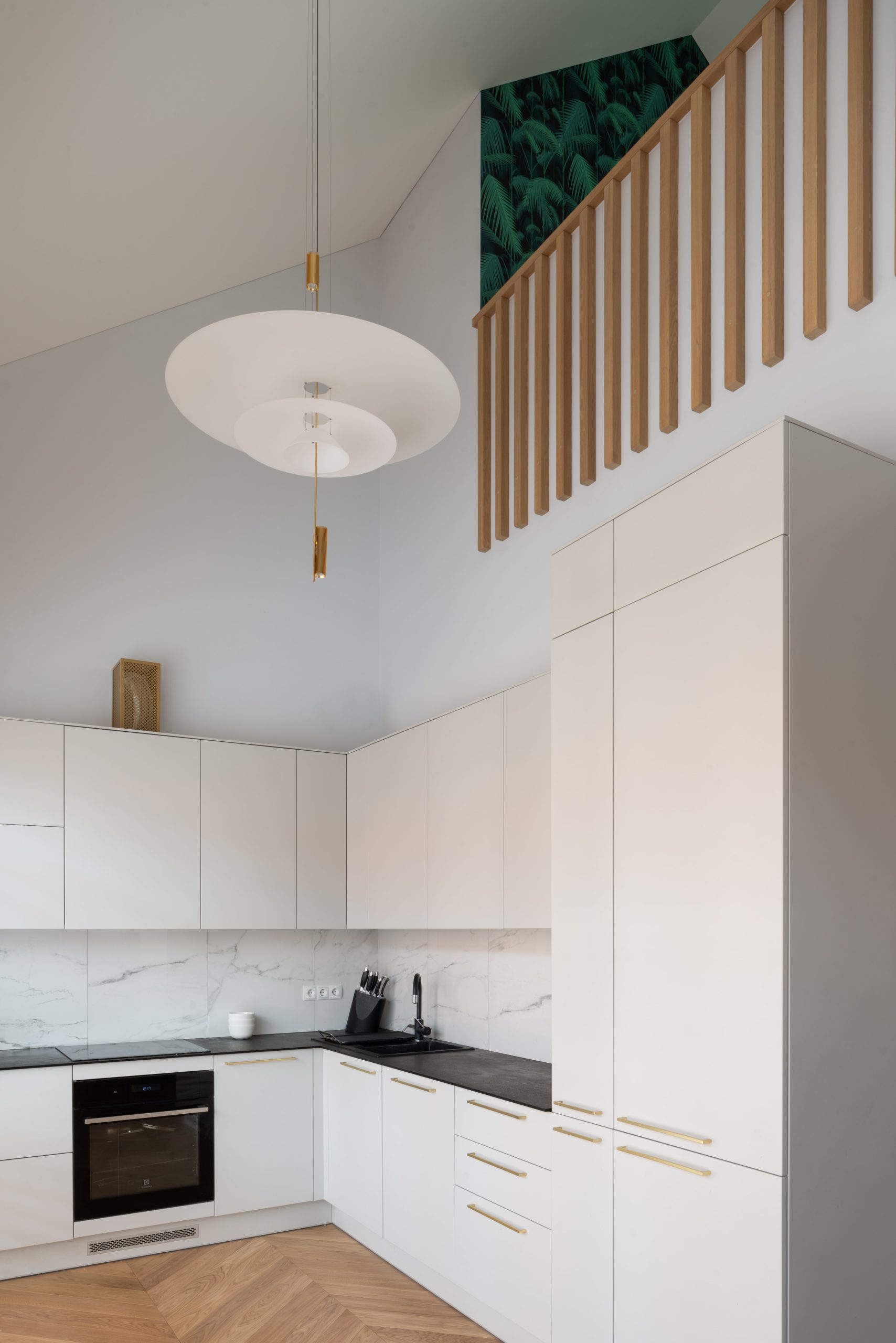 Virtuvė – švari ir balta, su itin funkcionaliais stalčiais ir lentynomis – įrengtos net didelio gabarito skardų laikymo vietos. Siena išklota dailiomis baltojo marmuro plytelėmis, o stalviršis dėl praktiškų sumetimų pasirinktas tamsus, kaip ir buitinė technika. Gartraukio vamzdžiui uždengti pritaikytos tokios pat ažūrinės grotelės kaip ir elektros skydeliams koridoriuje.