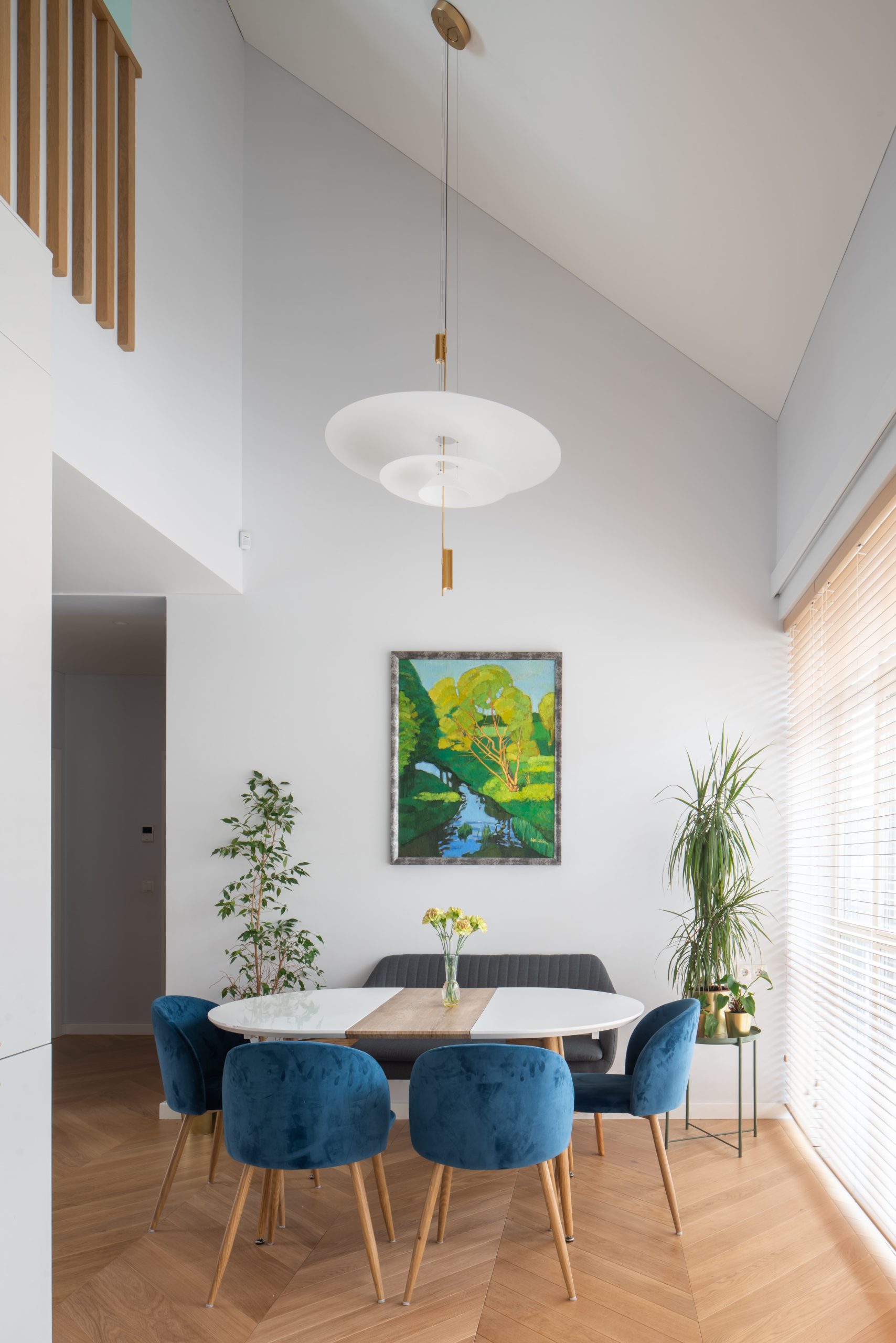 Valgomojo zonoje stovi ovalus išskleidžiamas baltojo marmuro stalas su ąžuoliniu intarpu. Šalia jo – elegantiškos, mėlynu veliūru trauktos kėdės ąžuolinėmis kojelėmis bei minkštasuolis, mat prie šio stalo ne tik valgoma, bet ir žaidžiami stalo žaidimai. Langus dengia plačios medinės žaliuzės. Jos sukuria privatumo pojūtį ir puikiai apsaugo nuo saulės, be to, atrodo itin dailiai. Tiek svetainės, tiek virtuvės erdvėse vienu pagrindinių interjero akcentų tapo įspūdingi šviestuvai. Žalvariniai elementai suteikia ryškiaspalviam būstui subtilios prabangos, o originalios formos užpildo aukštos erdvės kompozicijas, papildo interjerą „skaniu“ akcentu.