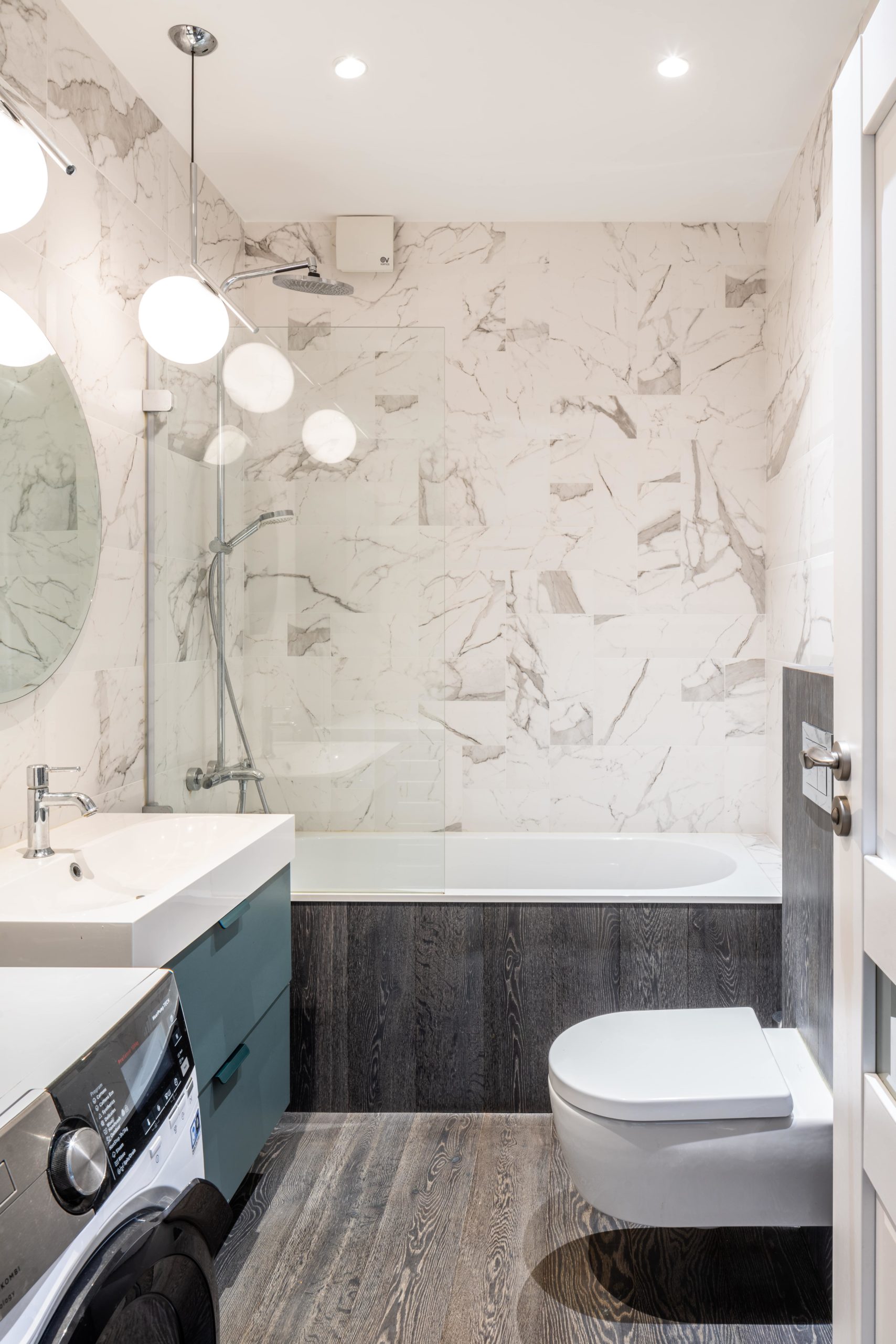 Vonios kambario grindims, voniai ir tualeto bakeliui dengti buvo pasirinkta vandeniui atspari tamsinta mediena, o sienos puoštos didelio formato baltojo marmuro akmens masės plytelėmis. Akcentinė siena išklijuota skirtingo dydžio, nedidelį reljefą turinčiomis tos pačios kolekcijos plytelėmis. Abipus veidrodžio, prie lubų, pritvirtinti puikaus dizaino šviestuvai. Šioje patalpoje vyrauja chromas, labai derantis prie šalto atspalvio melsvos spintelės su praustuvu.