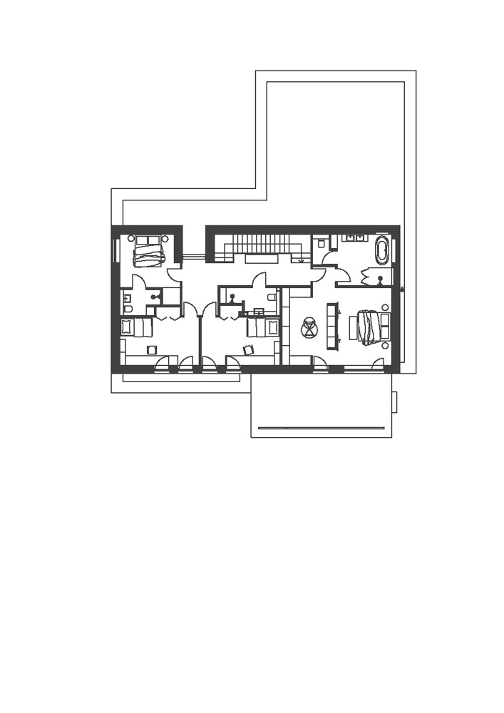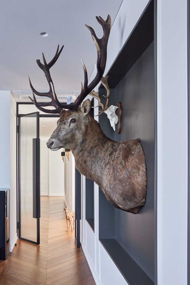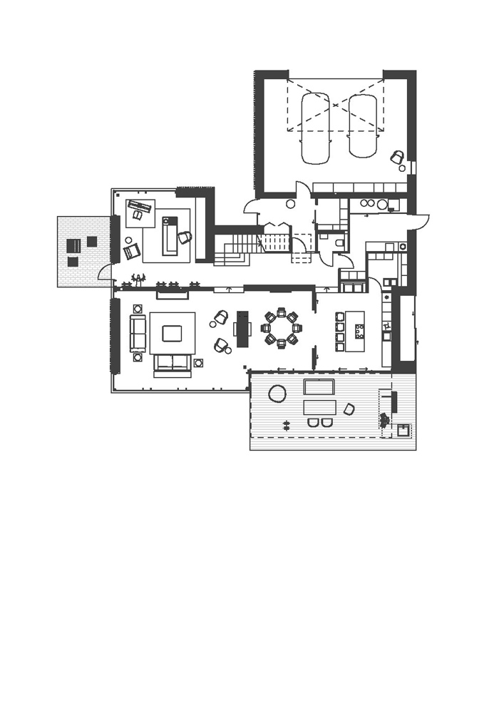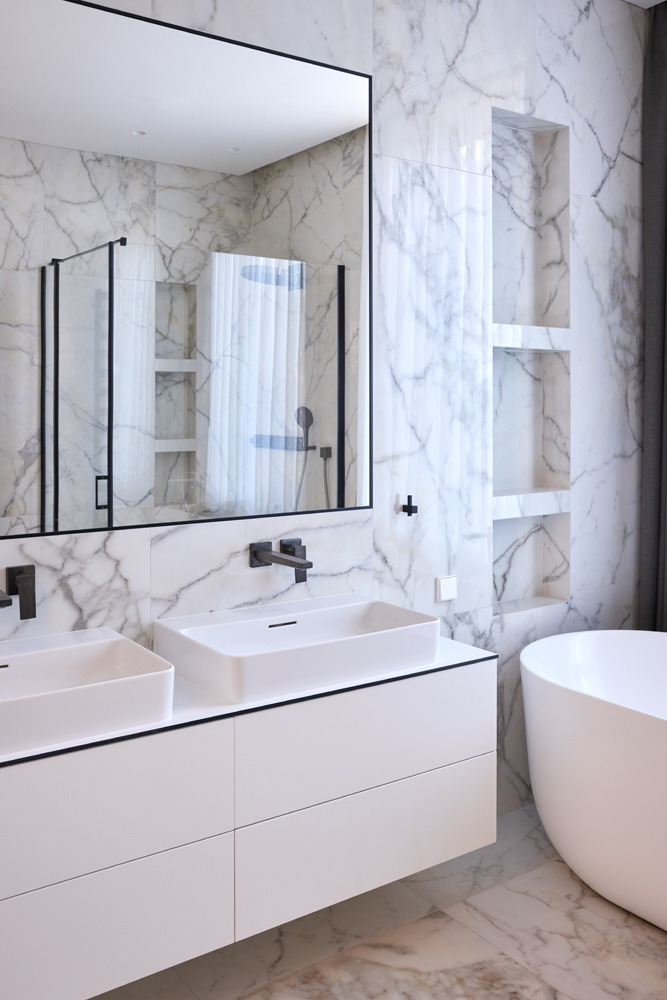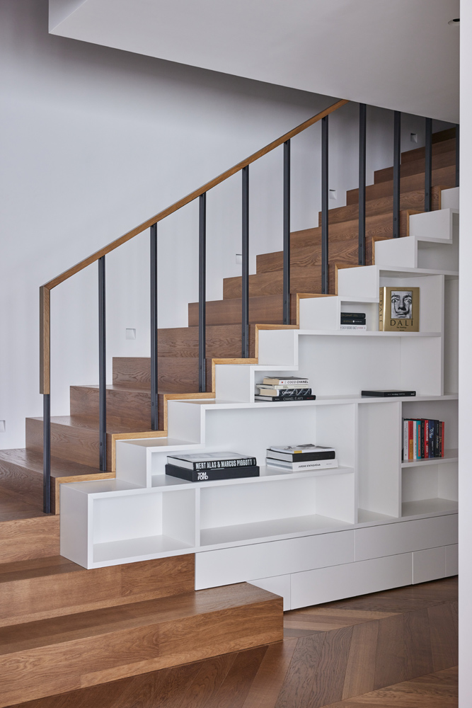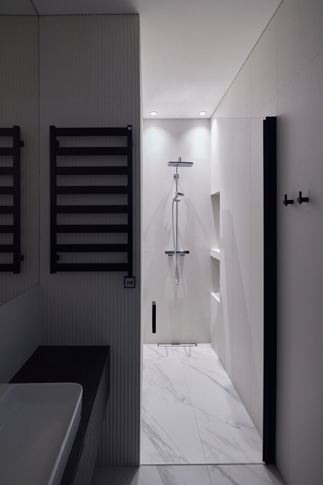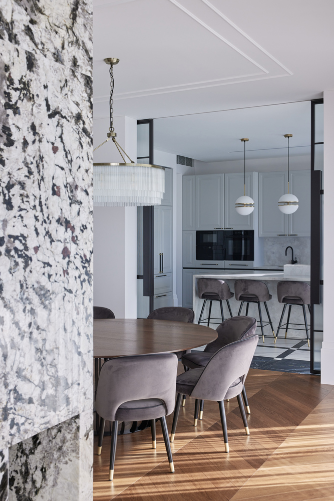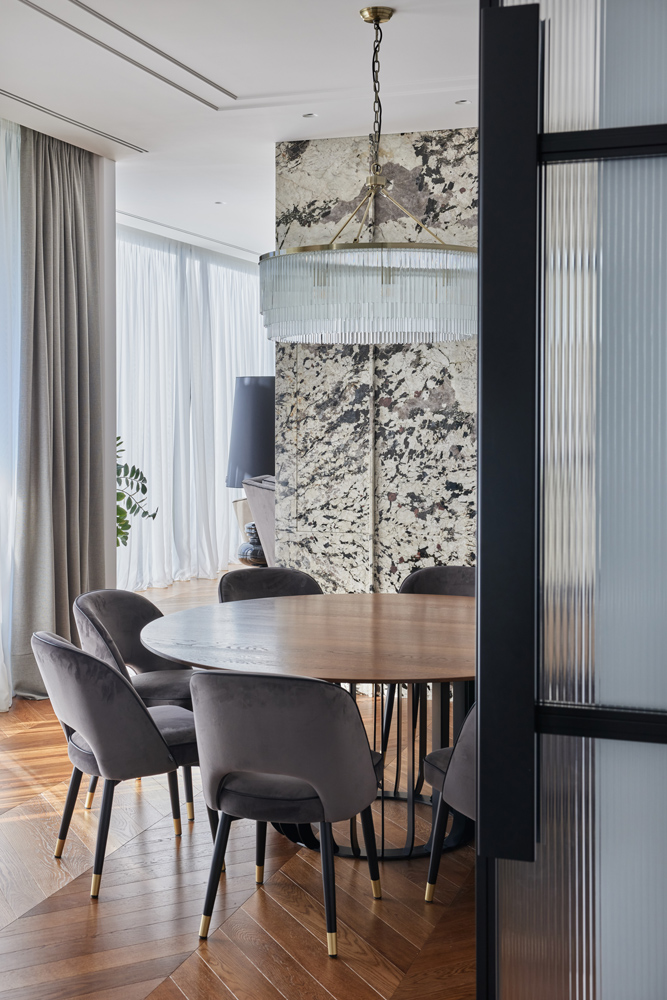 Erdvių bendrumas sukurtas tolygaus medžiagiškumo pagalba. Bendrose erdvėse, kambariuose pasirinktas „chevron“ tipo parketas ir baltos spalvos sienos derinami su uolienomis – marmuru ir granitu.
