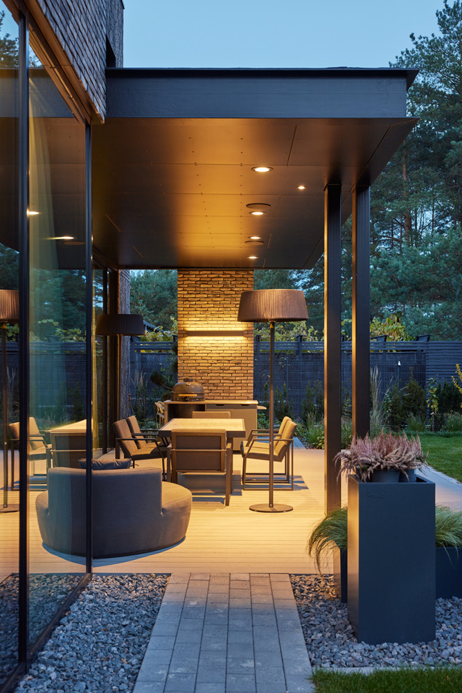 Centrinis namo interjero objektas – židinys, jungiamoji valgomojo ir svetainės zonų, apdailintas tapybiško rašto akmens apdaila.