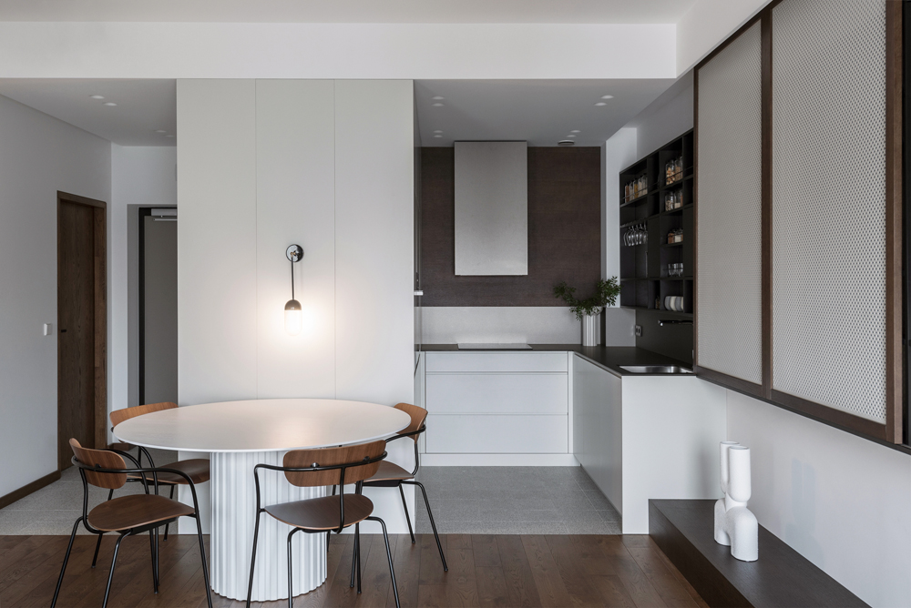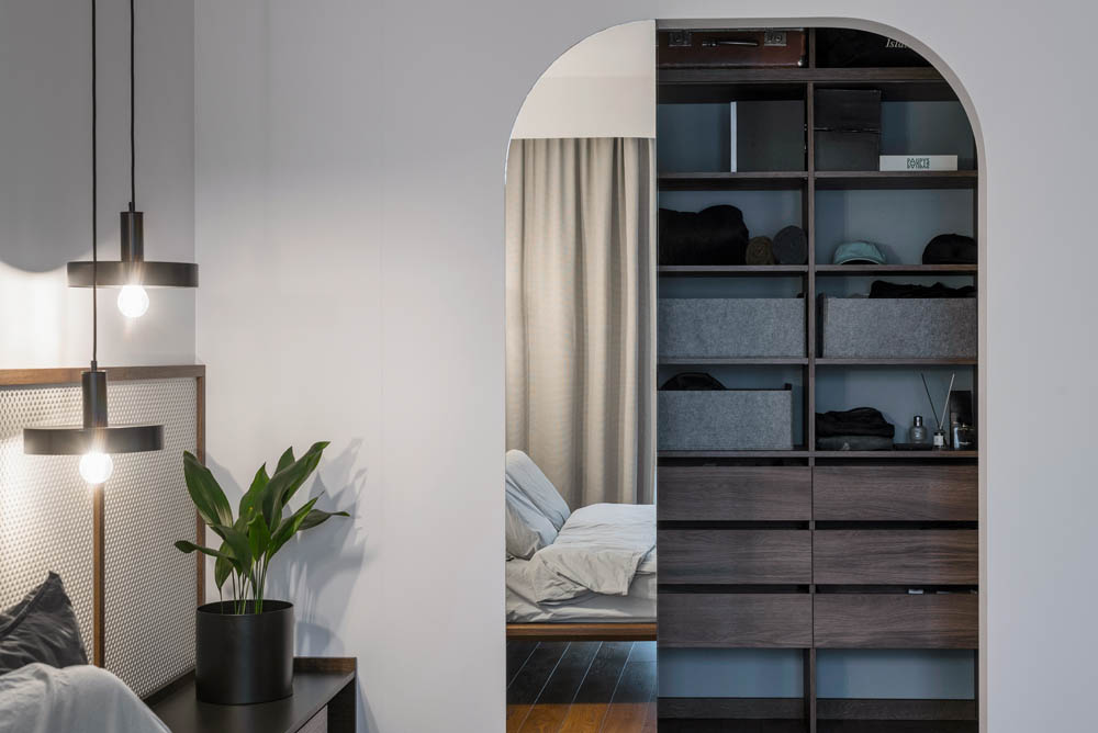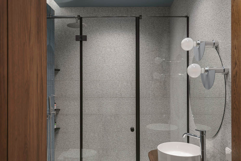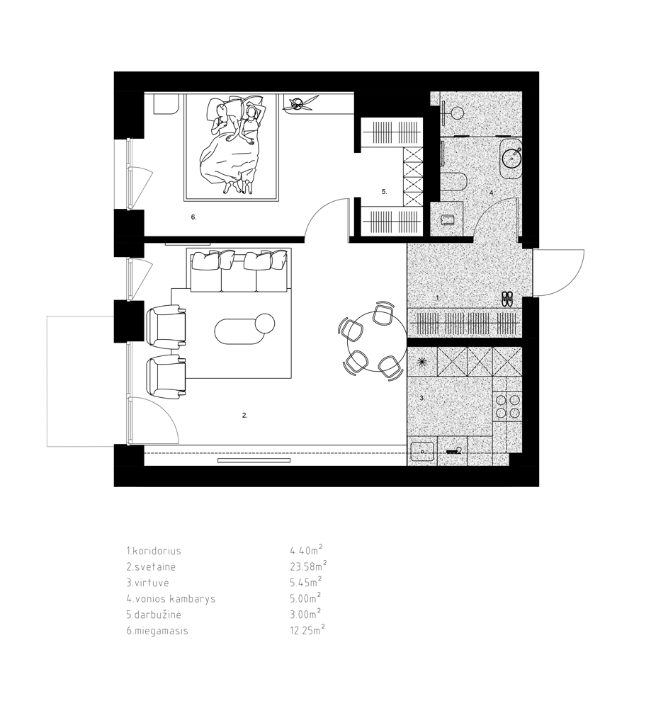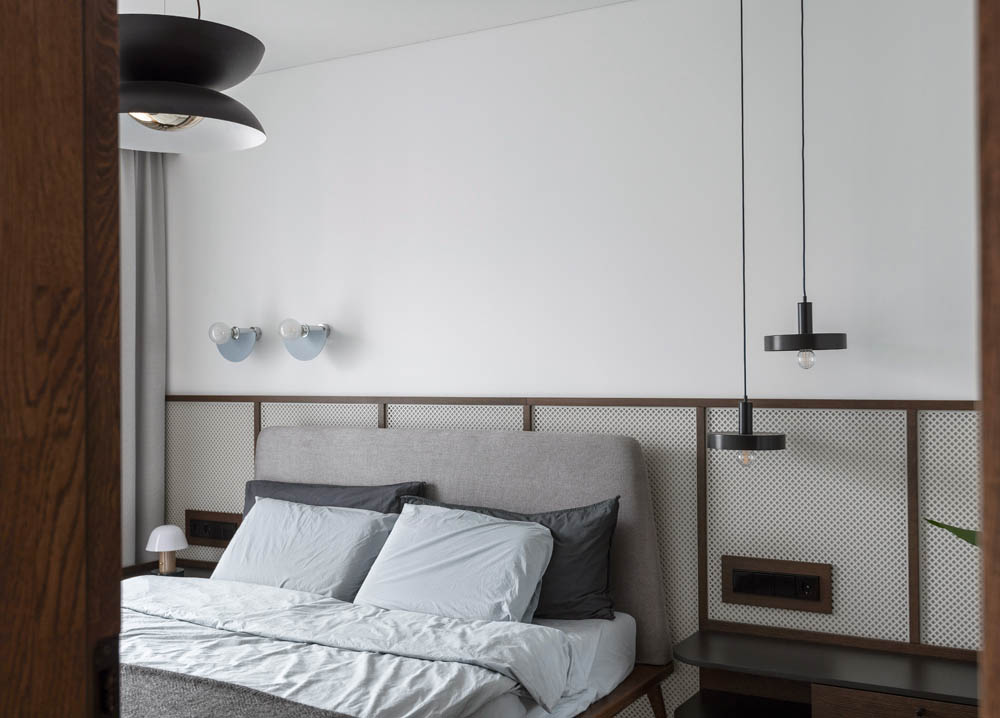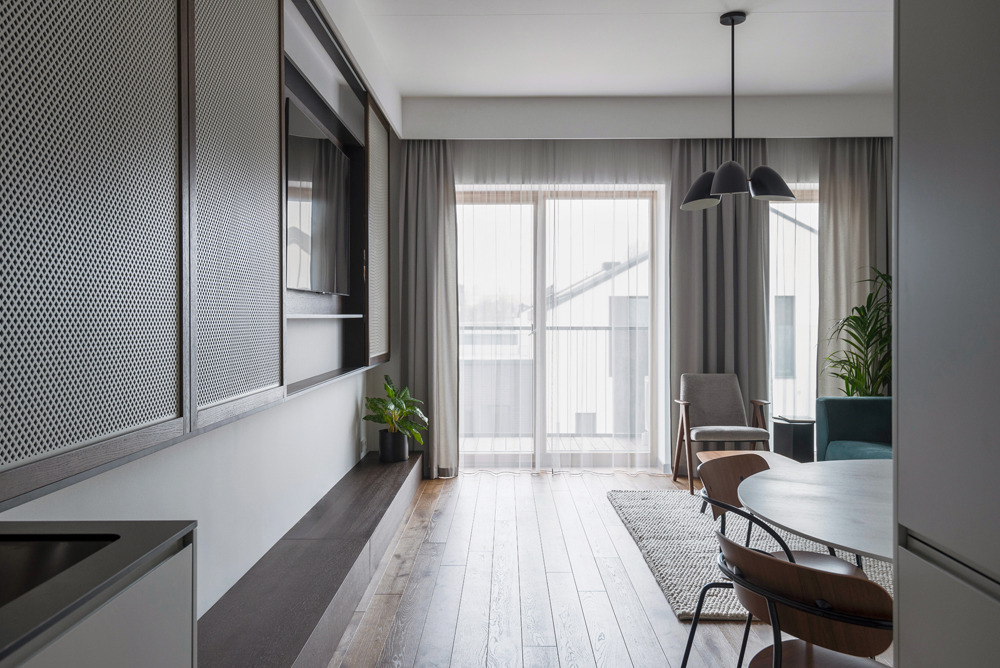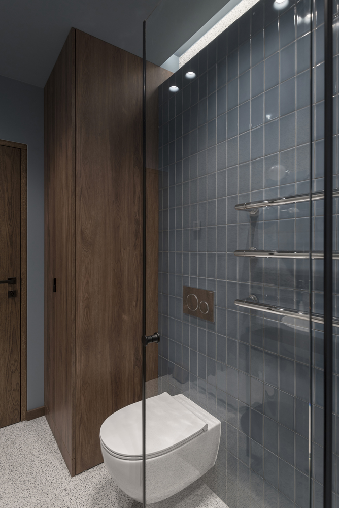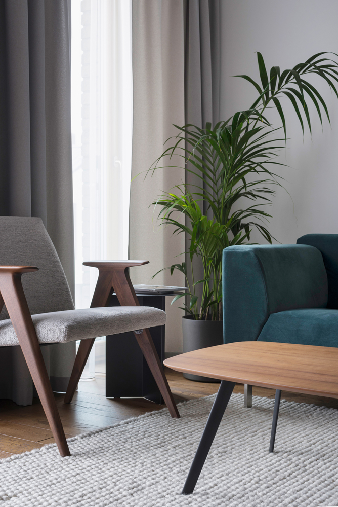 Jauno vyro buto interjerą įkvėpė Midcentury stilius ir šalia tekanti Vilnelė. Užsakovas norėjo, kad namai atkartotų praėjusio amžiaus vidurį. Nusprendėme ne kopijuoti, o interpretuoti – Midcentury stilistiką perteikti naujai, kad būstas primintų ne močiutės butą, o jauno modernaus žmogaus namus. Taip atsirado originalios ir praktiškos miegamojo dekoracijos, fotelis, tik užsimenantis apie garsiuosius Cukermanienės krėslus, o virtuvė, derinant skirtingas medžiagas, suprojektuota švari, bet žaisminga. Interjerą užbaigia mėlyni akcentai, kurie kasdien primena, kad netoliese teka upė.