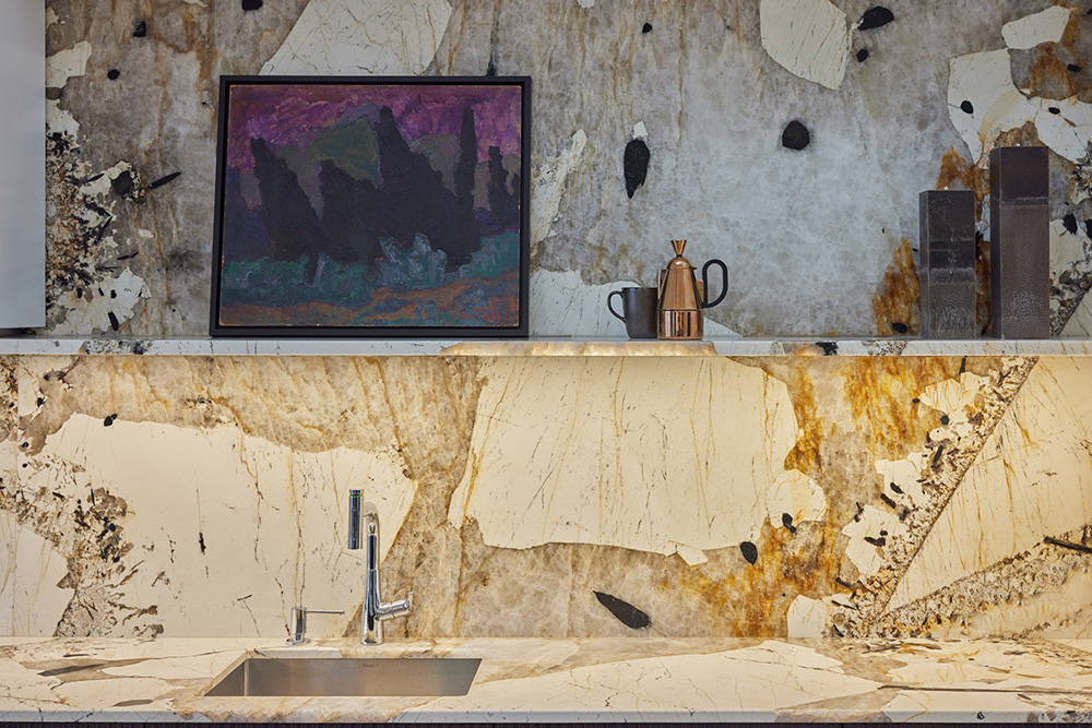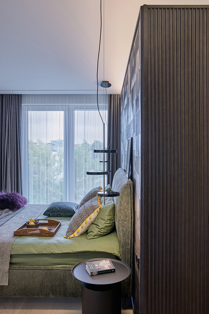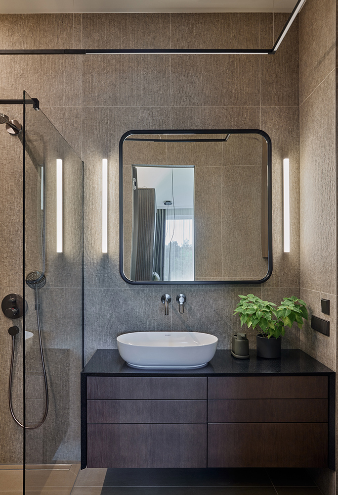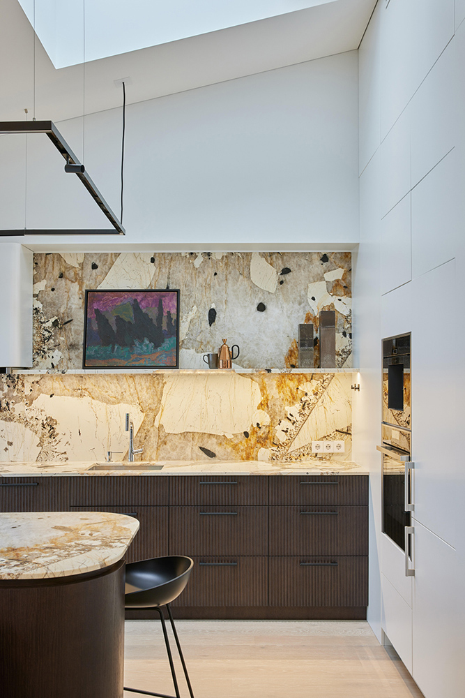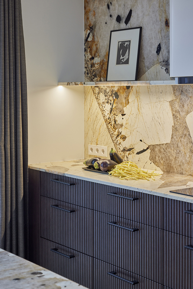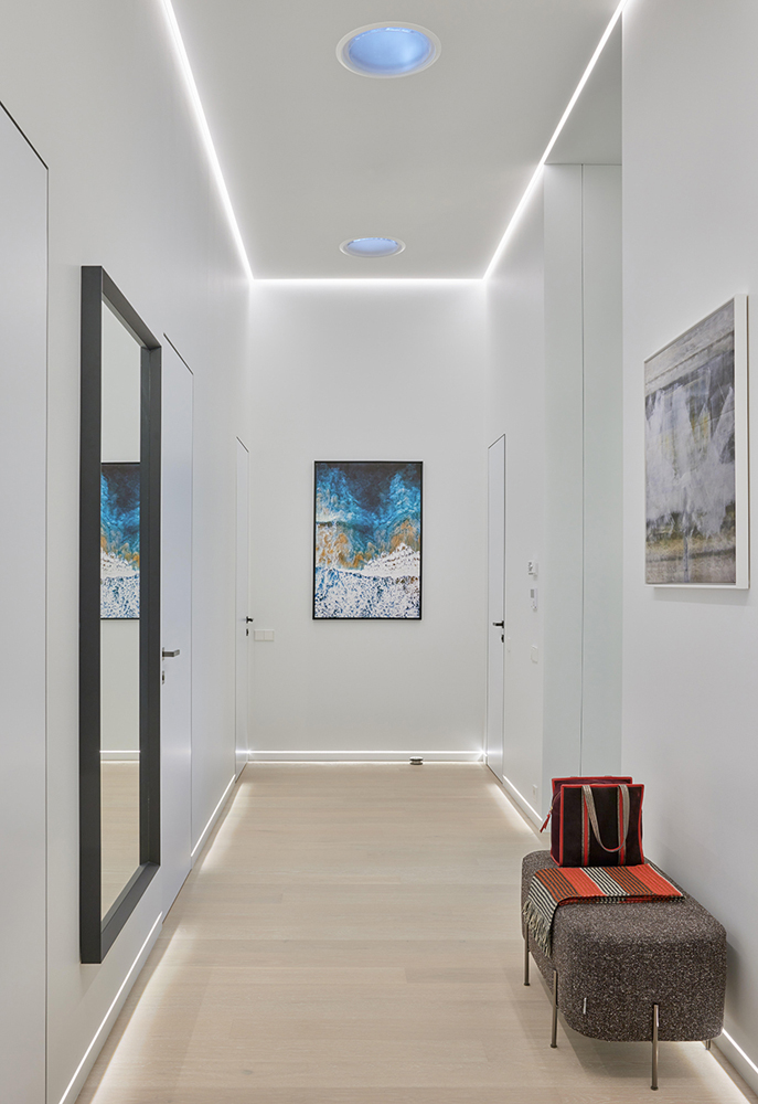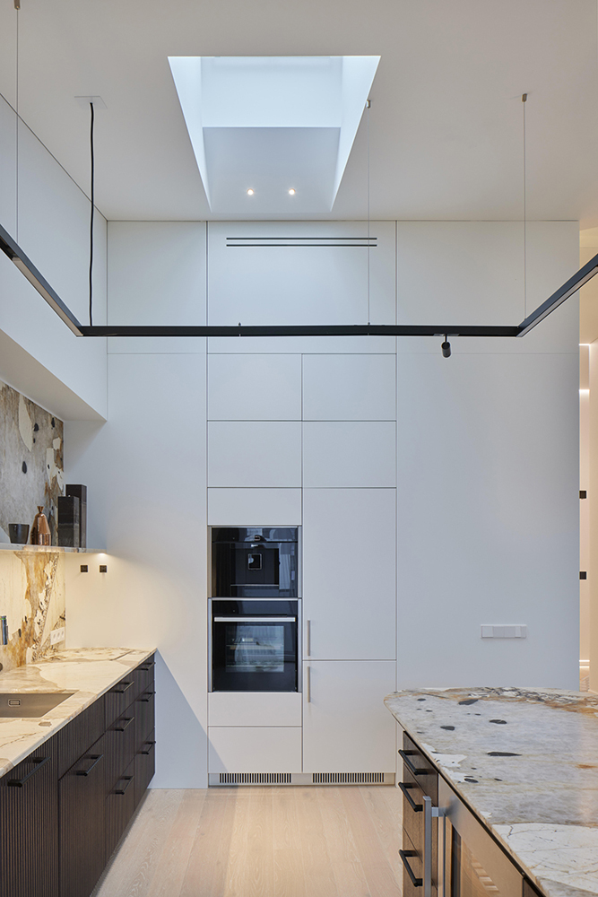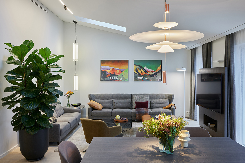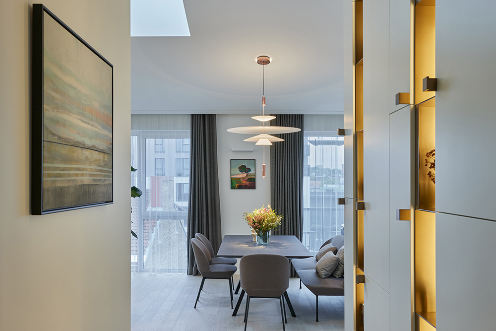 Palėpinis butas naujos statybos name imponavo savo aukštom erdvėm. Neįprastai aukšta palėpės erdvė įkvėpė saikingam ir apgalvotam medžiagų pasirinkimui ir minimalistiniam dekoravimui. Ypatingai svarbią reikšmę suteikėme natūraliai šviesai, dirbtiniam apšvietimui, bei medžagų faktūroms ir jų santykiui interjere. Sąmoningai virtuvės sala, bei netradicinis valgomasis užėmė svarbiausią gyvenamosios erdvės dalį ir tapo funkcine ašimi, bei šeimos gyvenimo centru.