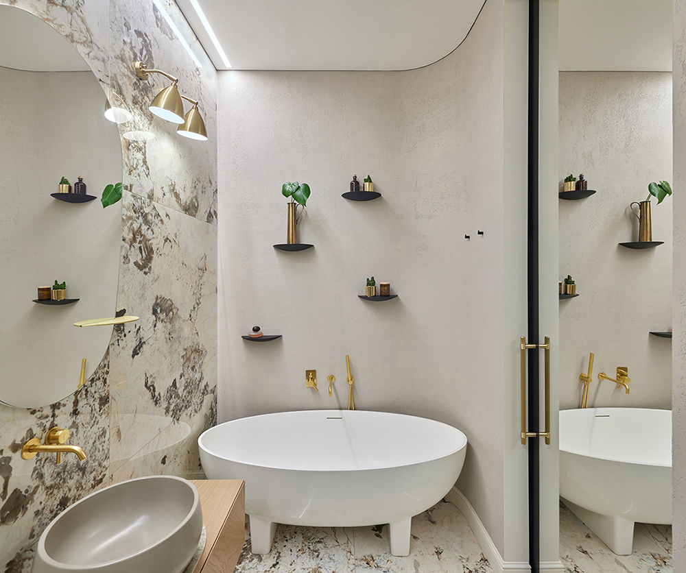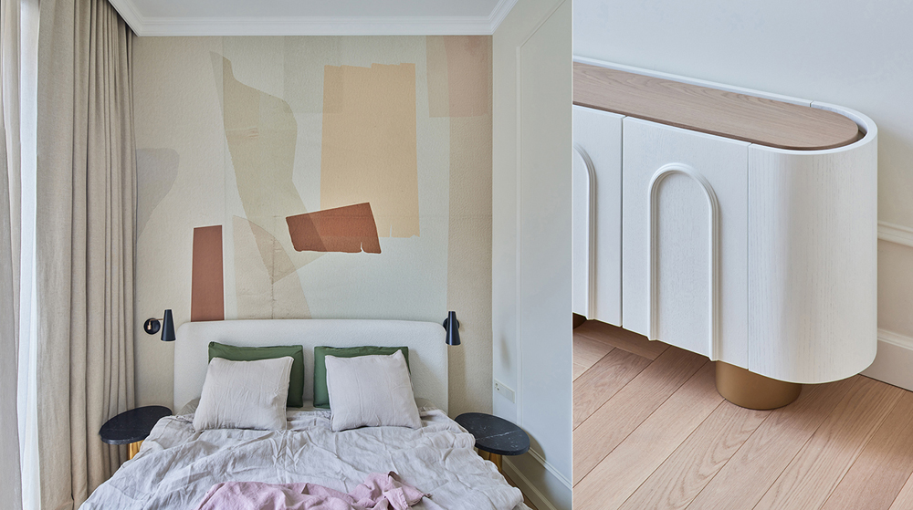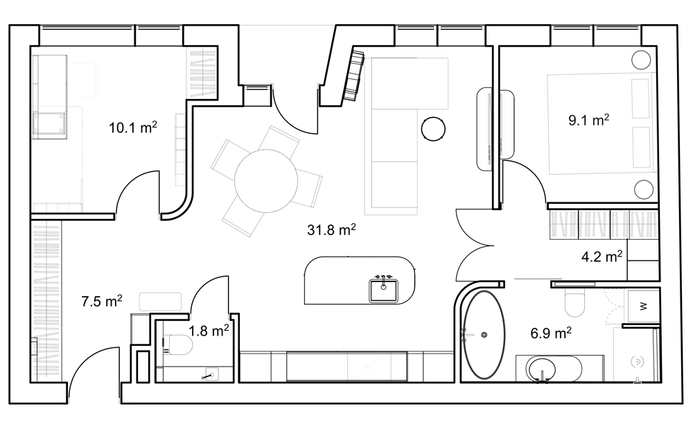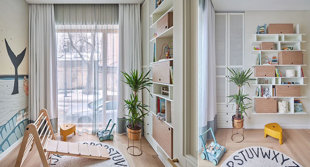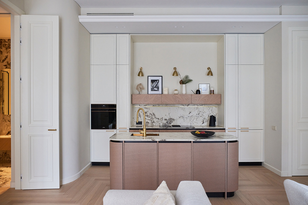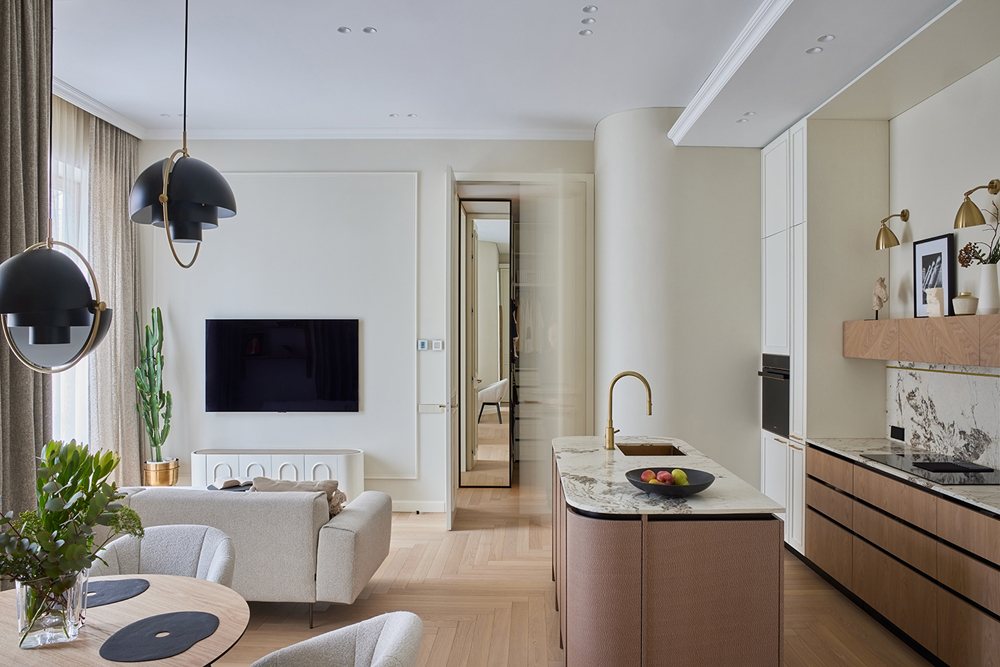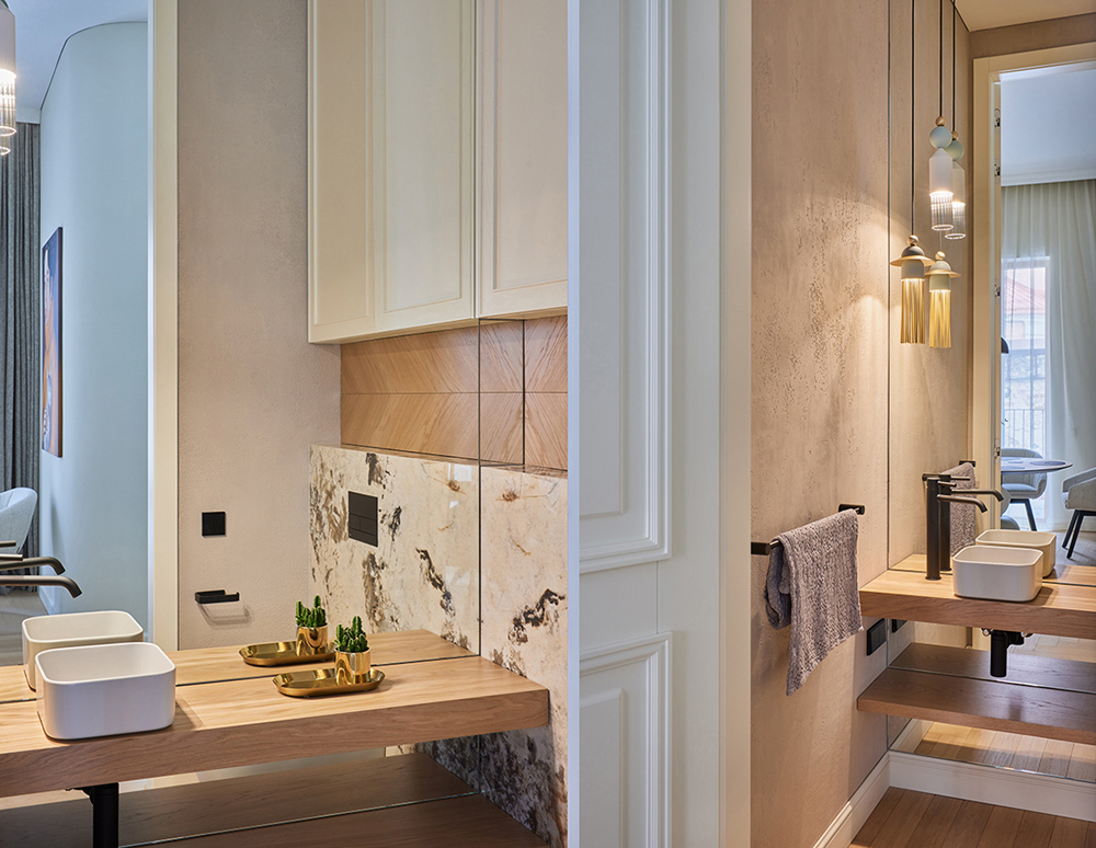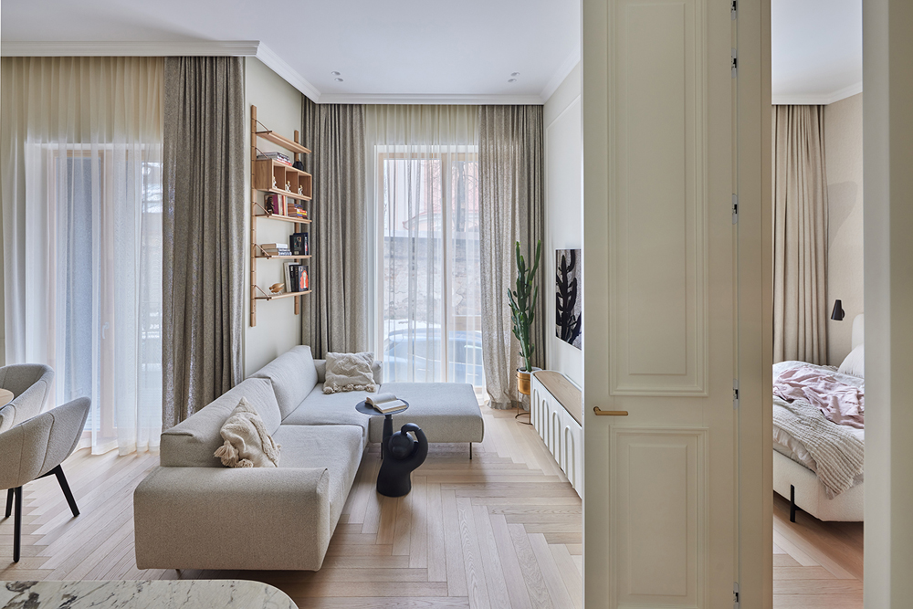 „Kuriant šio buto interjerą iš pradžių įvertinau jo pagrindinius privalumus: puiki buto vieta Vilniaus senamiesčio širdyje, nuostabios rausvos bažnyčios vaizdas pro langus, aukštos erdvės lubos bei dideli vitrininiai langai. O tada teko išspręsti klausimą, kaip šioje sąlyginai nedidelėje nuostabioje erdvėje sutalpinti, svetainę, virtuvę, miegamąjį, vaiko kambarį, privatų vonios kambarį su drabužine bei svečių tualetą – ir kas svarbiausia, visa tai sutalpinti taip, kad namai vis dar liktų erdvūs, saulėti ir jaukūs. Teko pasitelkti visą architektūrinę išmonę, skaičiuoti centimetrus, sukti galvą kaip paslėpti inžinerinius sprendimus, kurti tik šiai erdvei tinkančius baldus. Ir galiausiai „vuale“ – štai jums puikūs, senamiesčio dvasia alsuojantys, jautrūs, natūraliomis medžiagomis išpildyti, patogūs bei šiek tiek Prancūzija kvepiantys jaunos šeimos namai“, – interjero dizainerė Ieva Prunskaitė.