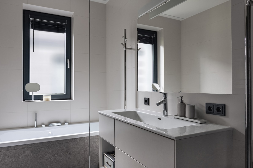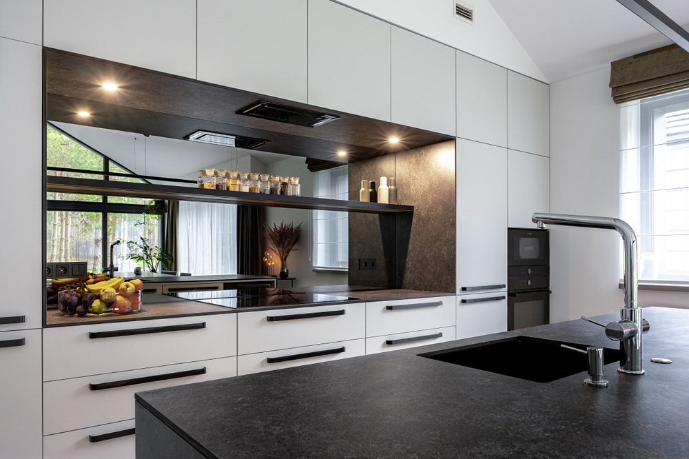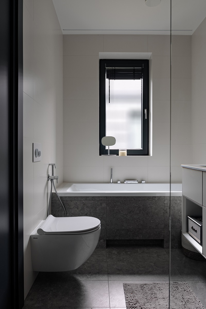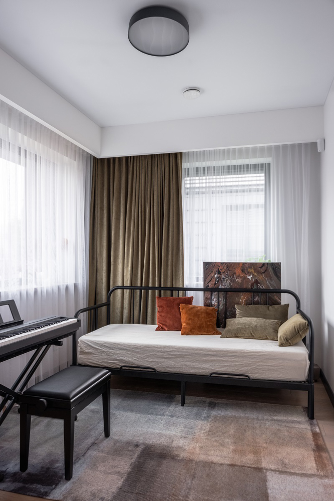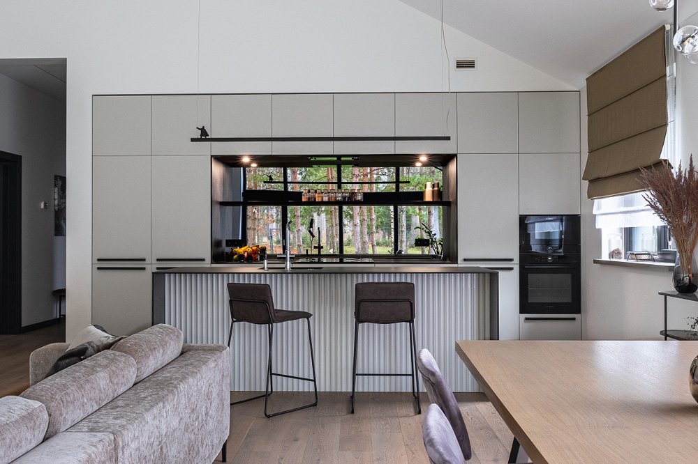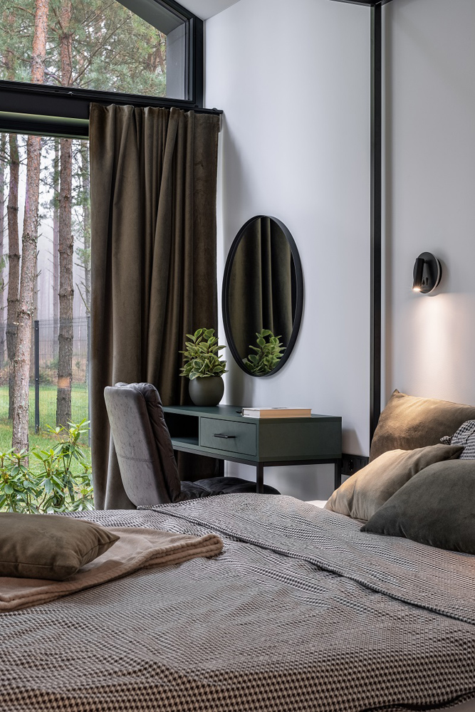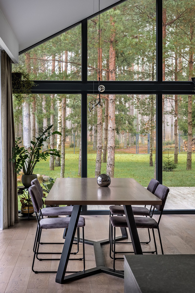 Paprastas ir santūrus, neužgožiantis į namus įžengiančios gamtos, interjeras. Šių išskirtinėje vietoje iškilusių namų kūrimą interjero dizainerė sulygino su santūrumo paieškomis. Nors ramios ir autentiškos erdvės atrodo sukurtos lengva ranka, realybė šiek tiek kitokia – norint įrengti estetišką paprastą būstą teko įdėti nemažai pastangų. Būsto stilių kurėja įvardija kaip kompleksišką minimalizmą su skandinaviško stiliaus prieskoniais. Namuose nestinga erdvės, geometrinių formų ir asimetrijos, dominuoja vienspalvė spalvų paletė. Įspūdį kelia ir akcentu tampa dideli langai, atveriantys vaizdą į pušyną.