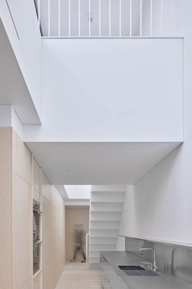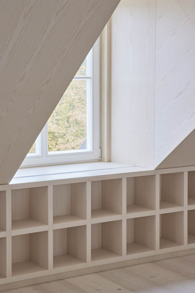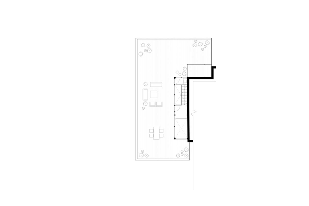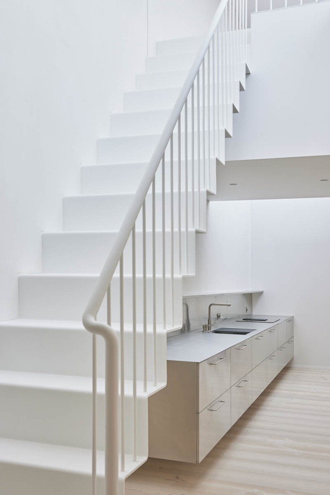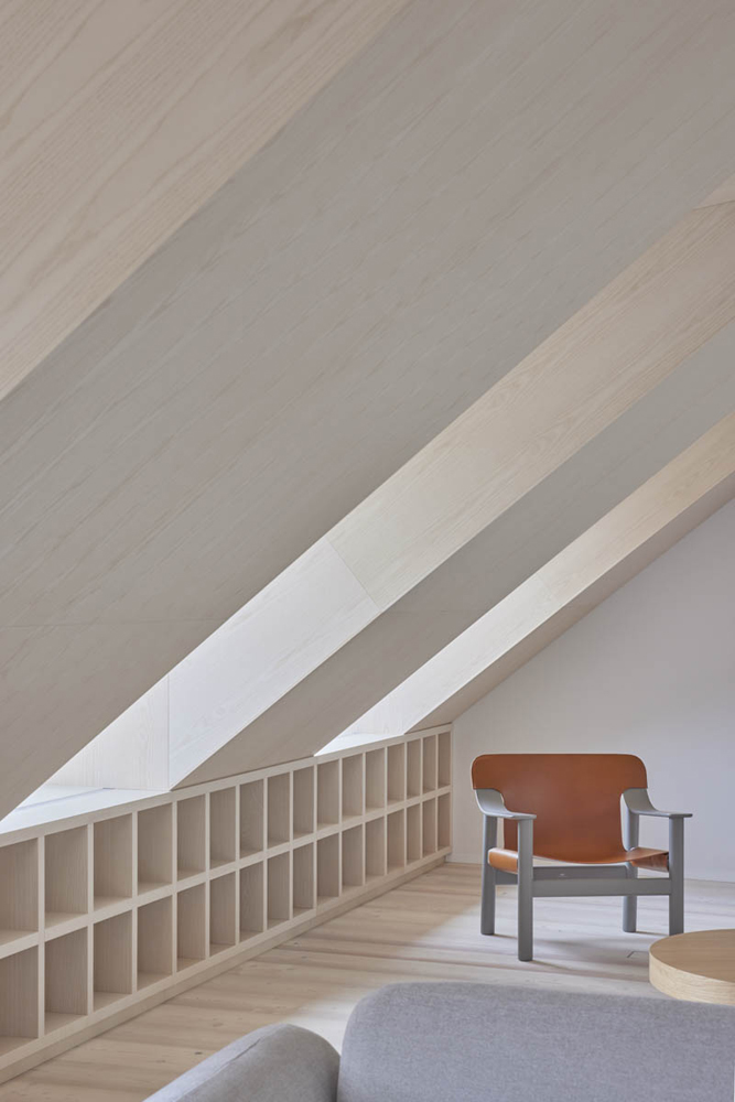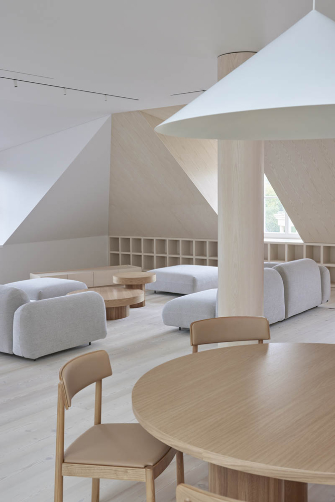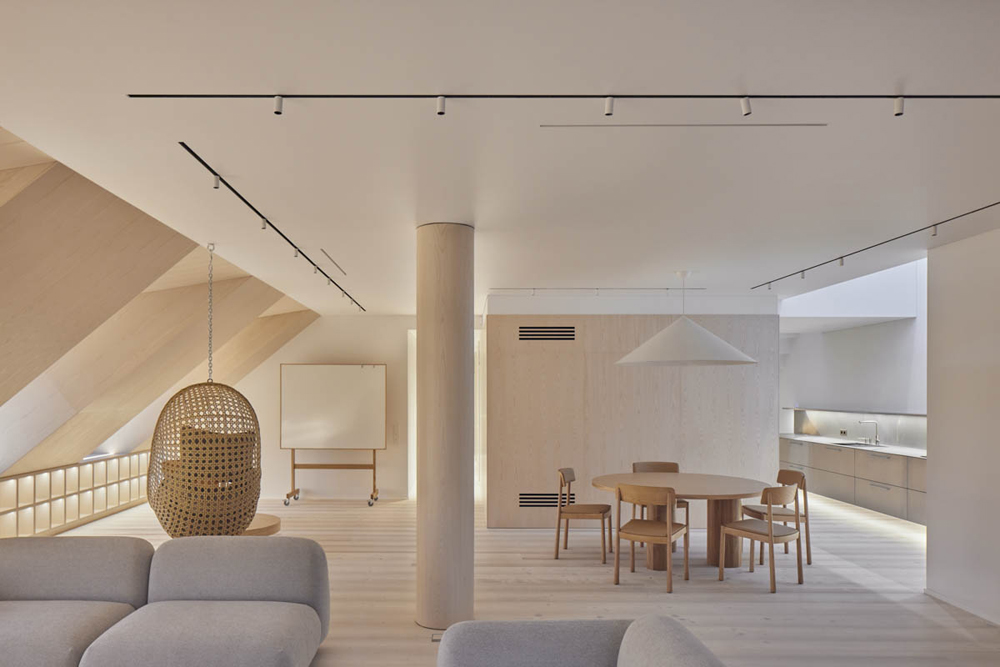 Išėjimas į stogo terasą atveria šviesą į tamsiausią buto dalį. Čia greta laiptų suprojektuota virtuvė, užlieta natūralia šviesa. Virtuvė susijungia su gyvenamuoju kambariu, kur erdviai išdėstytos visos pagrindinės šeimos gyvenimo, darbo ir poilsio funkcijos. Palėpinė erdvė suteikia butui išskirtinių bruožų, tačiau sukelia ir iššūkių. Gilūs langų angokraščiai ir nedideli langai kuria jaukias palėpines erdves, tačiau riboja šviesos patekimą į kambarius. Dėl to pasirinkta spalvų paletė – šviesi, šilta, natūrali.