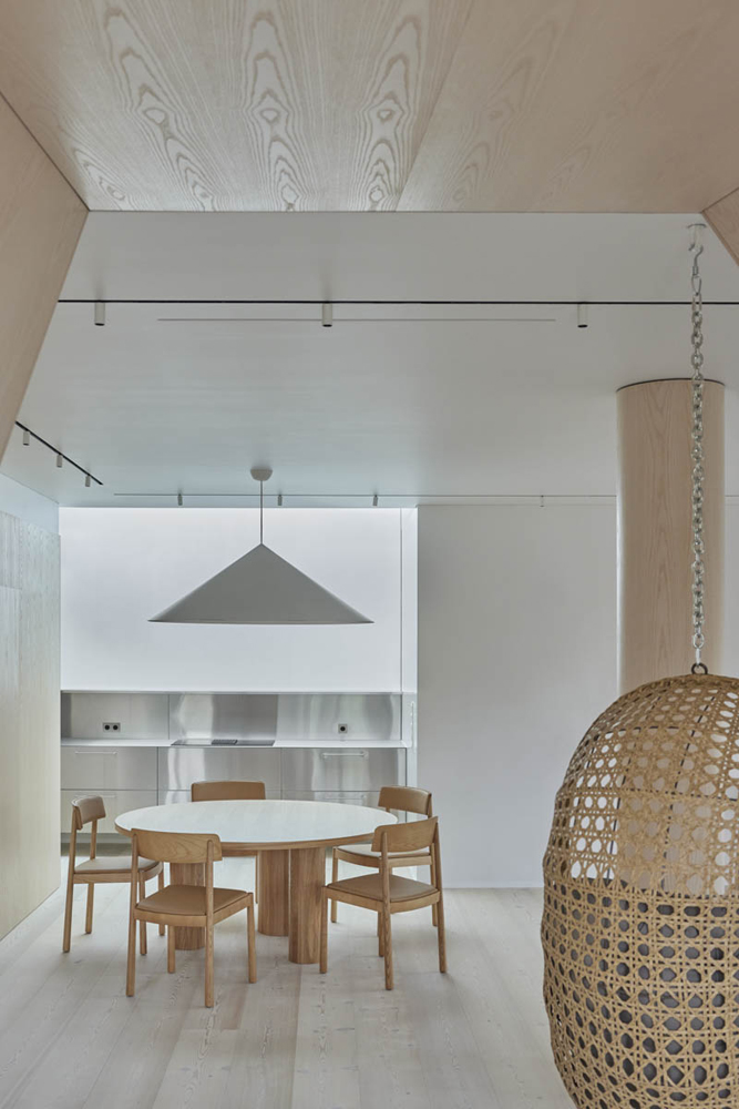 Interjere naudojamos tik tikros medžiagos – natūralus medis, natūralaus akmens terrazzo plytelės, molio tinkas, nerūdijantis plienas. Interjere derinami skirtingų rūšių ir atspalvių medienos paviršiai – grindims naudojamos balinto maumedžio masyvo parketlentės, sienų apdailai naudojamas šviesus uosis, o mediniai baldai pagaminti iš natūralios spalvos ąžuolo.