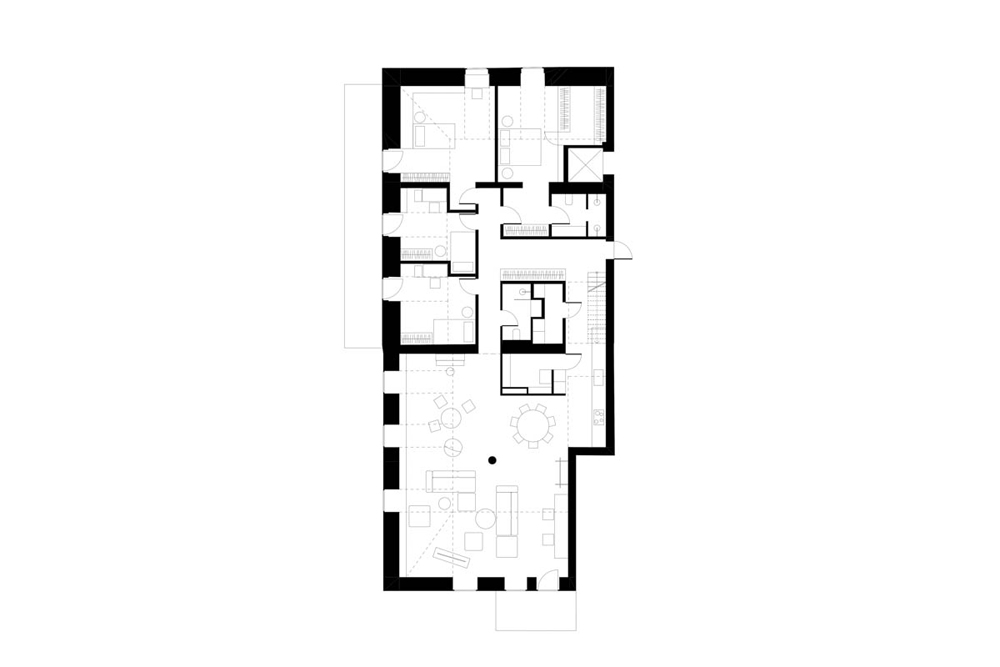 Vos įėjus į butą patenkama į holą, kuriame esantis iš visų pusių apeinamas tūris talpina ūkines funcijas – lauko rūbų spintą, skalbyklą, sandėliuką, WC. Aplink šį tūrį išsidėsčiusios visos pagrindinės buto erdvės – miegamieji, laiptai į stogo terasą, virtuvė, gyvenamasis kambarys.