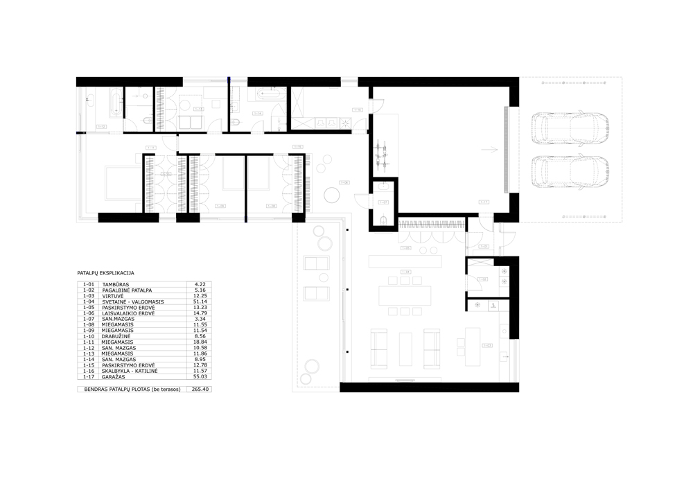 PROGRAMA -– vieno aukšto namas skirtas keturių asmenų šeimai. Pastatas aiškiai suskaidytas į tris funkcines zonas: aktyvi (85 m2), poilsio (120 m2) ir ūkio (60 m2) zonos.