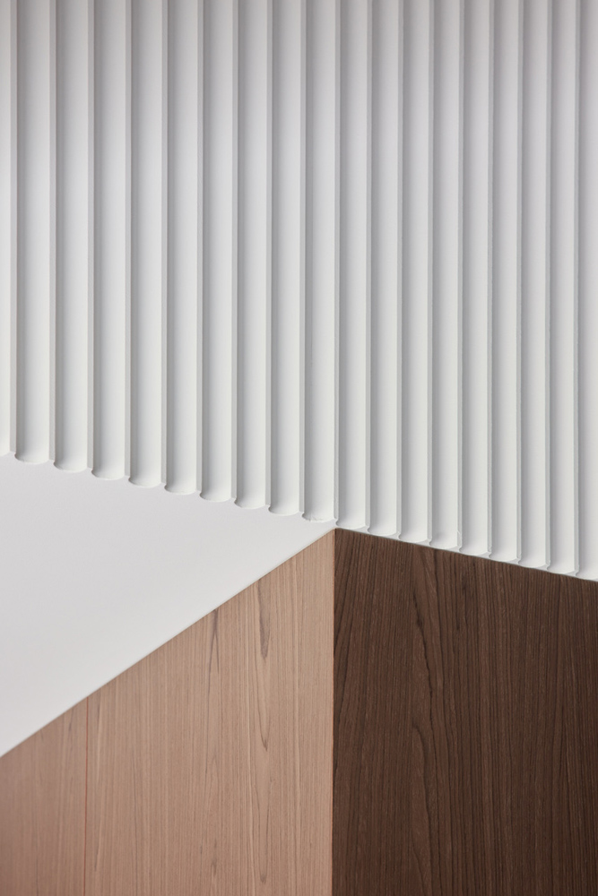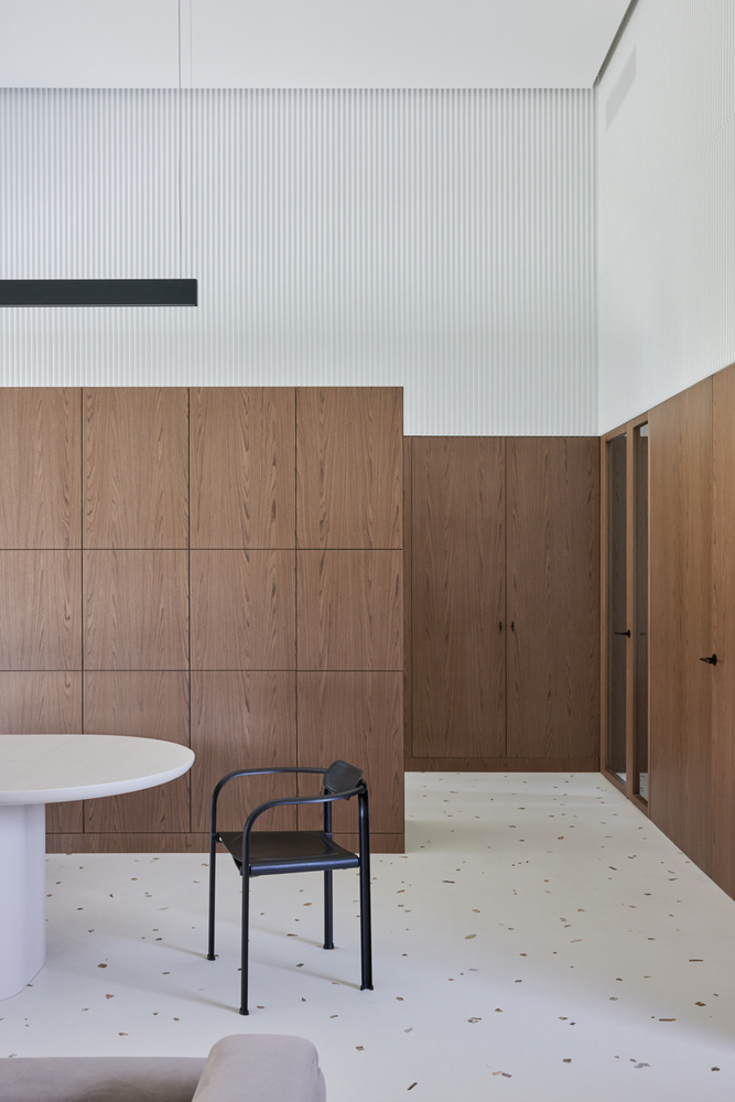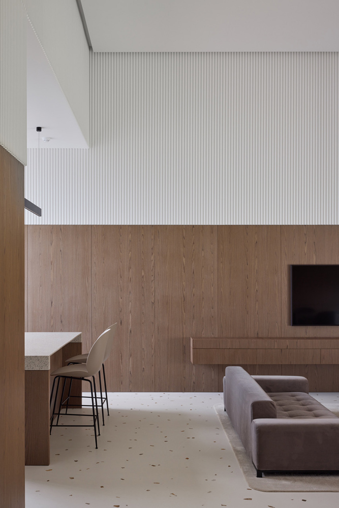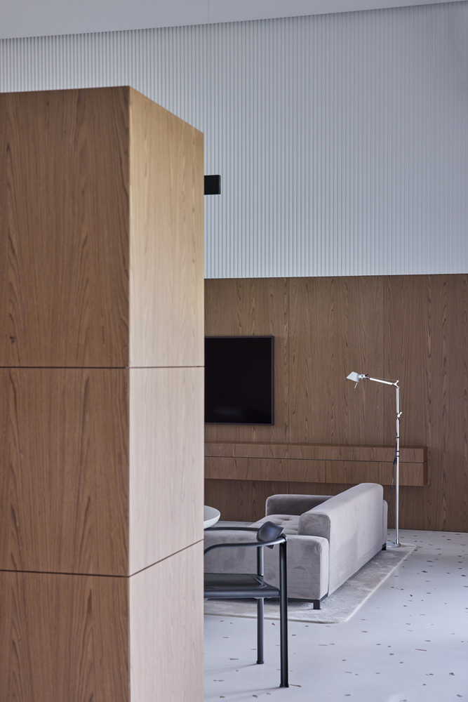 MEDŽIAGOS – panaudotos tik trys pagrindinės medžiagos: poliruotas betonas, natūrali riešuto faneruotė ir dažytas paviršius.
