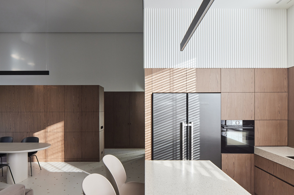 DIZAINO PRIEMONĖS – pagrindinėmis medžiagomis ir sprendimais siekta pabrėžti erdvių geometriją ir išspręsti techninius ar buitinius iššūkius.