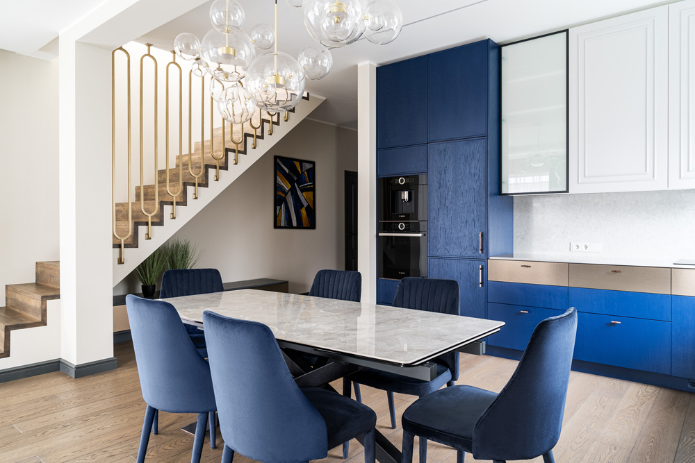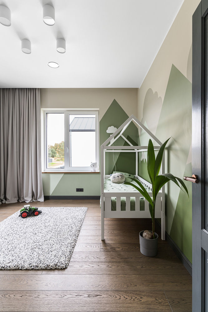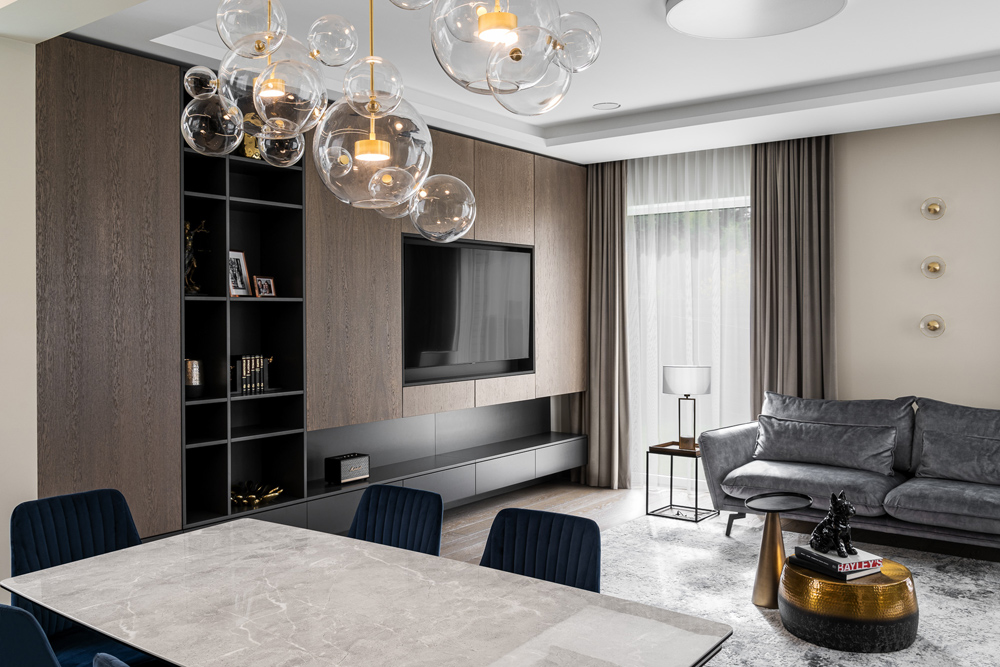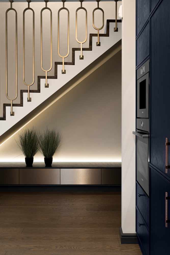 Tai jaunos šeimos namas privačių gyvenamųjų namų kvartale. Gyvenamas plotas apie 130 kv.m. Užsakovai žavėjosi itin klasikiniais interjerais, tačiau pavyko įtikinti lengvesnei klasikinei versijai. Siekėme naudoti natūralias medžiagas – ąžuolo parketlentes, faneruotę korpusiniuose TV baldo ir virtuvės fasaduose, dirbtinio kvarco stalviršius. Interjero koloritas ramus, pilkų, rusvų žemės tonų, kiek drąsesnė nakties mėlyna, panautota virtuvėje.