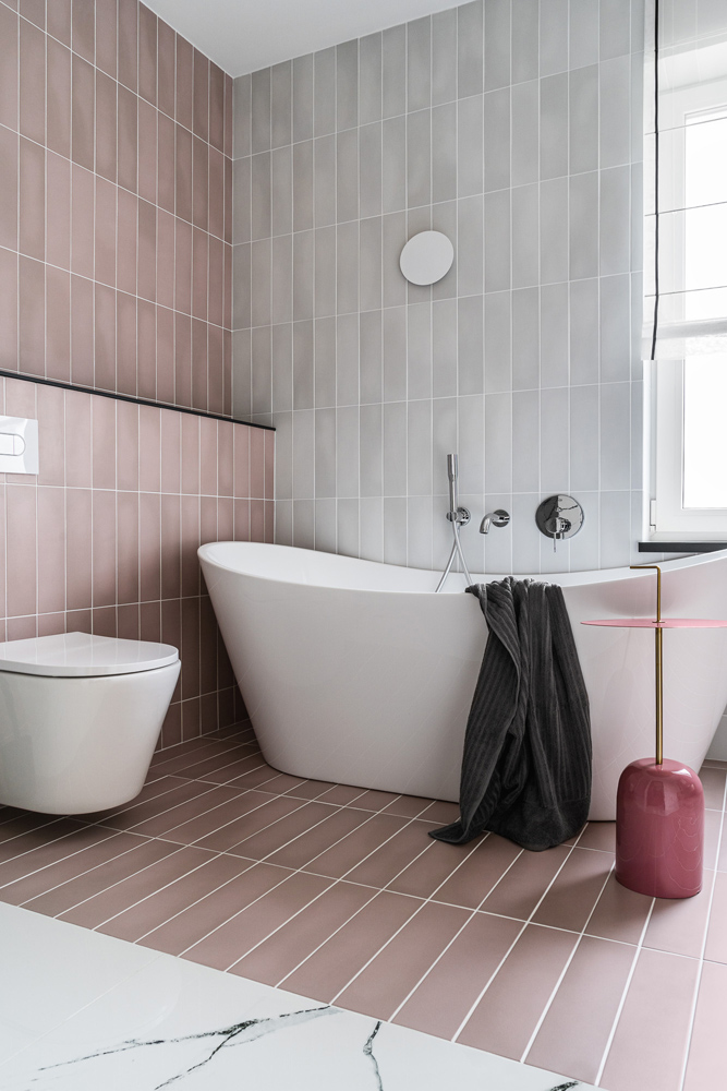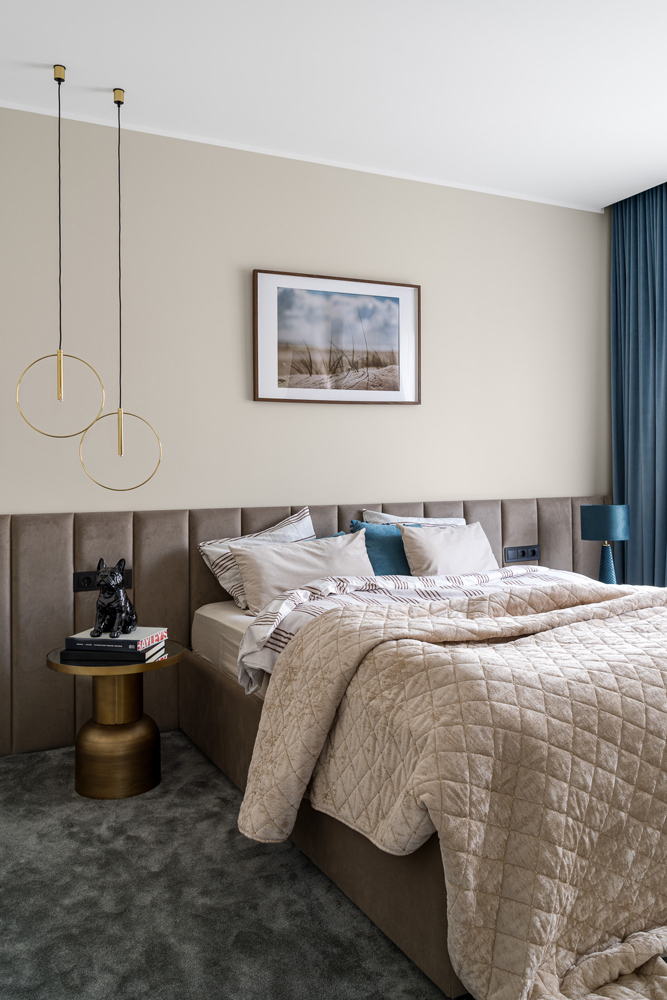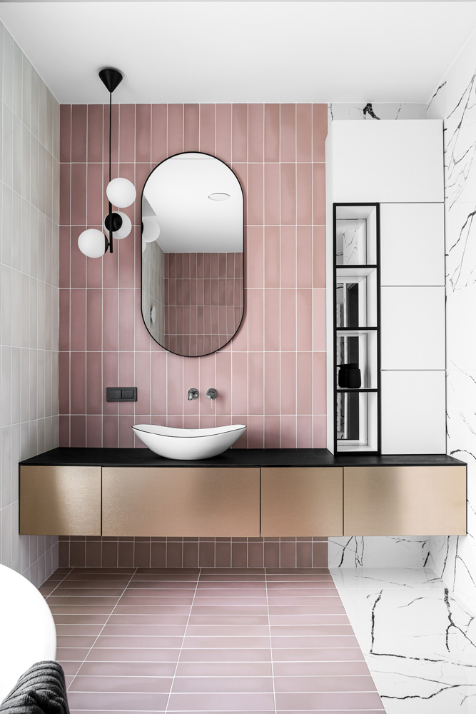 Prabangos įspūdį kuria vario ir aukso spalvos elementai – rankenėlės, šviestuvai, staliukai, šiai erdvei projektuoti šlifuoto aukso spalvos laiptų turėklai. Antrame aukšte privatiems kambariams skirta vonia, išsiskiria pudros rožine spalva, kurią derinome su stilizuoto marmuro rašto plytelėm. Nors bendras namų įspūdis gana puošnus, tačiau, kuriamas detalėmis. Funkciniai sprendiniai patogūs kasdieniame šeimos gyvenime ir skirti mėgautis namais.