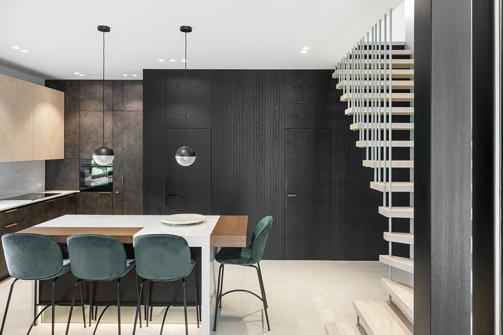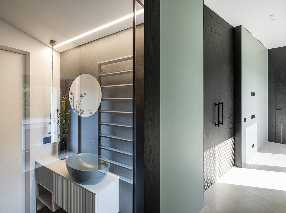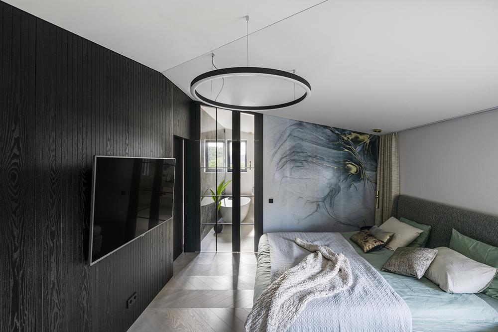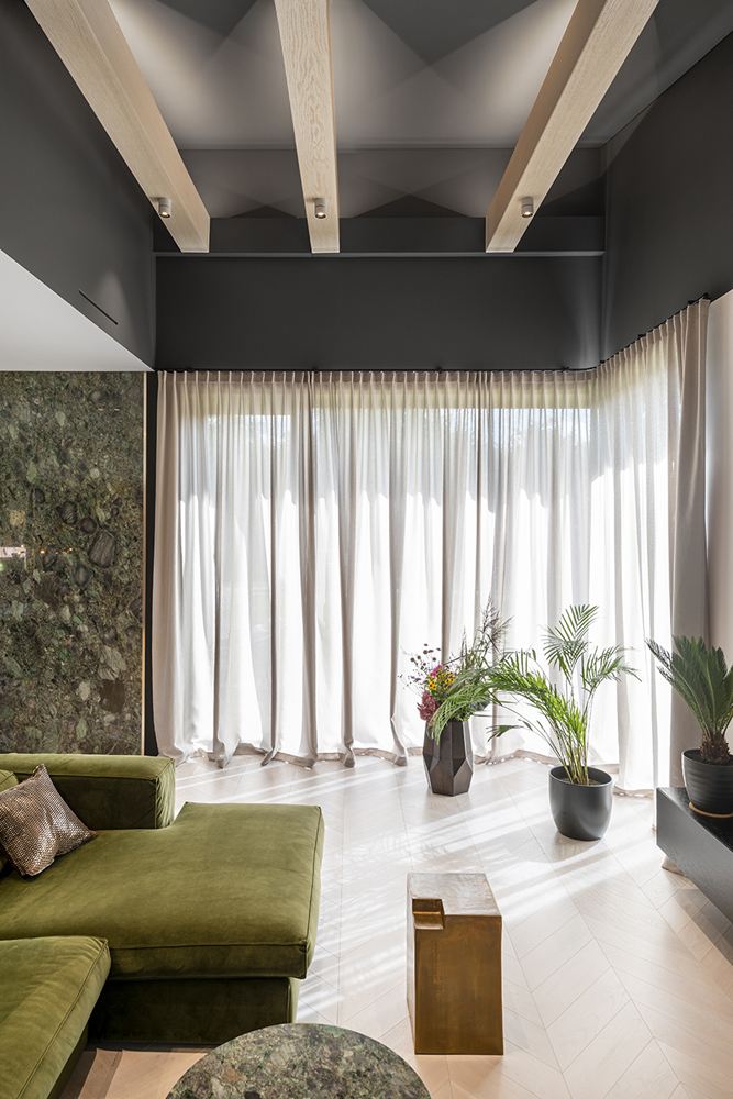 Interjeras kurtas vadovaujantis pagrindiniu principu, kad tai namai kur susitinka miestas su menu, taip pat ypatingą dėmesį kreipiant į kontekstą, kad butas randasi istoriniame Romerio name. Užsakovų pageidavimas sukurti šiek tiek bohemišką, savo charakterį turintį, išskirtinį interjerą, diktavo dizaino sprendimus. Tam pasitelkiamos sodrios spalvos detalėms, lenktų formų siluetai. Atsižvelgiant į kontekstą, kad tai senamiestis ir butas randasi istoriniame pastate, nenutolstama nuo klasikiniams interjeras būdingų elementų: bagetų, klasikinių lubinių dekorų, aukštų klasikinių durų. Atsižvelgiant į tai, kad interjeras kuriamas šiuolaikiniam moderniam žmogui, klasikos elementai pinasi su moderniais sprendimais, klasikiniai elementai pateikiami su nauju požiūriu.
